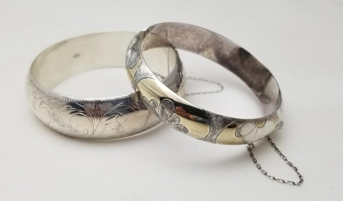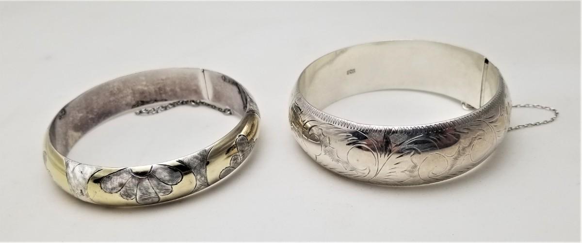 Two nice Sterling Silver bangle bracelets. Both will fit up to an 8-9" wrist. Smaller is .25" wide, larger is 1" wide. Both have safety chains. Good condition.
