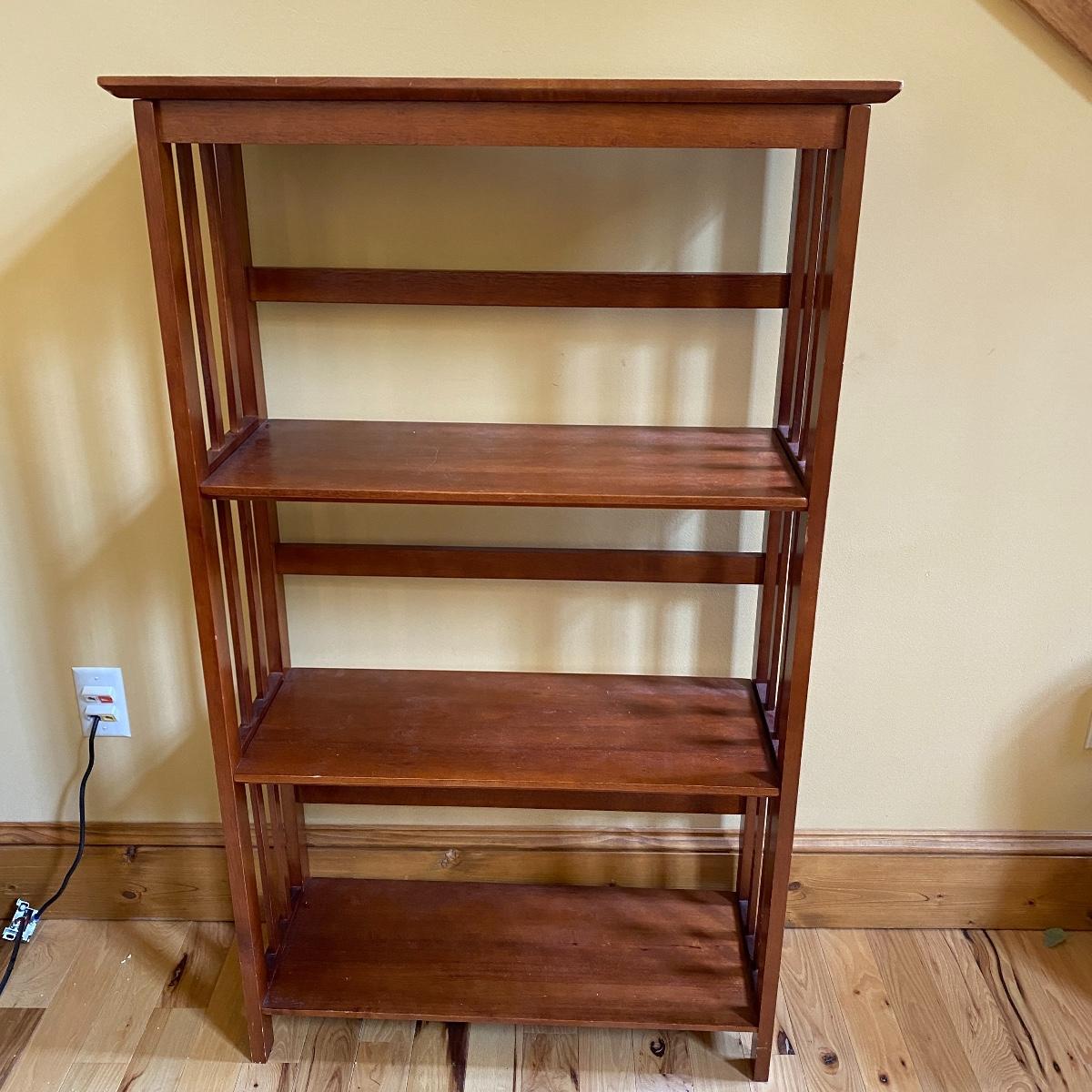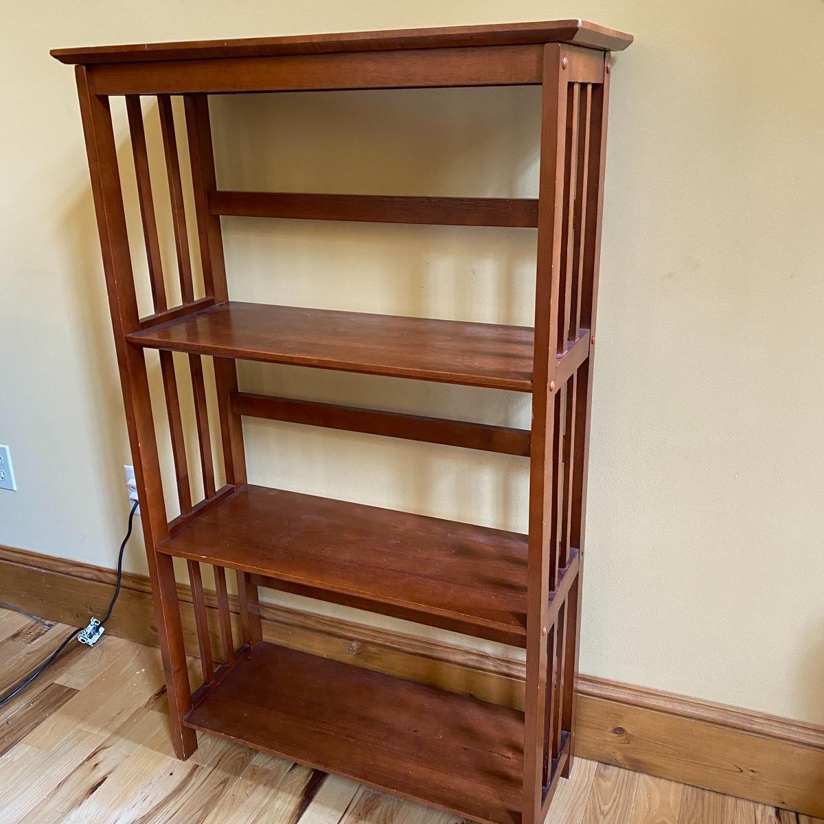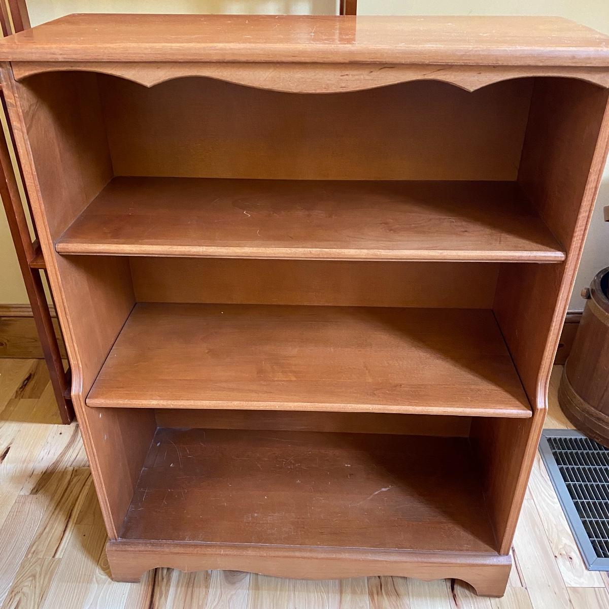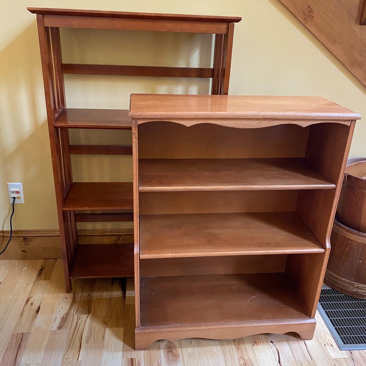 Take your pick with these bookcases. The taller bookcase measures 29.5” x 12” x 49” tall. There are no adjustable shelves. It is a cherry wood colored mission style. The shorter bookshelf measures 30” x 11.5” x 38.5” tall. It has a nice scalloped detail along its' front edges; the bottom shelf is adjustable. You may want to refinish this one to hide the scratches or you can just throw some books on the shelves and it’s good as new! Both are nice solid wood. Local pick up only.