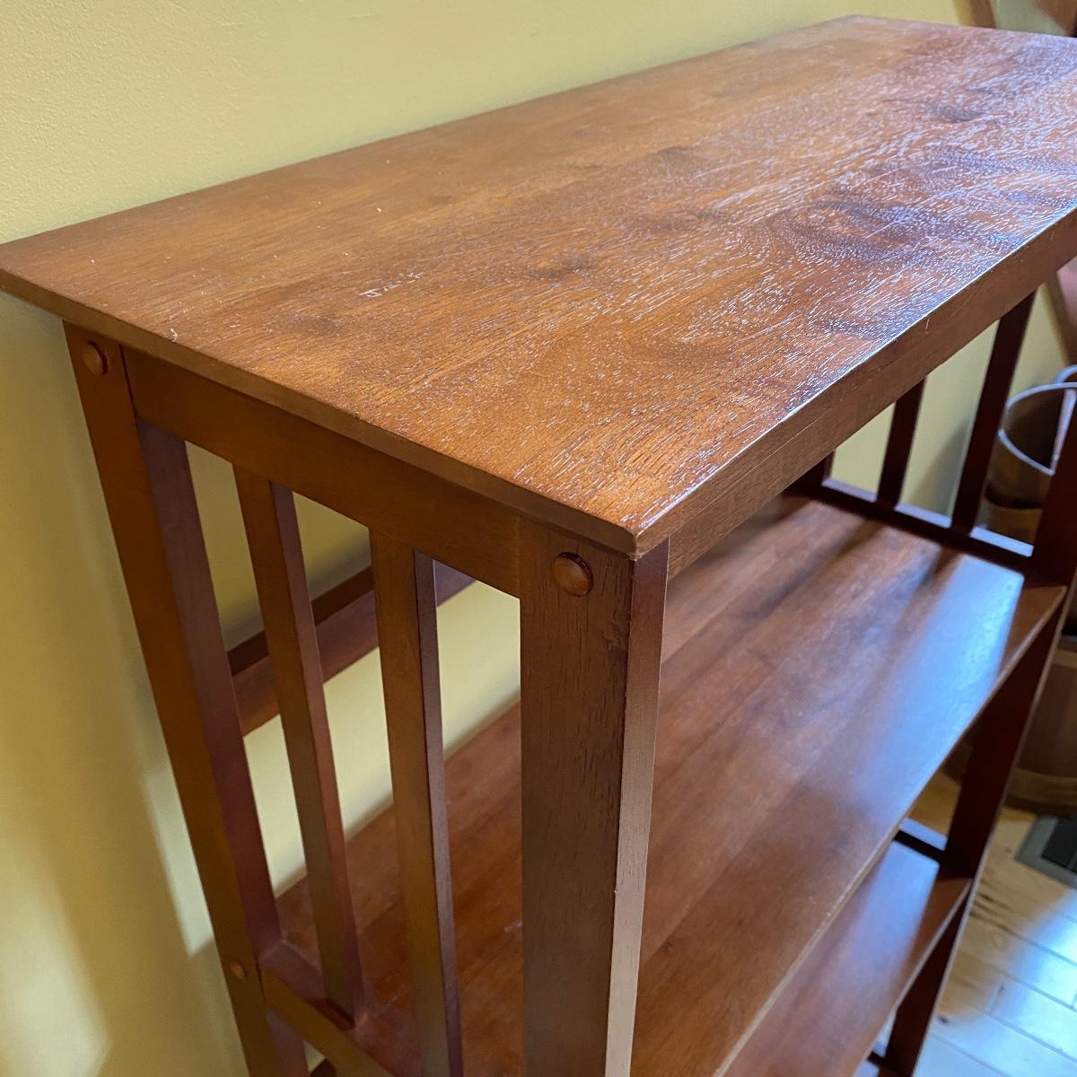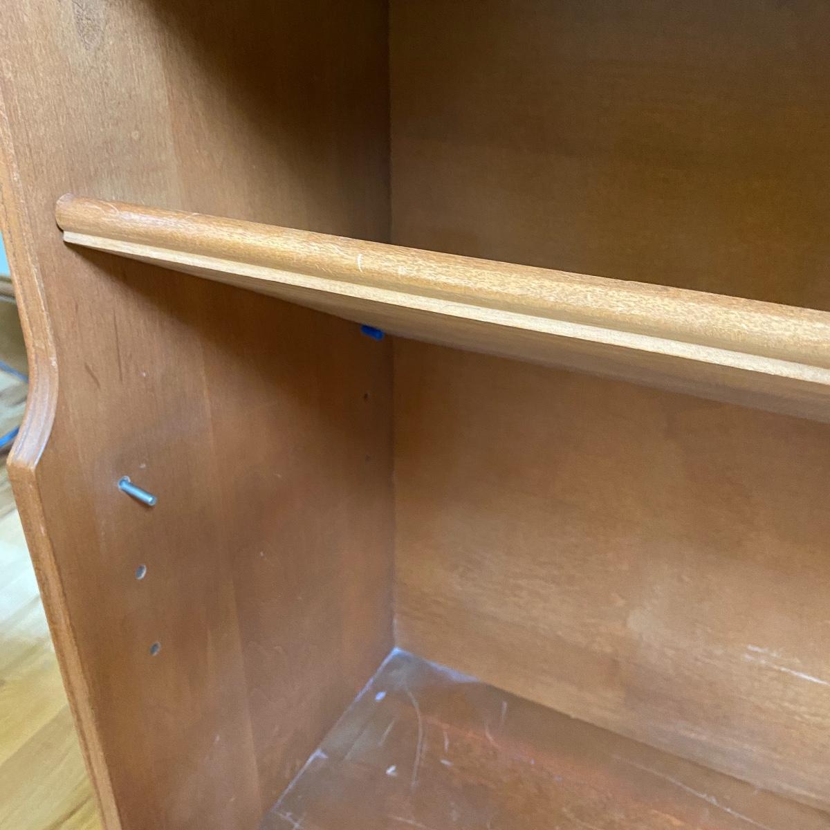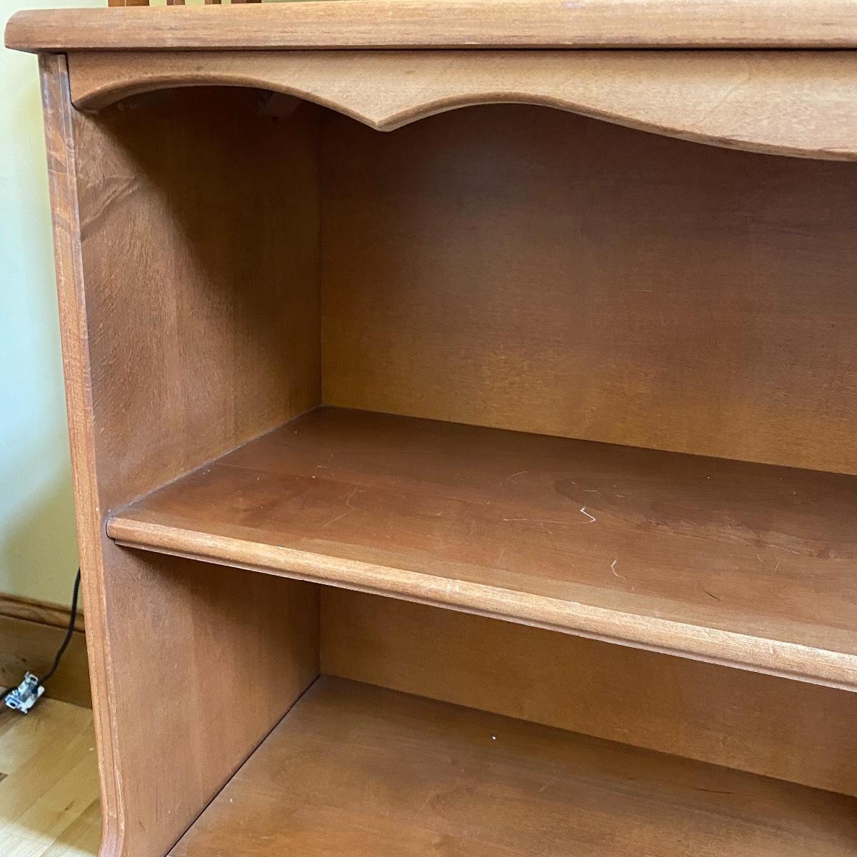 Take your pick with these bookcases. The taller bookcase measures 29.5” x 12” x 49” tall. There are no adjustable shelves. It is a cherry wood colored mission style. The shorter bookshelf measures 30” x 11.5” x 38.5” tall. It has a nice scalloped detail along its' front edges; the bottom shelf is adjustable. You may want to refinish this one to hide the scratches or you can just throw some books on the shelves and it’s good as new! Both are nice solid wood. Local pick up only.