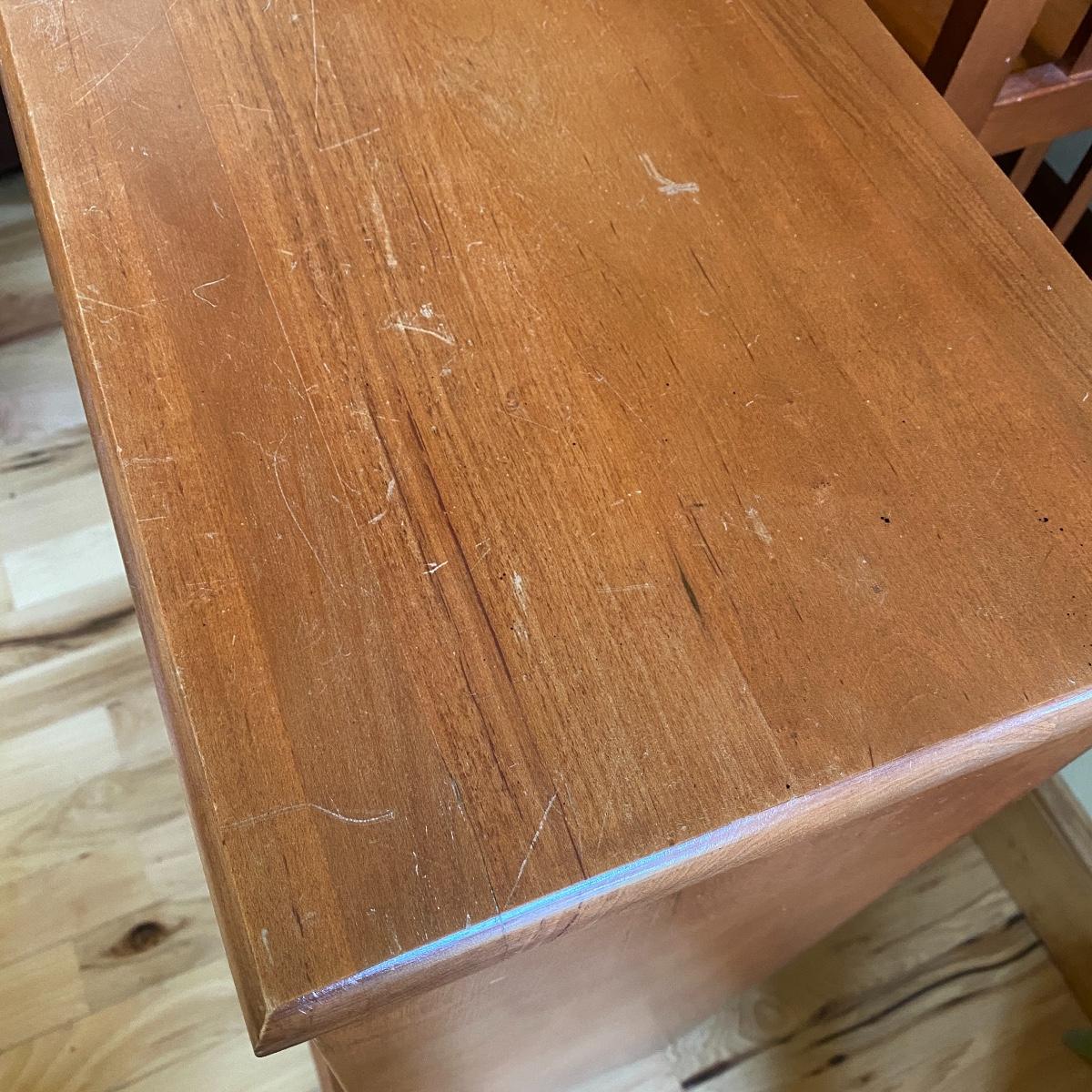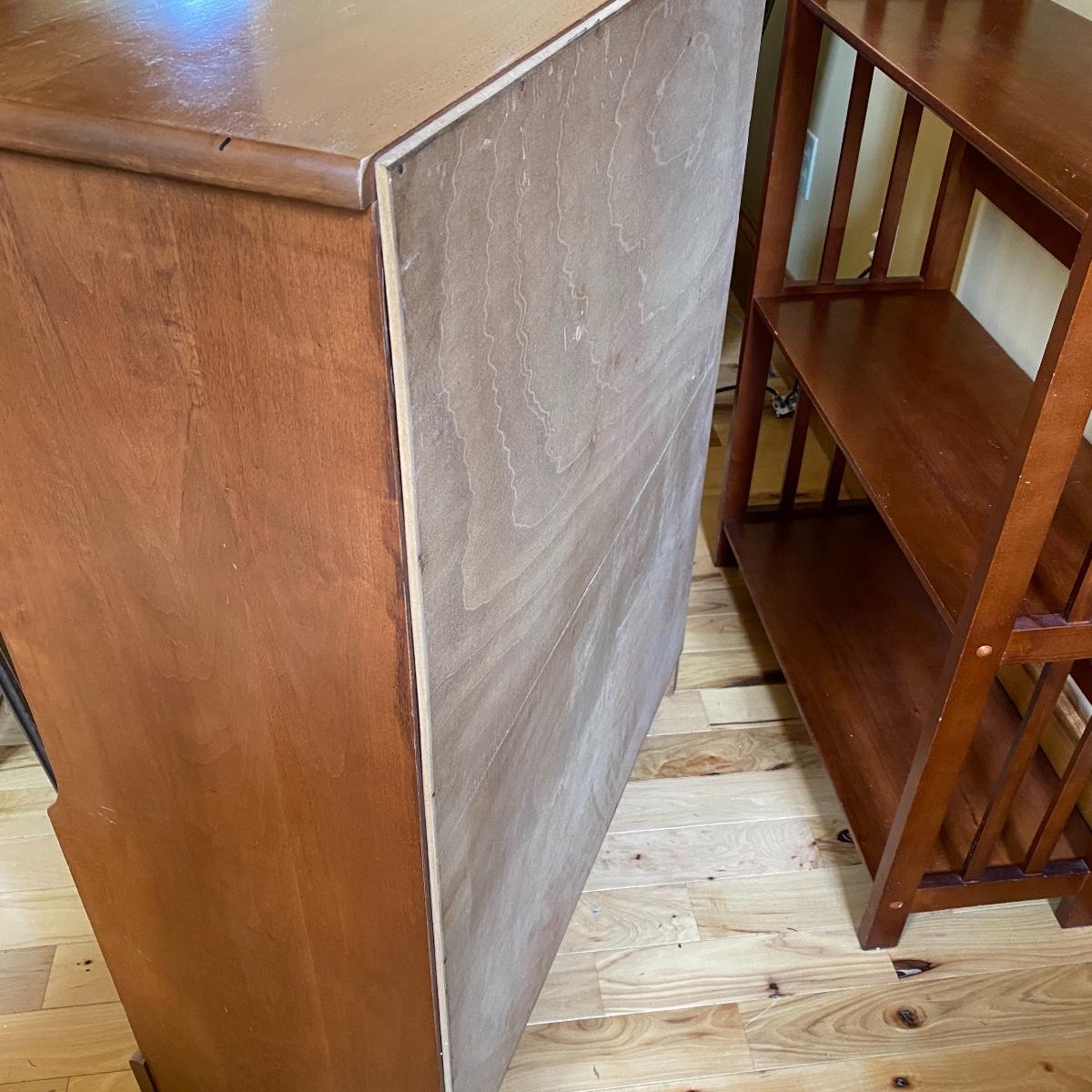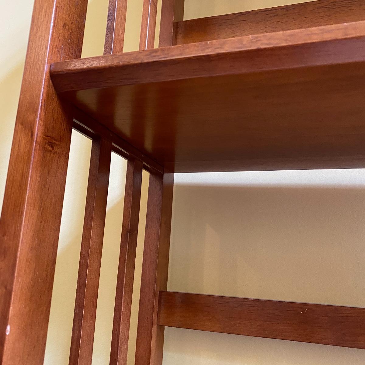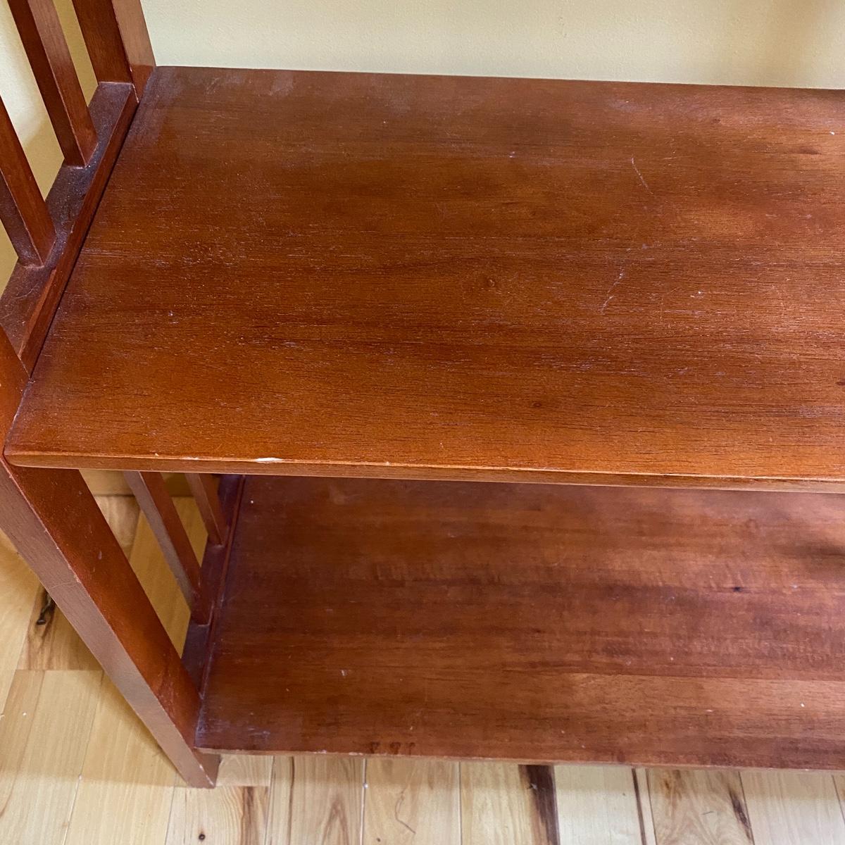 Take your pick with these bookcases. The taller bookcase measures 29.5” x 12” x 49” tall. There are no adjustable shelves. It is a cherry wood colored mission style. The shorter bookshelf measures 30” x 11.5” x 38.5” tall. It has a nice scalloped detail along its' front edges; the bottom shelf is adjustable. You may want to refinish this one to hide the scratches or you can just throw some books on the shelves and it’s good as new! Both are nice solid wood. Local pick up only.