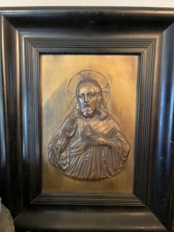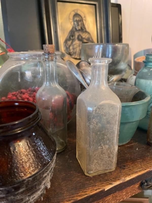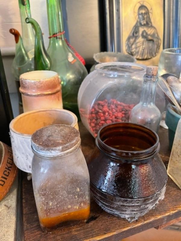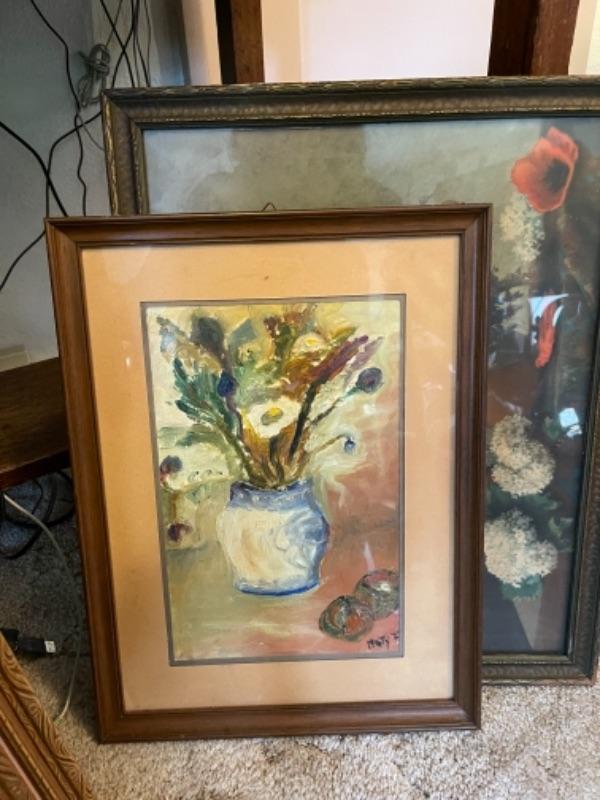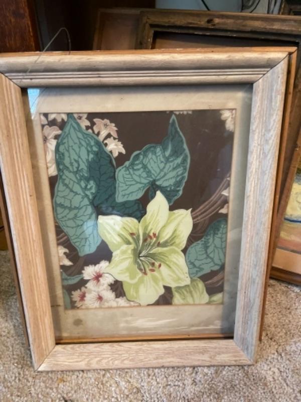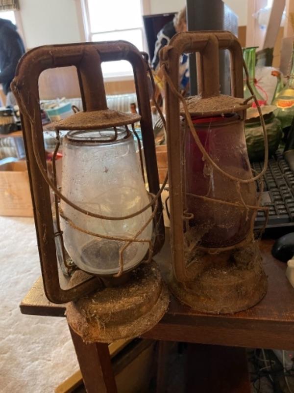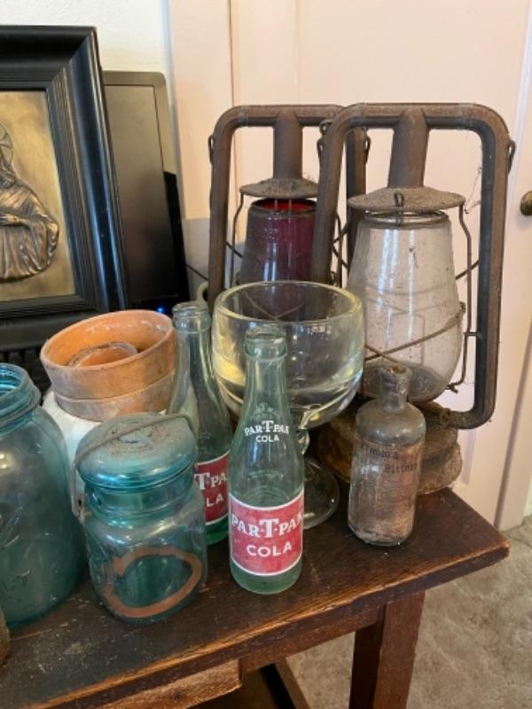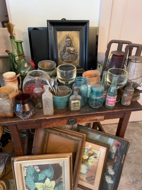 Lot 141. Vintage jars, framed art, two railroad lanterns, religious art, several prints--Was $45 - -Now $30