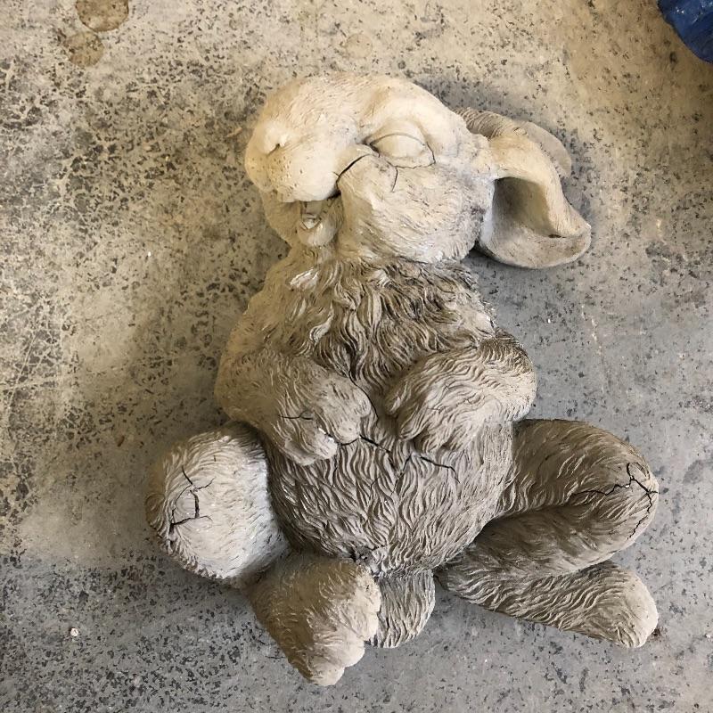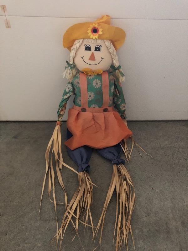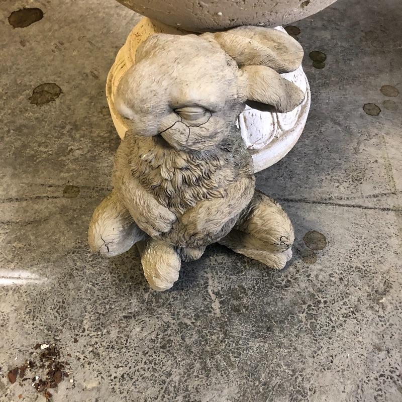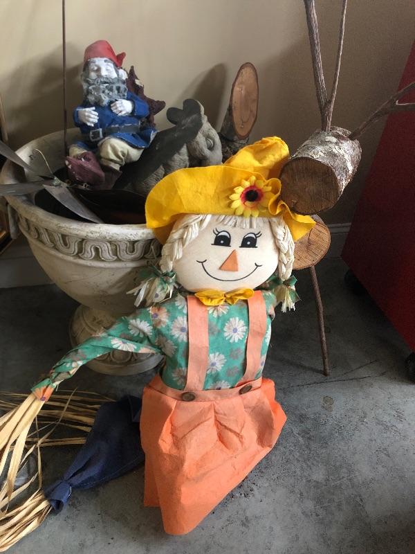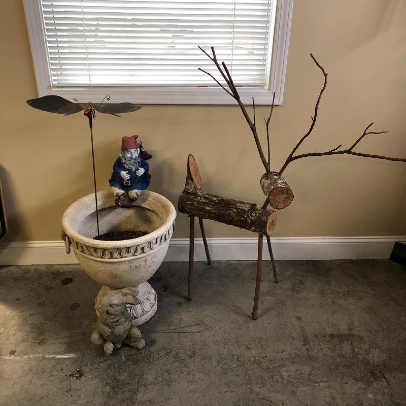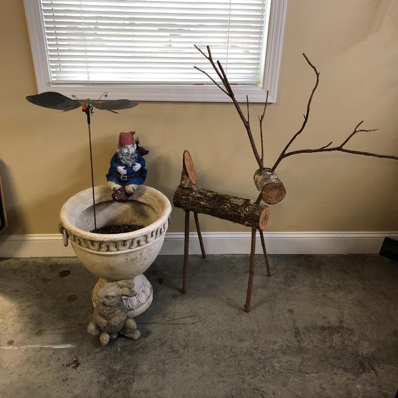 Add style to your garden with this array of outdoor art. Lot includes deer, scarecrow, gnome and bunny made from resin, copper butterfly and a resin plant pot. Plant pot measures 17.5”D x 19.5” tall.
