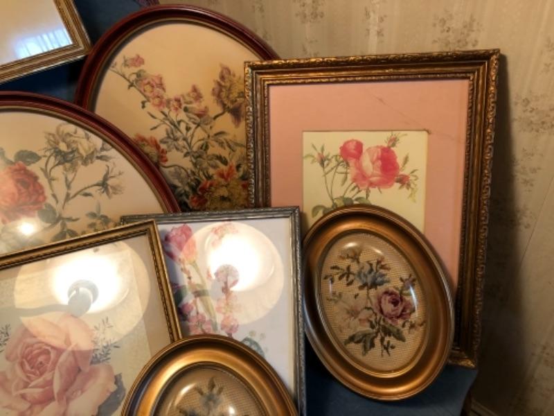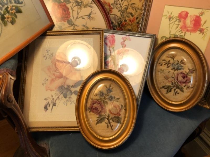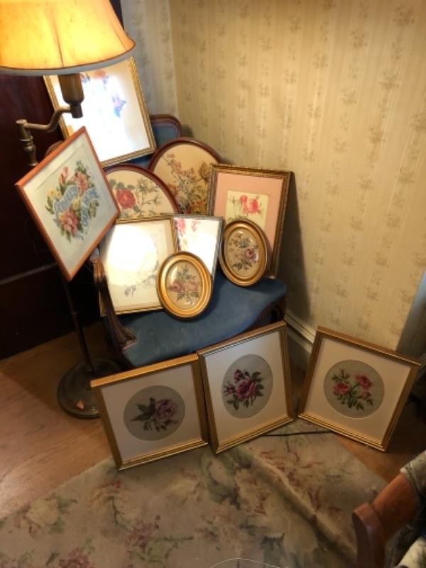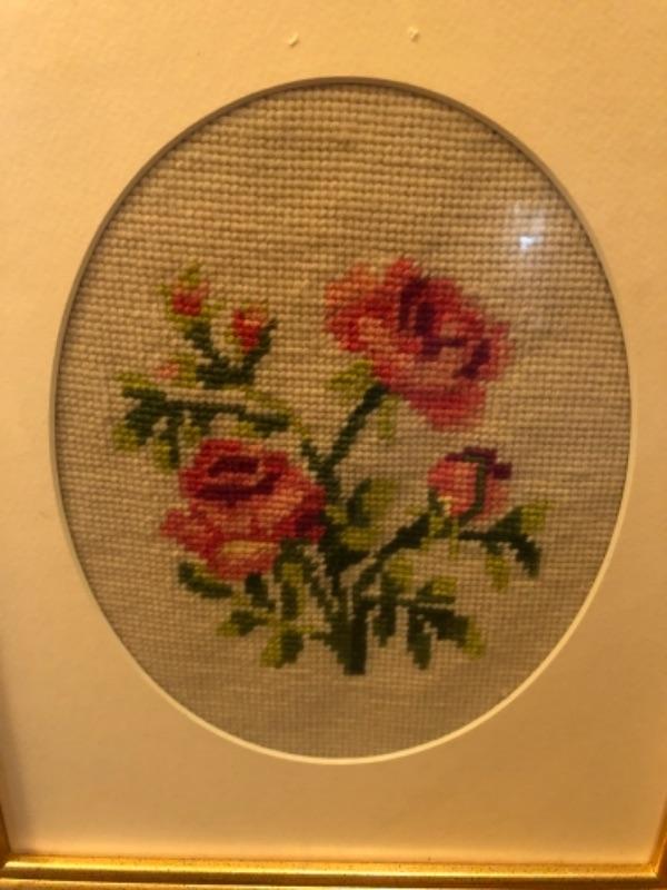 Lot 141F. Vintage framed botanical prints and needlepoint--Was $150 “”NOW $75