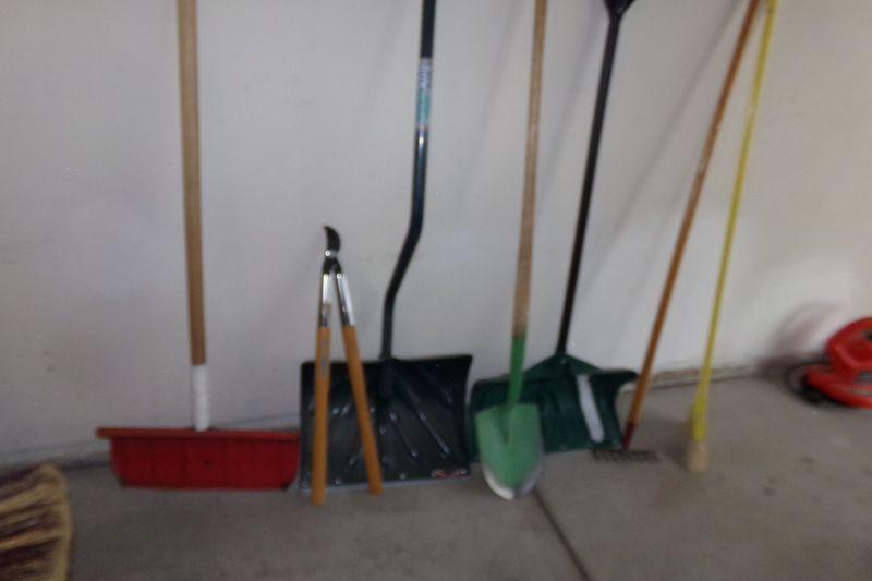 SNOW SHOVELS, SHOVELS, LOPERS, PLUNGER, SQUEEGEE AND TRASH CAN (HOSE NOT INCLUDED)
