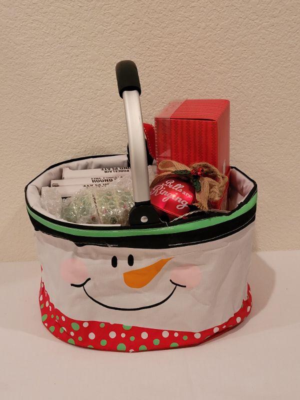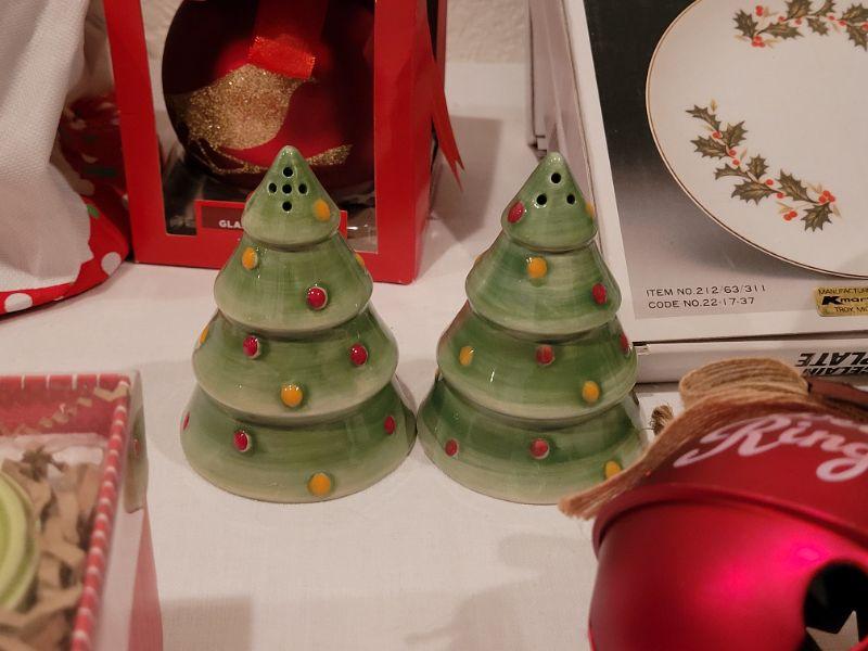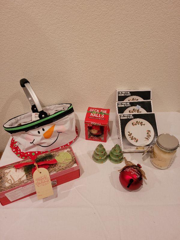 Lot 142: NEW Hallmark Snowman Collapsible Basket,  Candle, (3) Holiday Plates, Macy's Christmas Tree Salt & Pepper, Handpainted Ornament,  Bell and Cookie Stamps