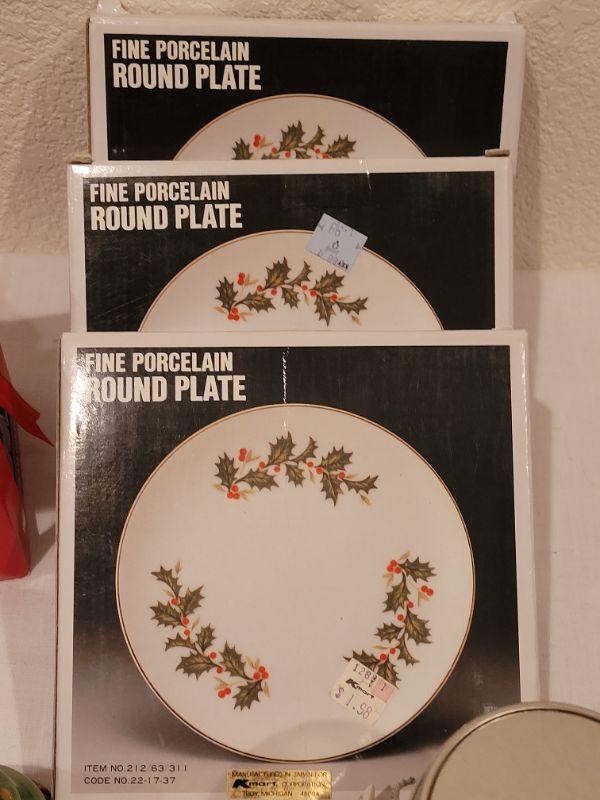 Lot 142: NEW Hallmark Snowman Collapsible Basket, Candle, (3) Holiday Plates, Macy's Christmas Tree Salt & Pepper, Handpainted Ornament, Bell and Cookie Stamps