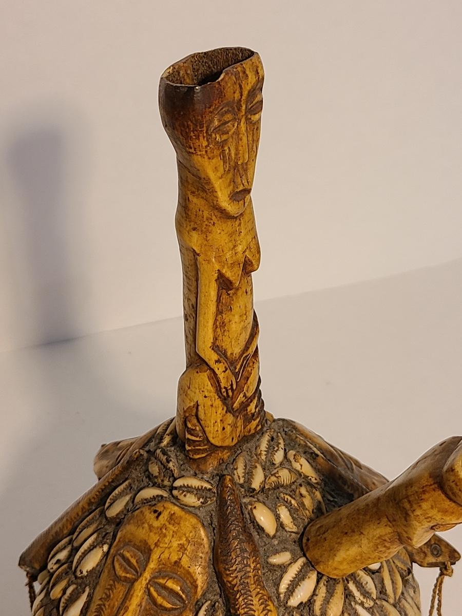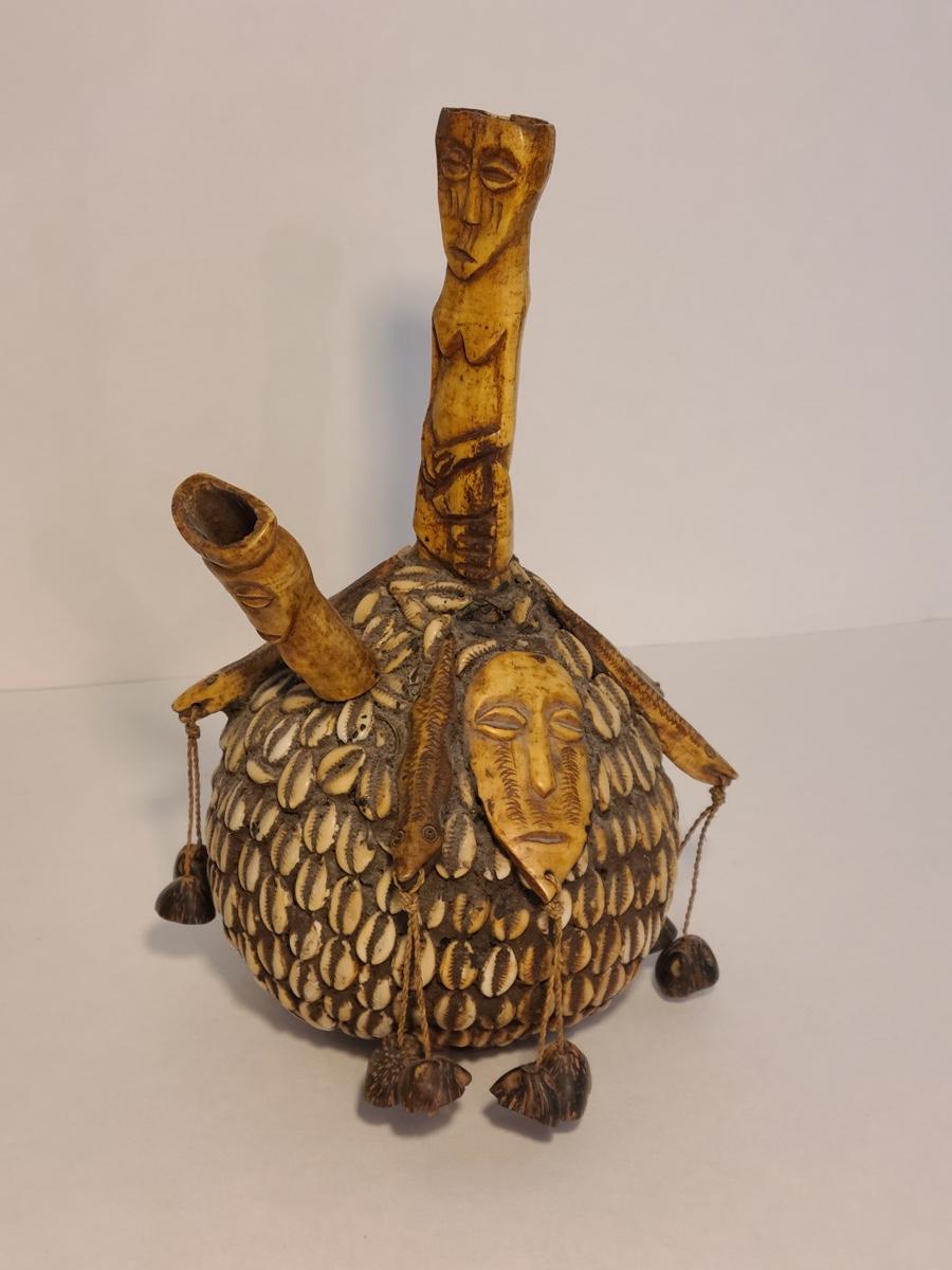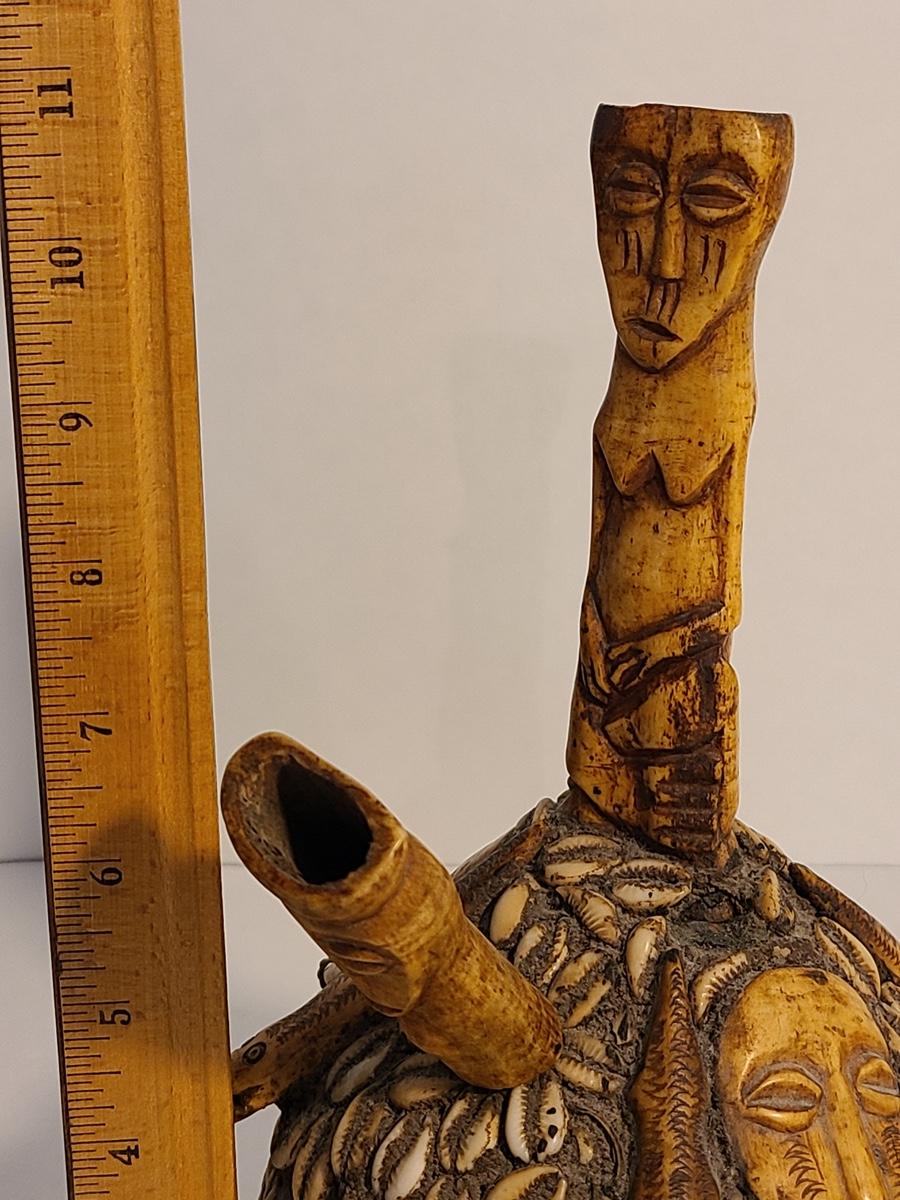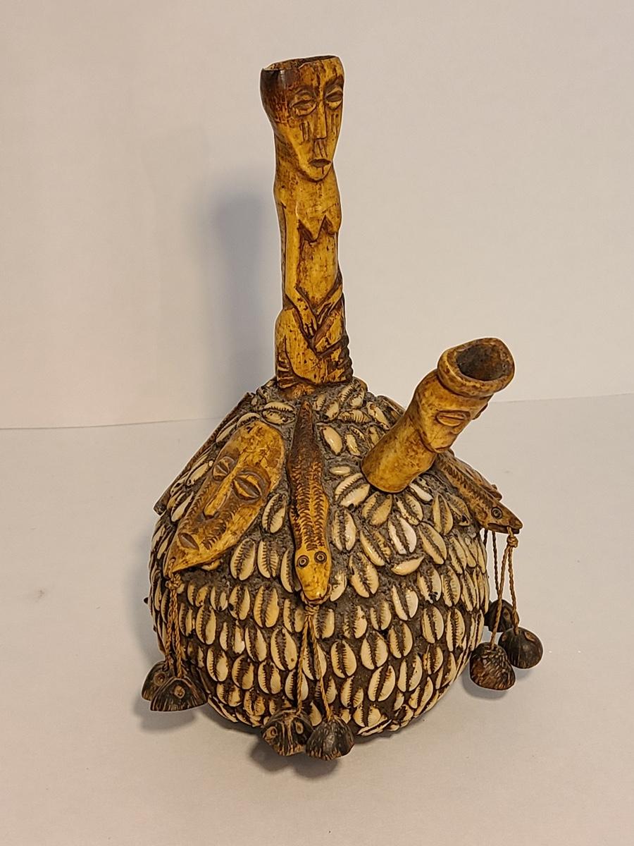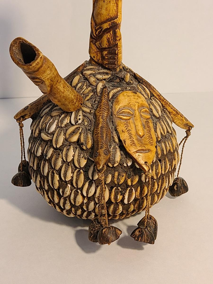 This unique item is most likely a vintage water bottle or form of water pipe made in Africa, out of mud, bone, and shells. Designed with a body on top, faces and snakes on side. Most likely the central part is a gourd. Only two others found on line for reference. Please see all pictures as they are the best representation of the items. The pictures show condition, measurements if taken, and what is included in the lot. Due to the large amount that we photograph and the time frame, we are not always able to take measurements. All items unless noted, are pre-owned and have been used. If you purchased furniture, you must bring help. We do not allow one person to carry large furniture out on their own. Bring help, tools and a truck for the safety of our client’s homes, and your personal safety. Company policy. Thank you.