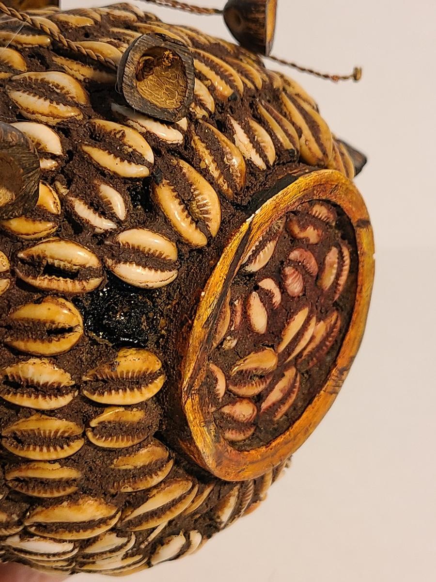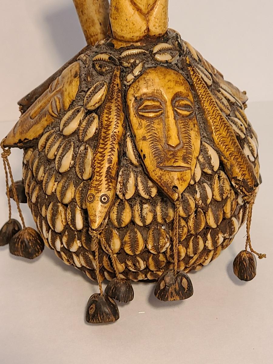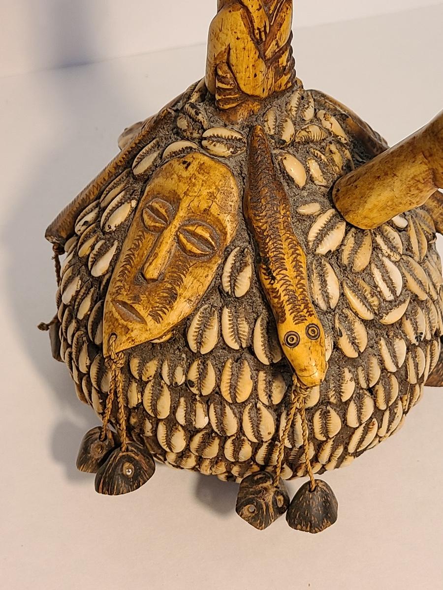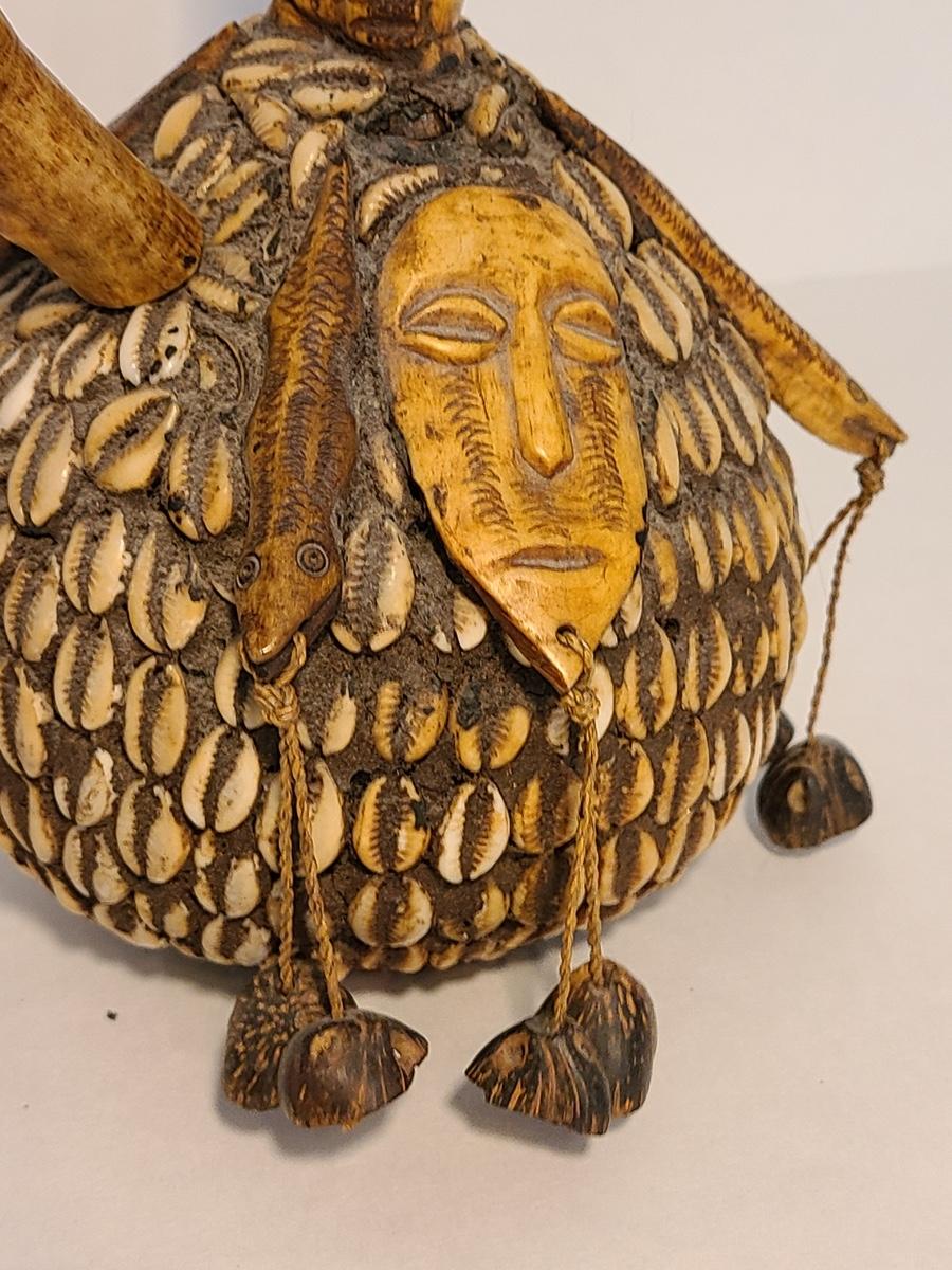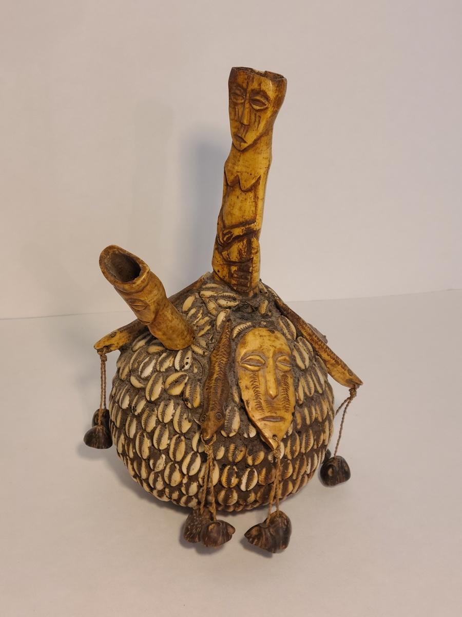 This unique item is most likely a vintage water bottle or form of water pipe made in Africa, out of mud, bone, and shells. Designed with a body on top, faces and snakes on side. Most likely the central part is a gourd. Only two others found on line for reference. Please see all pictures as they are the best representation of the items. The pictures show condition, measurements if taken, and what is included in the lot. Due to the large amount that we photograph and the time frame, we are not always able to take measurements. All items unless noted, are pre-owned and have been used. If you purchased furniture, you must bring help. We do not allow one person to carry large furniture out on their own. Bring help, tools and a truck for the safety of our client’s homes, and your personal safety. Company policy. Thank you.
