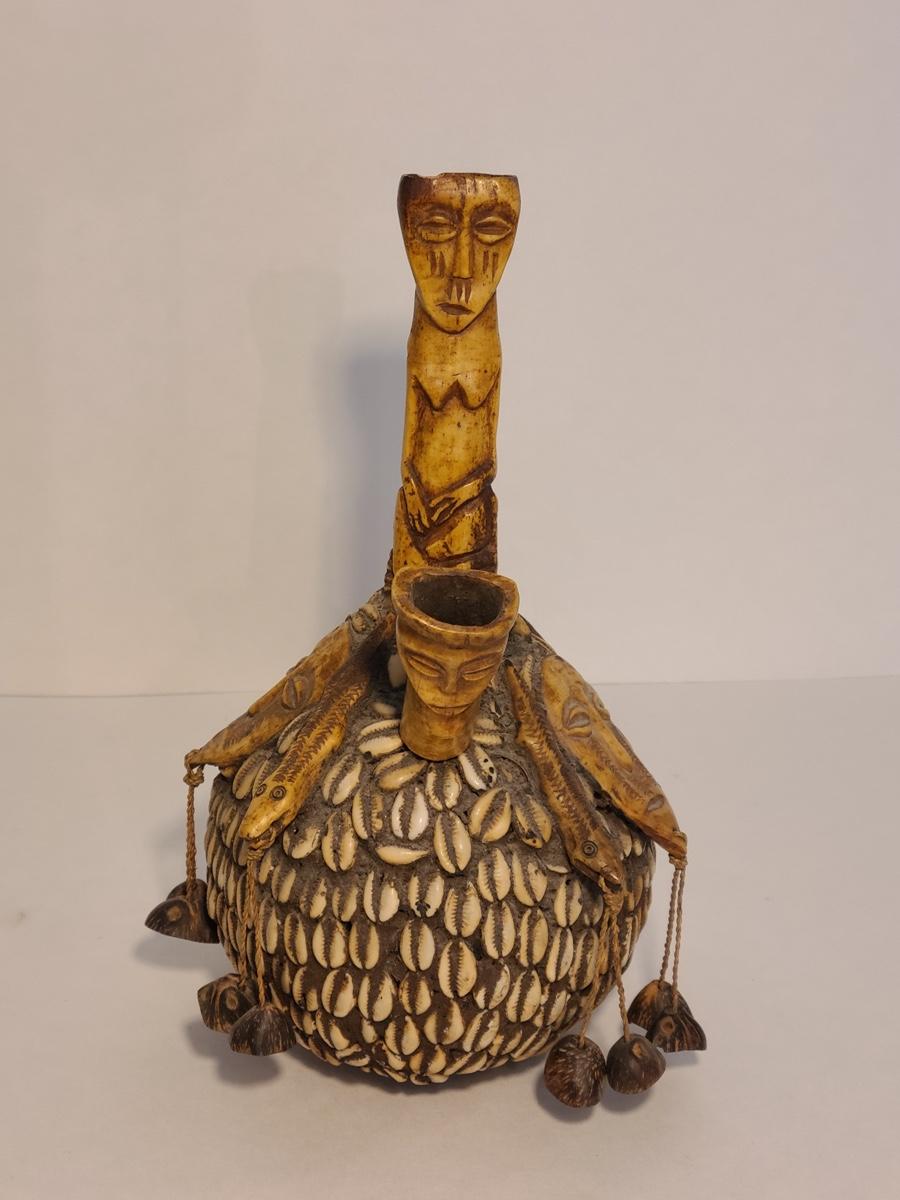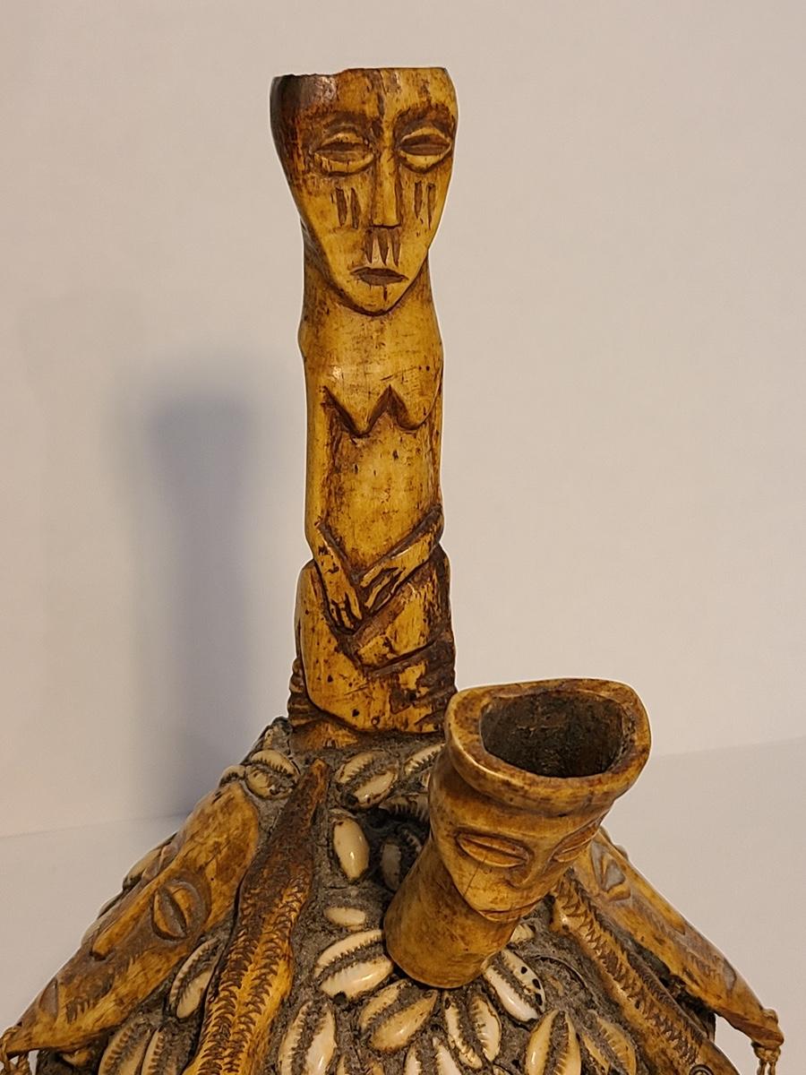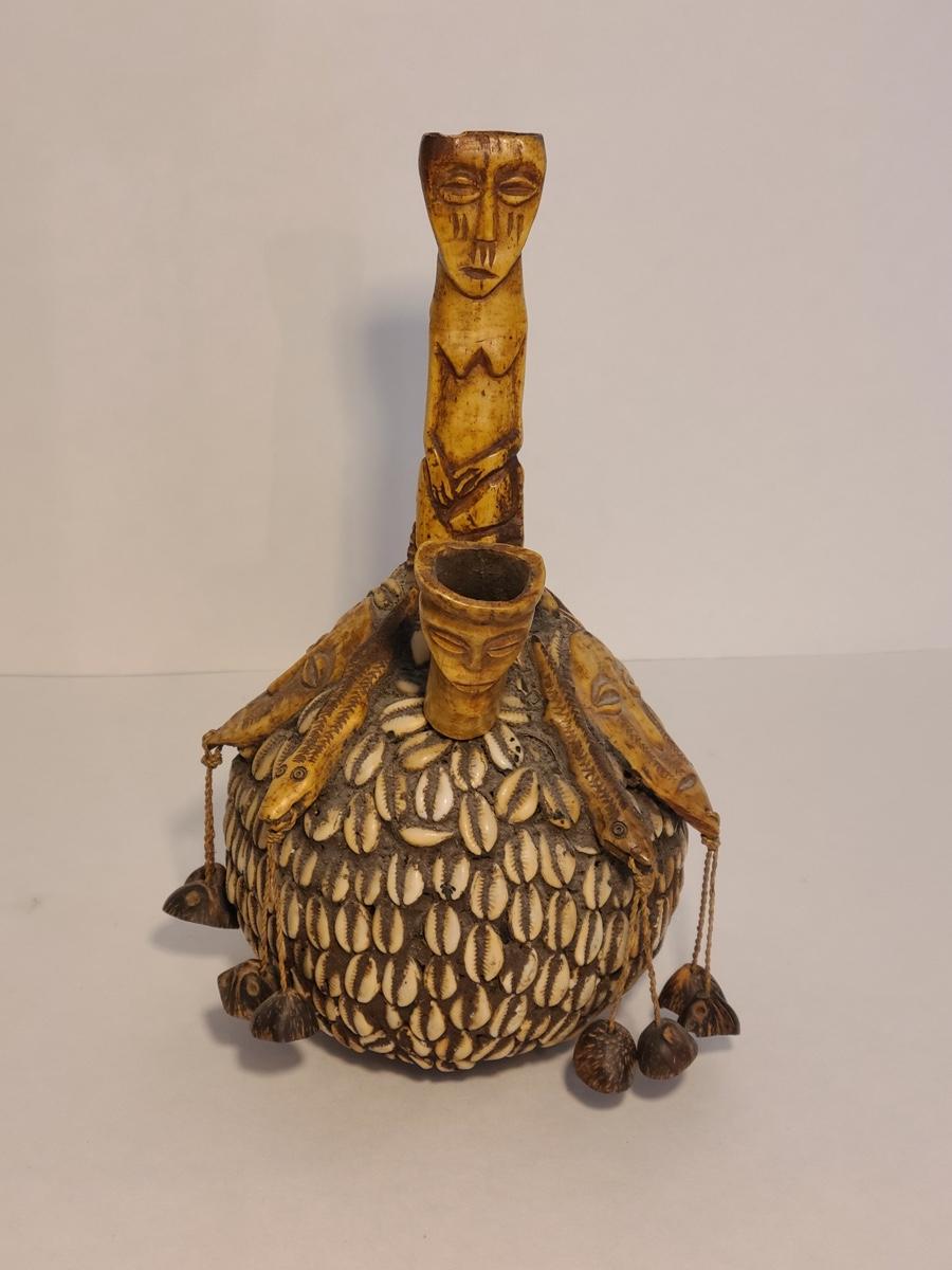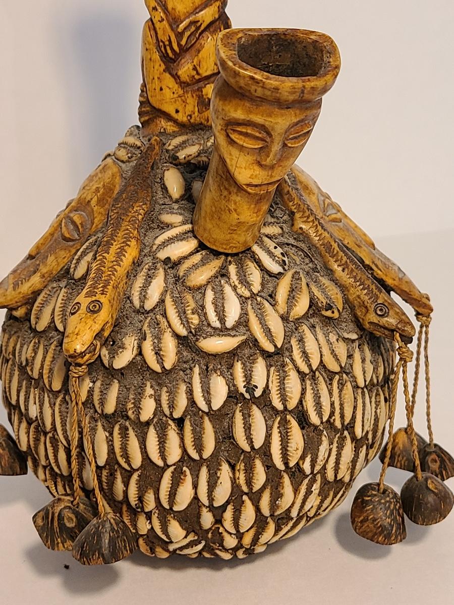 Lot 142: Vintage African Mud/Bone/Shell Water Bottle/Pipe (Snakes & Face Motif)