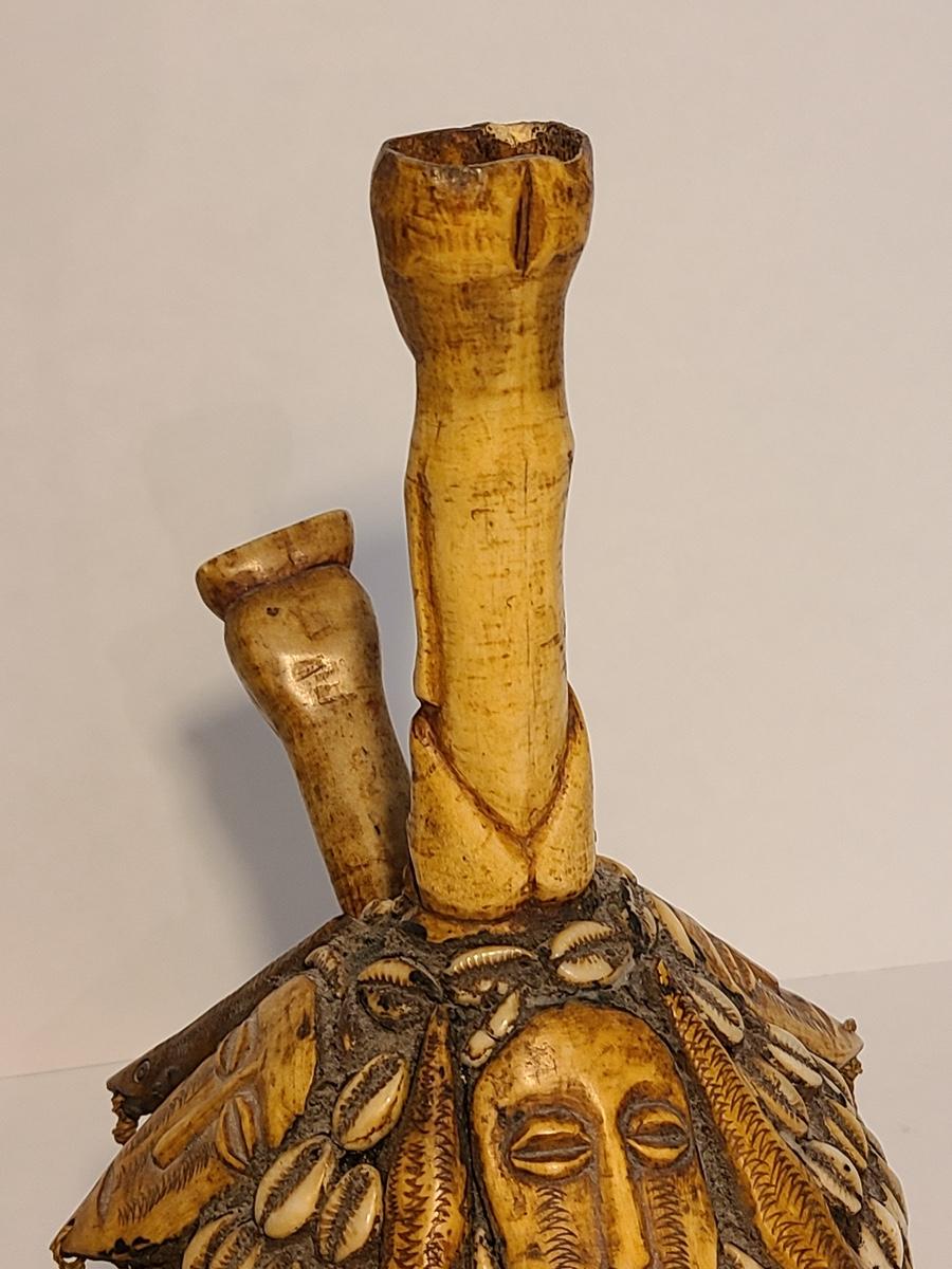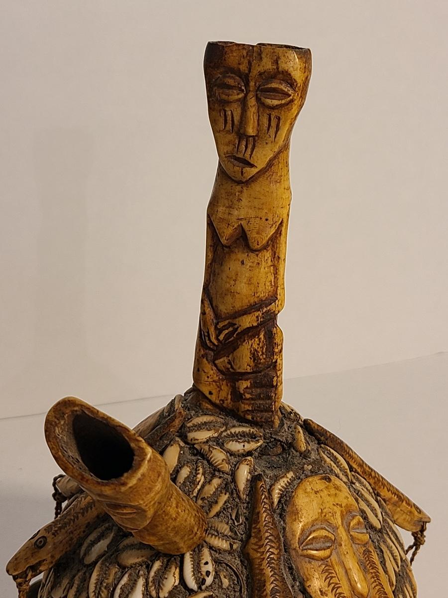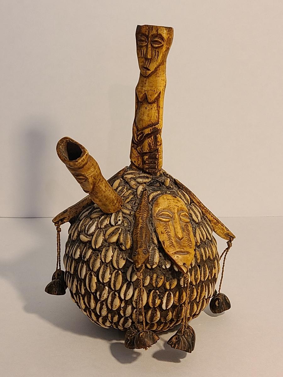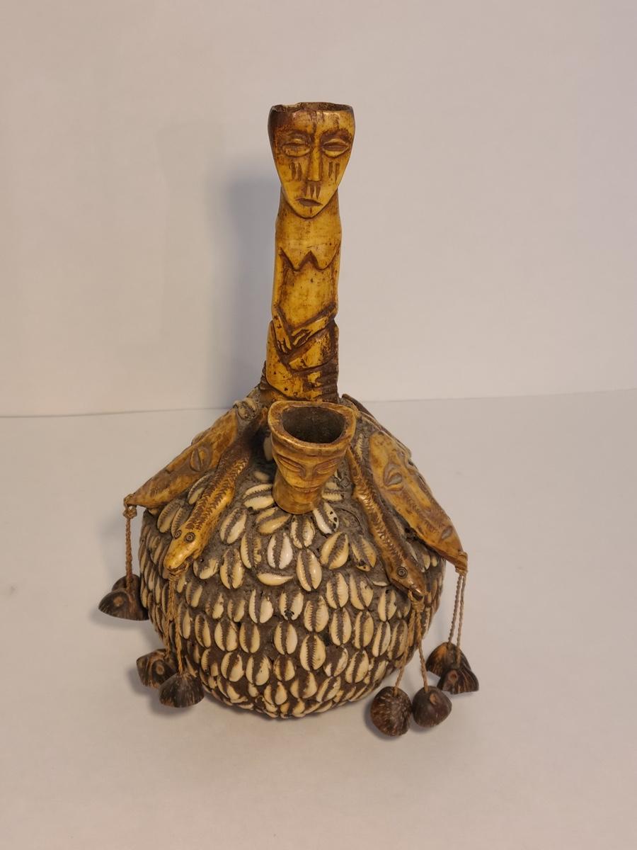 Lot 142: Vintage African Mud/Bone/Shell Water Bottle/Pipe (Snakes & Face Motif)