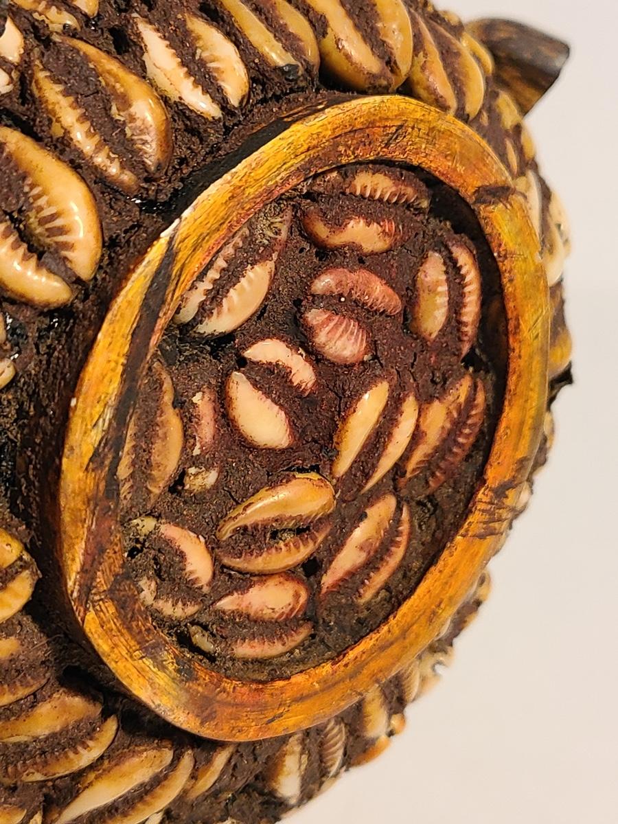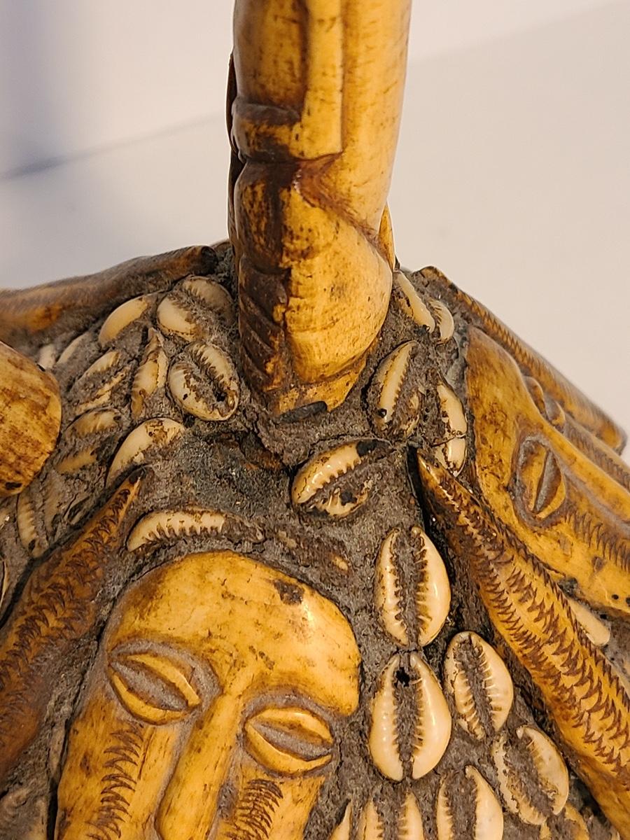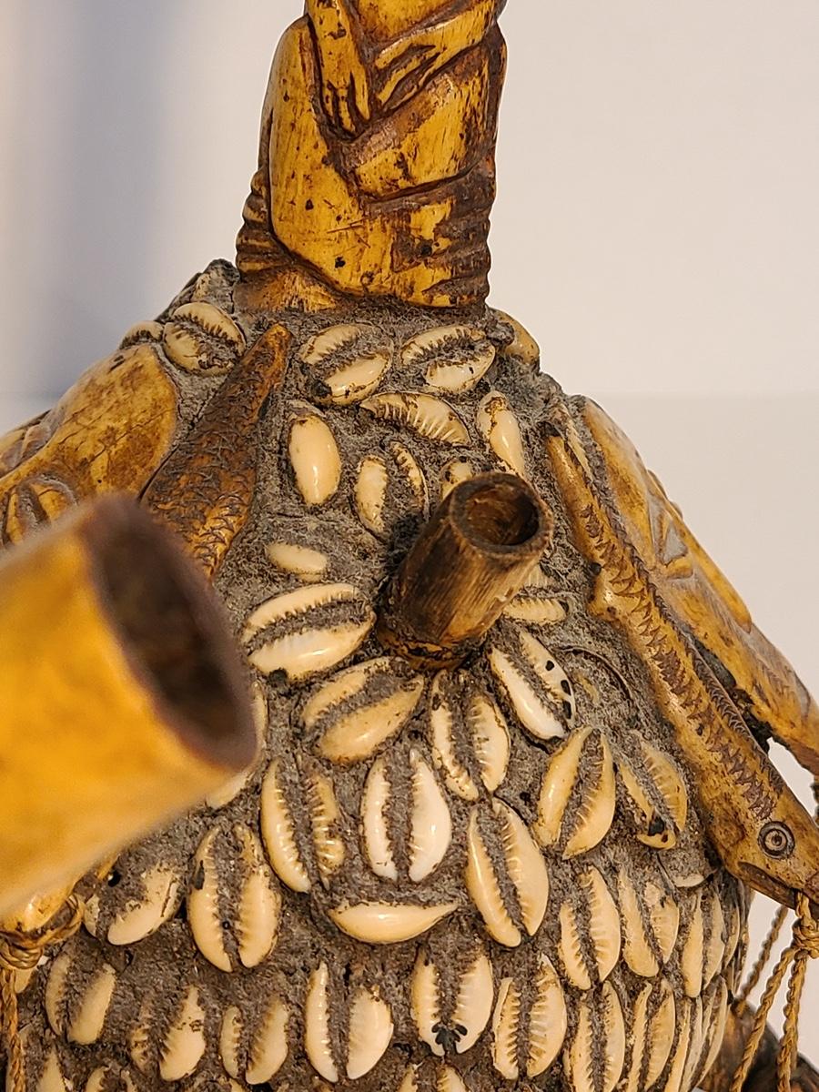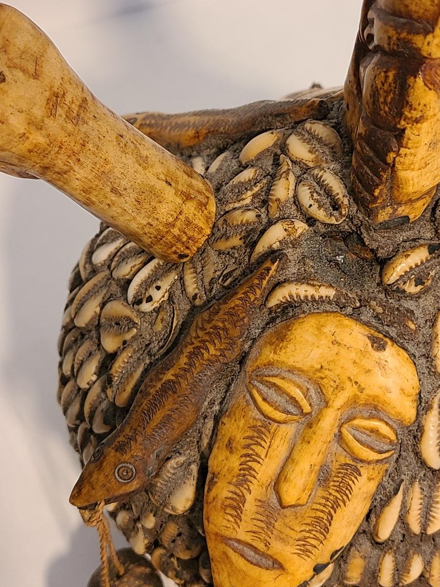 Lot 142: Vintage African Mud/Bone/Shell Water Bottle/Pipe (Snakes & Face Motif)