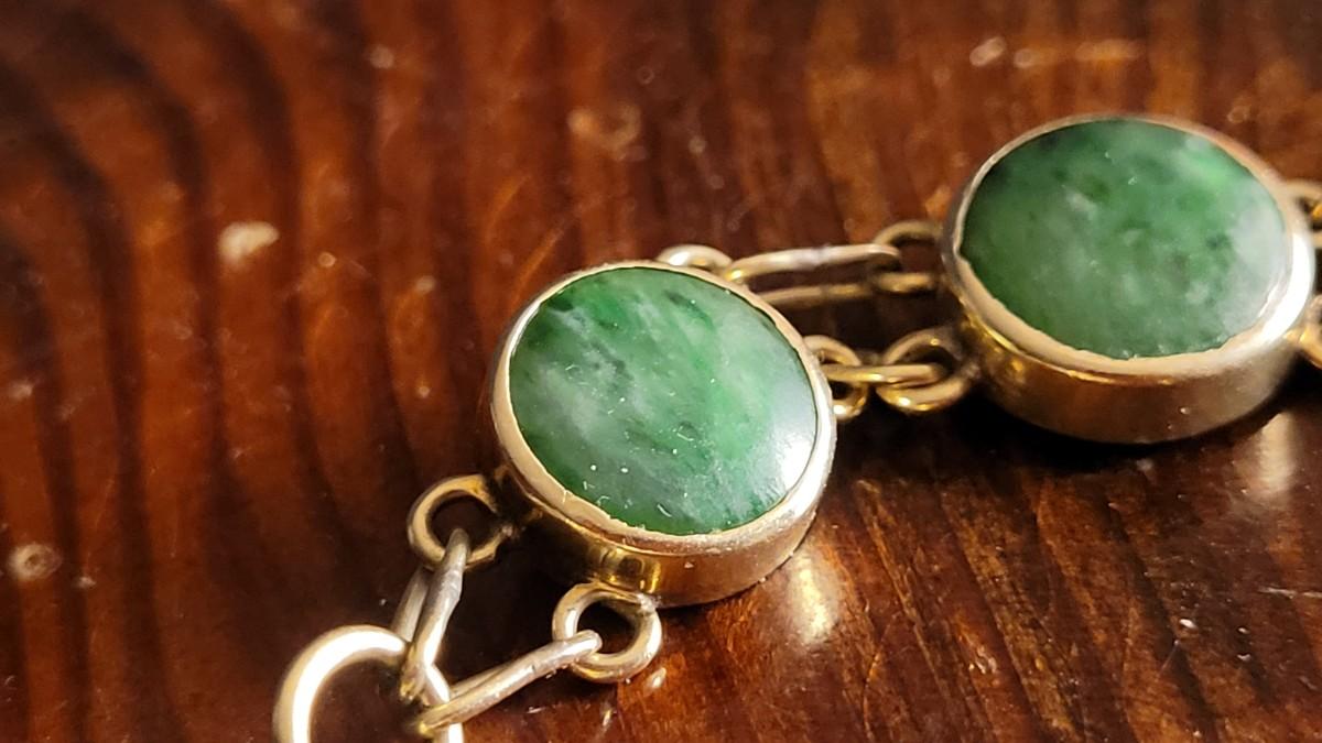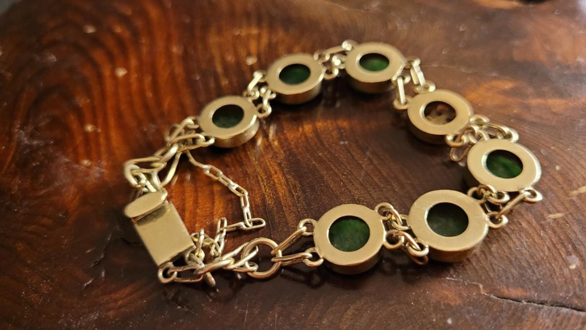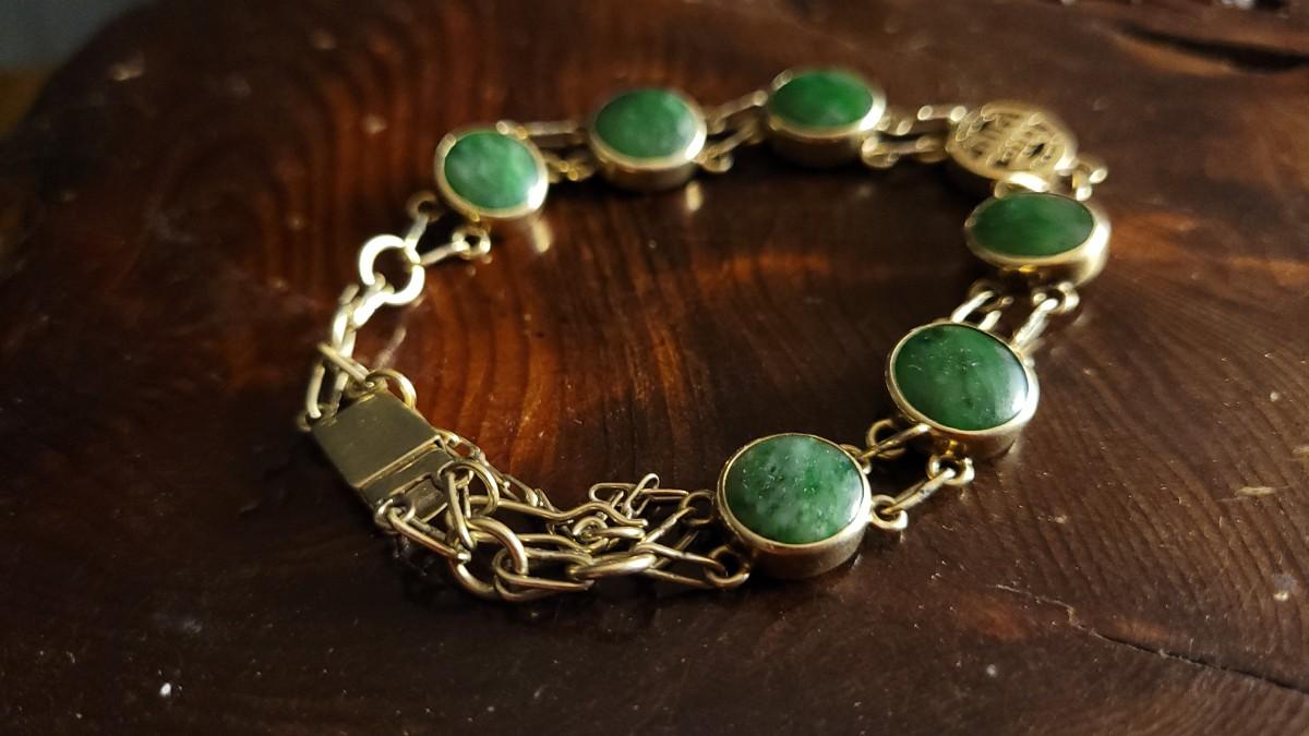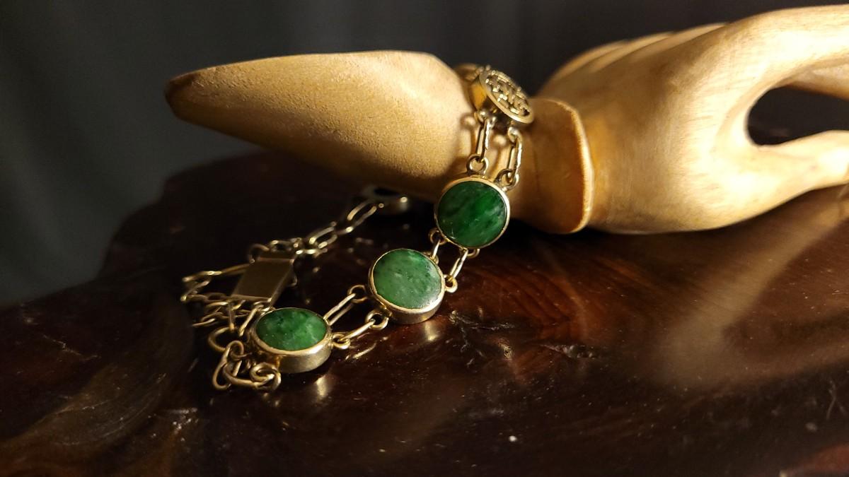 This lot features a Vintage Jade and Gold Chinese bracelet. The Clasp works as intended. The green stones are brilliant A beautiful piece in great condition for age. When Clasp is shut the opening is just over 3".