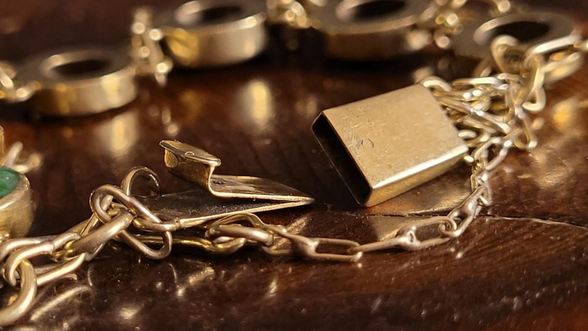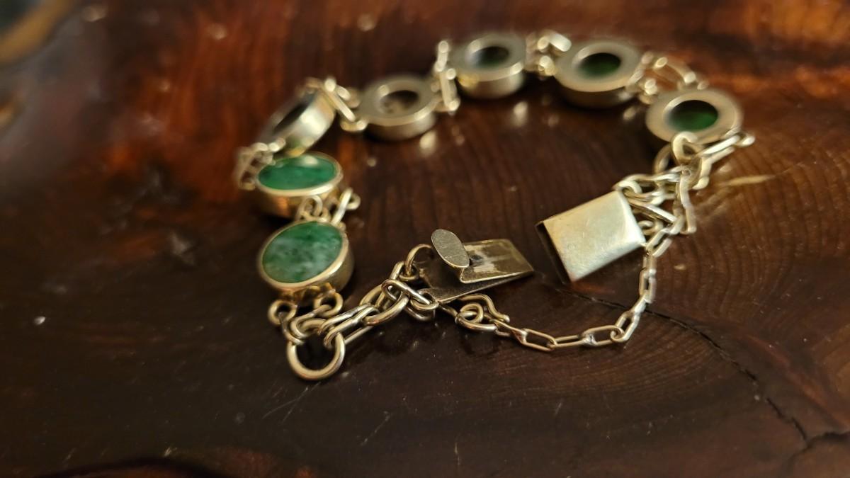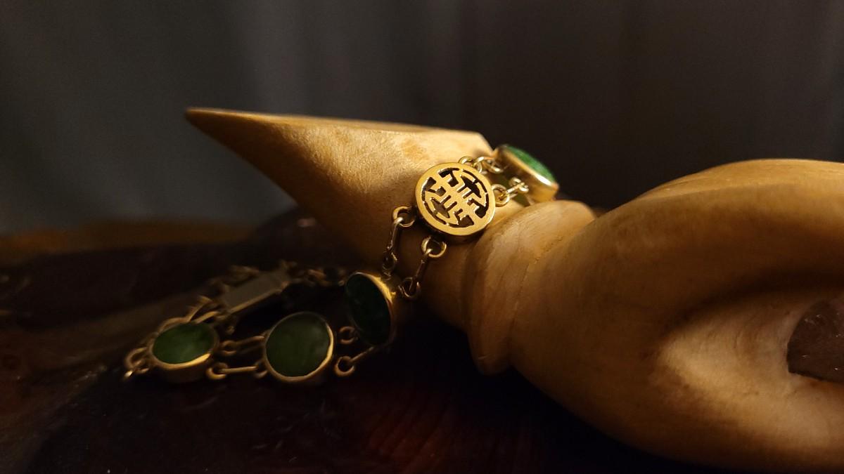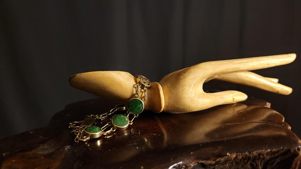 This lot features a Vintage Jade and Gold Chinese bracelet. The Clasp works as intended. The green stones are brilliant A beautiful piece in great condition for age. When Clasp is shut the opening is just over 3".