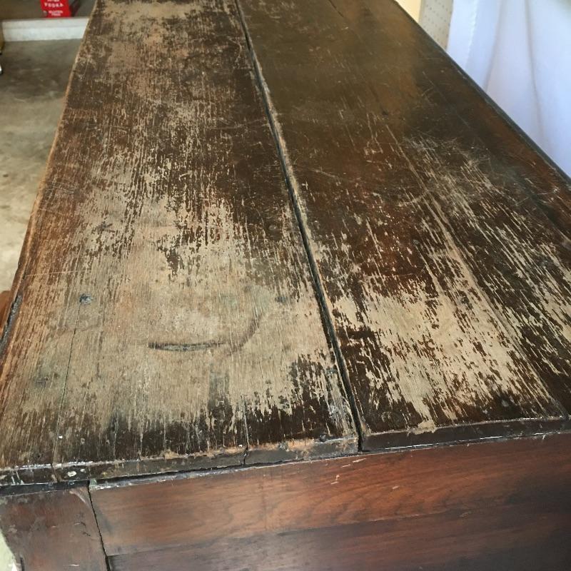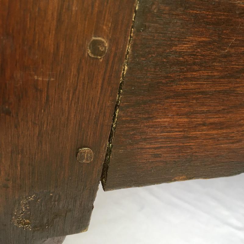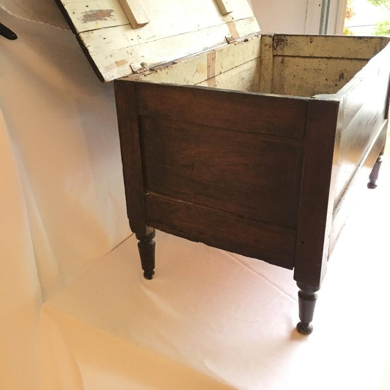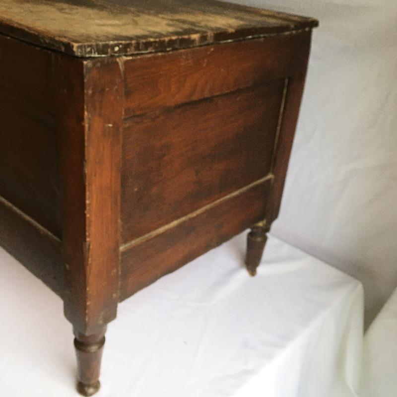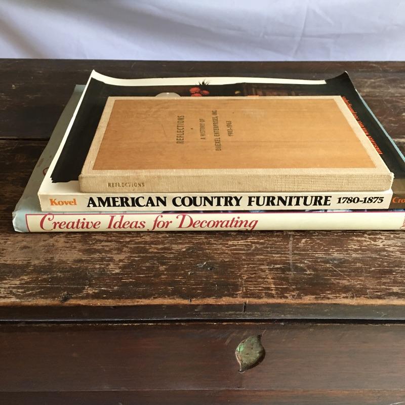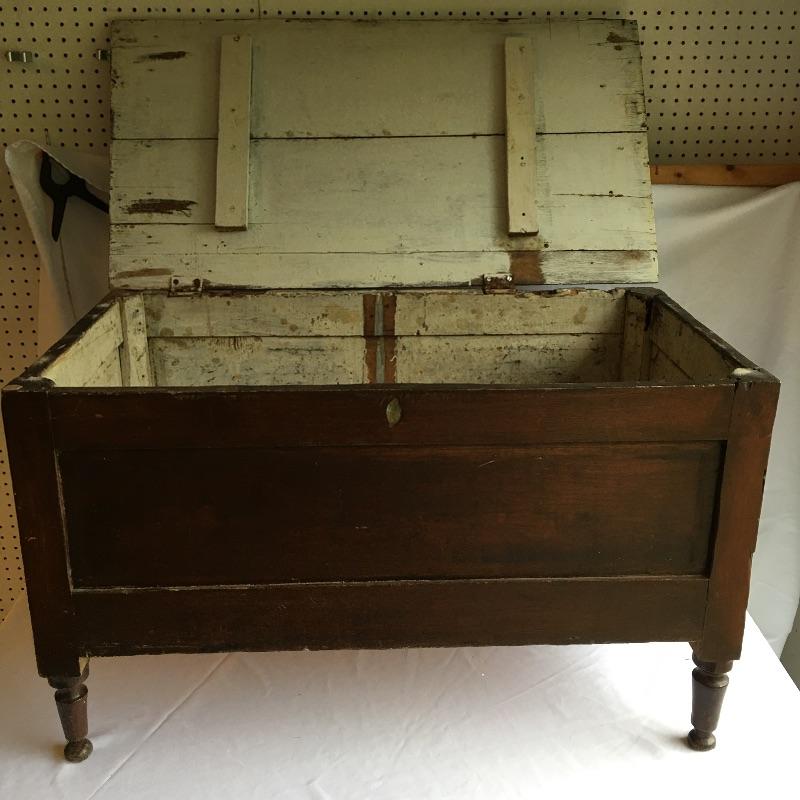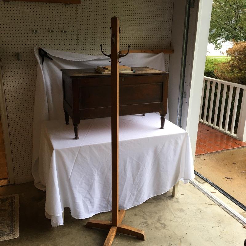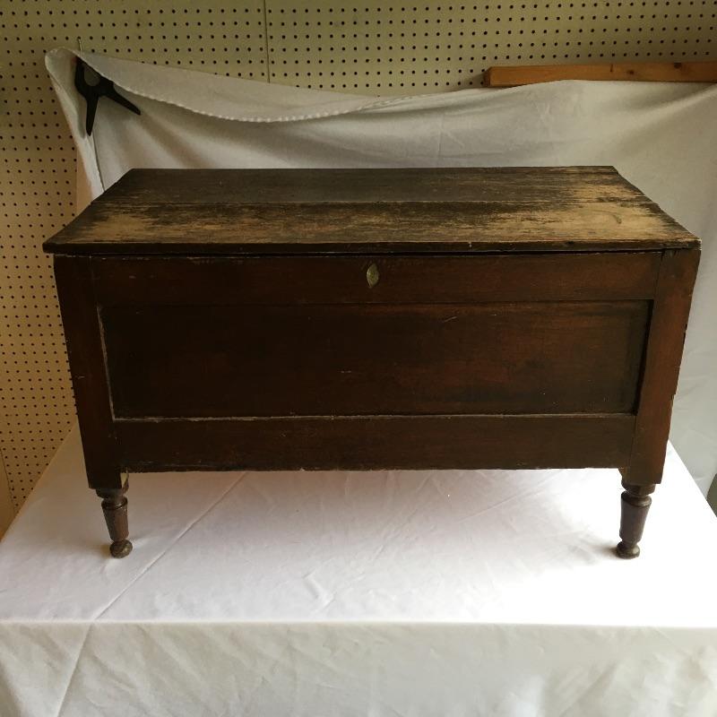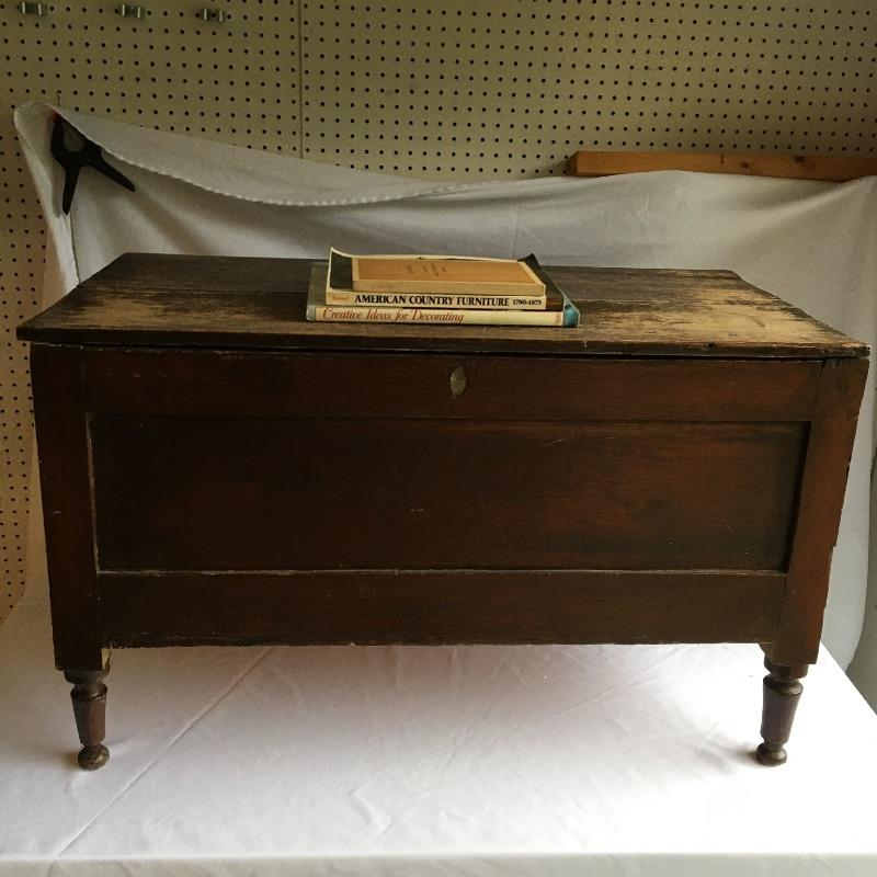 This lot includes a footed antique trunk, an oak free-standing coat rack and three books on furniture. Oak coat rack has some water stains and trunk has had top replaced, but the new top is worn. The trunk also has quite a bit of wear on feet, see pictures. Trunk is a stunning piece for a shabby look, and would be amazing if finish was restored. measures 19.5” x 36.5” x 22”.