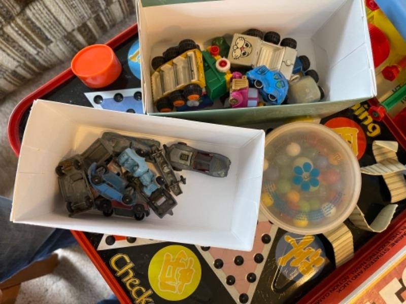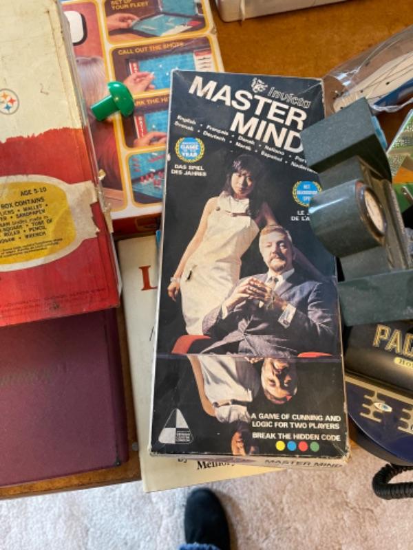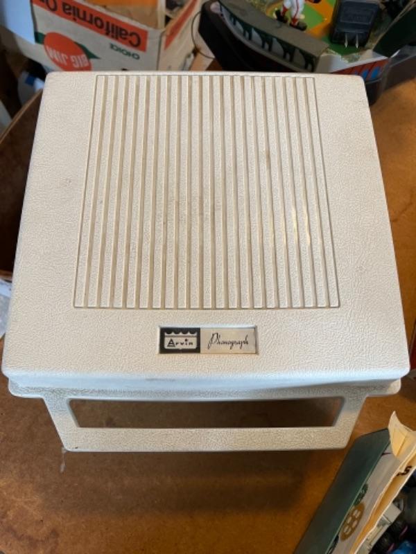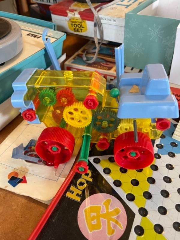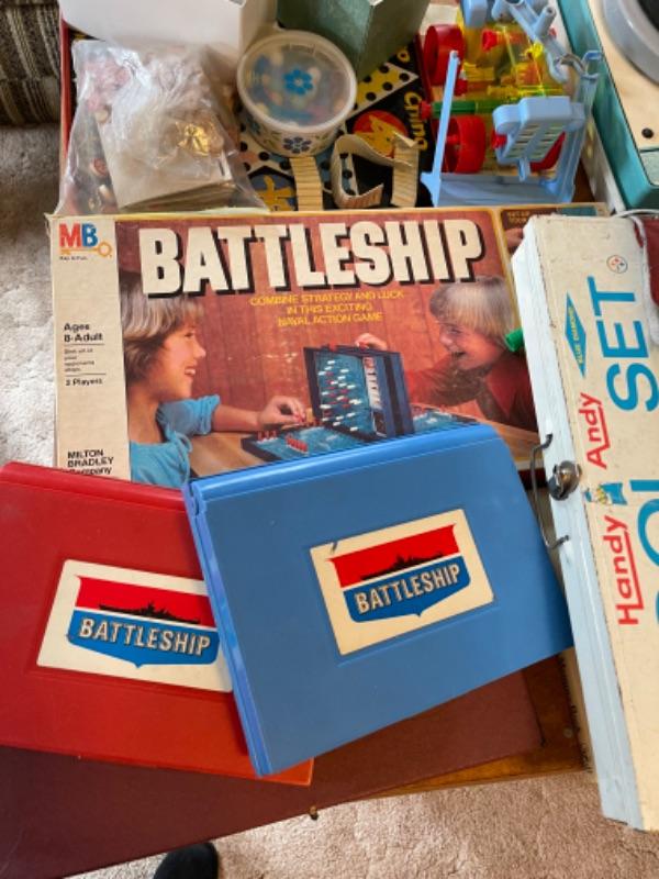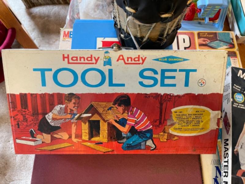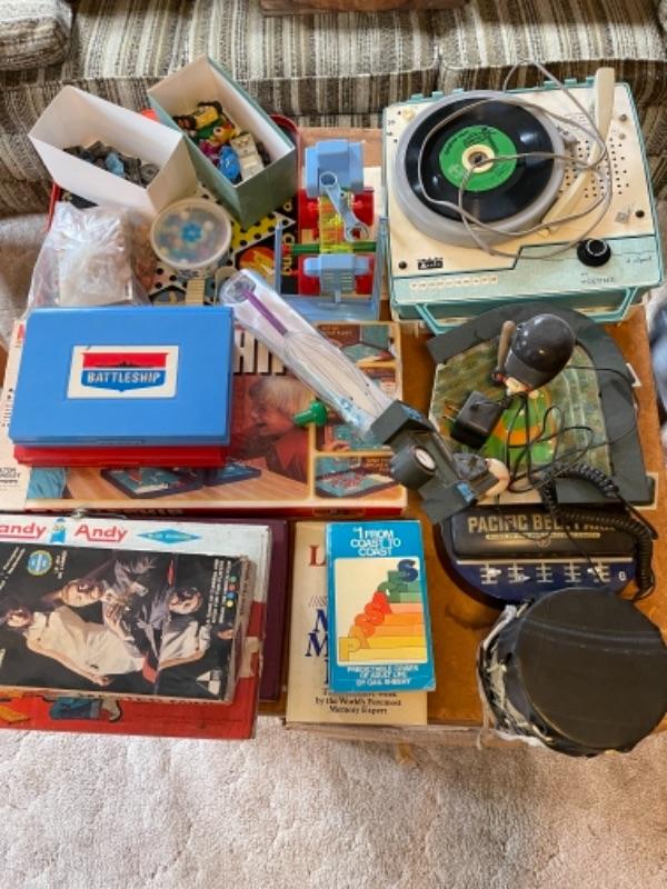 Lot 142. Arvin child’s record player, games, Pacific Bell Park telephone, tom-tom, Handy Andy tool kit, Scrabble, Battleship--$25