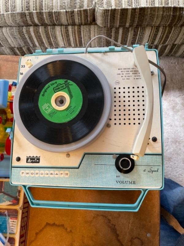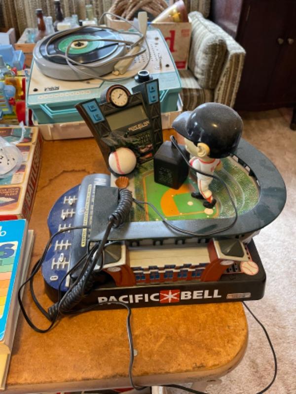 Lot 142. Arvin child’s record player, games, Pacific Bell Park telephone, tom-tom, Handy Andy tool kit, Scrabble, Battleship--Was $45 - -Now $25