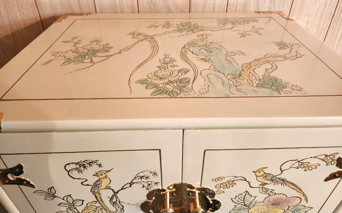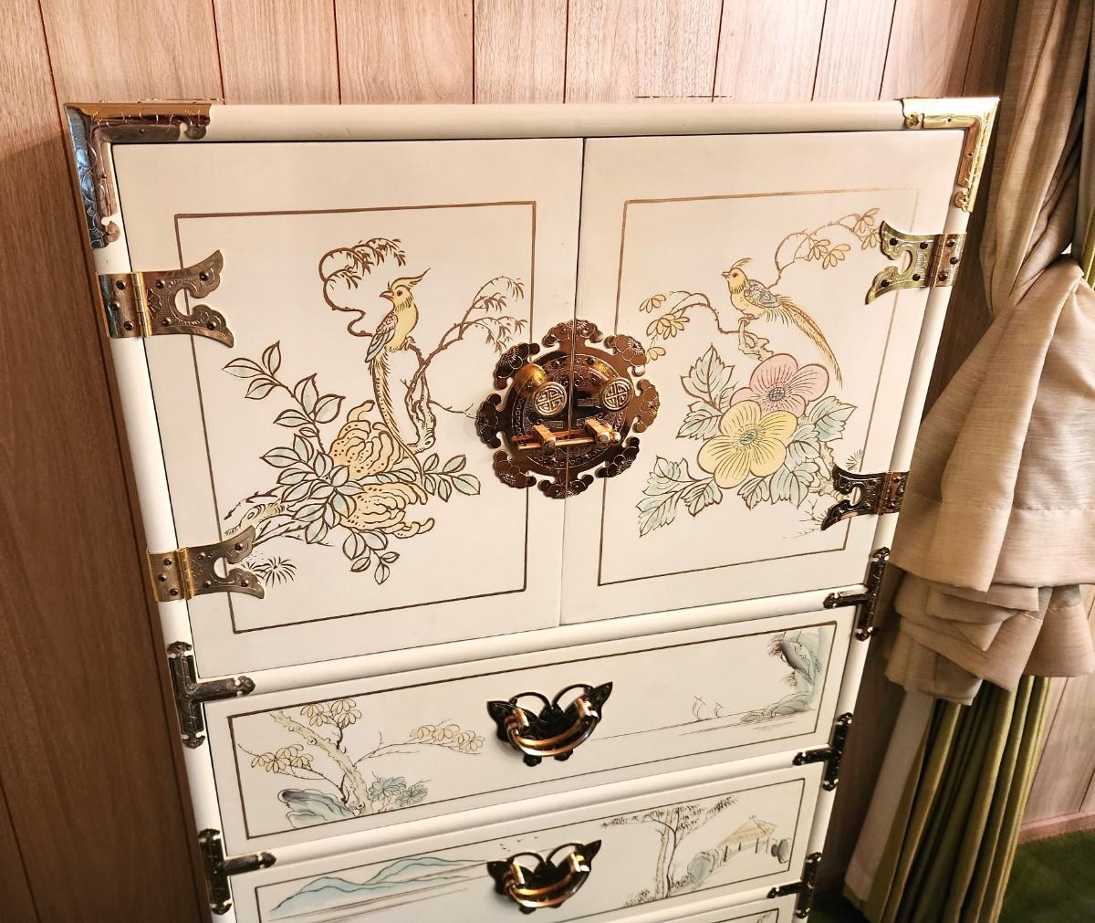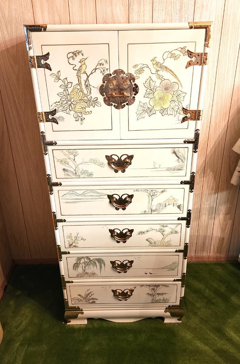 This Asian Style Lingerie Chest has 11 drawers - 52" tall, 22" across, 16" deep. 1970's - Highly decorated with floral motif and brass fittings.