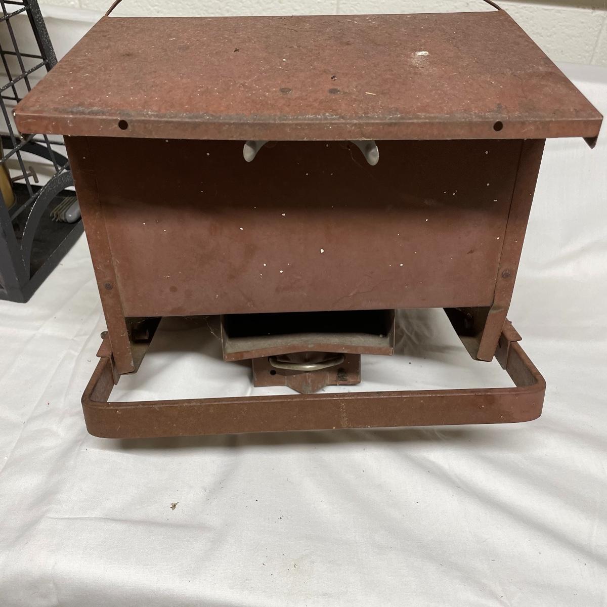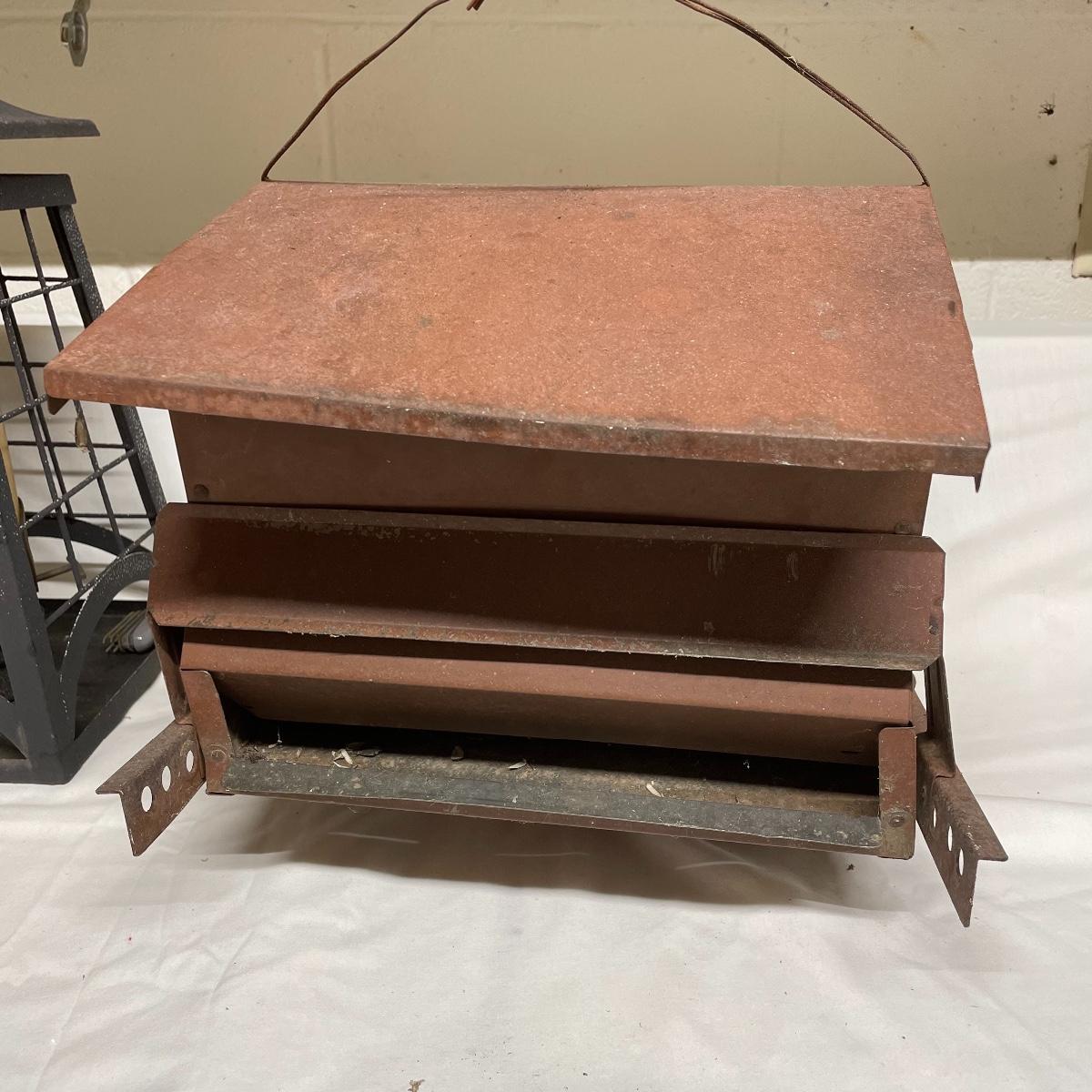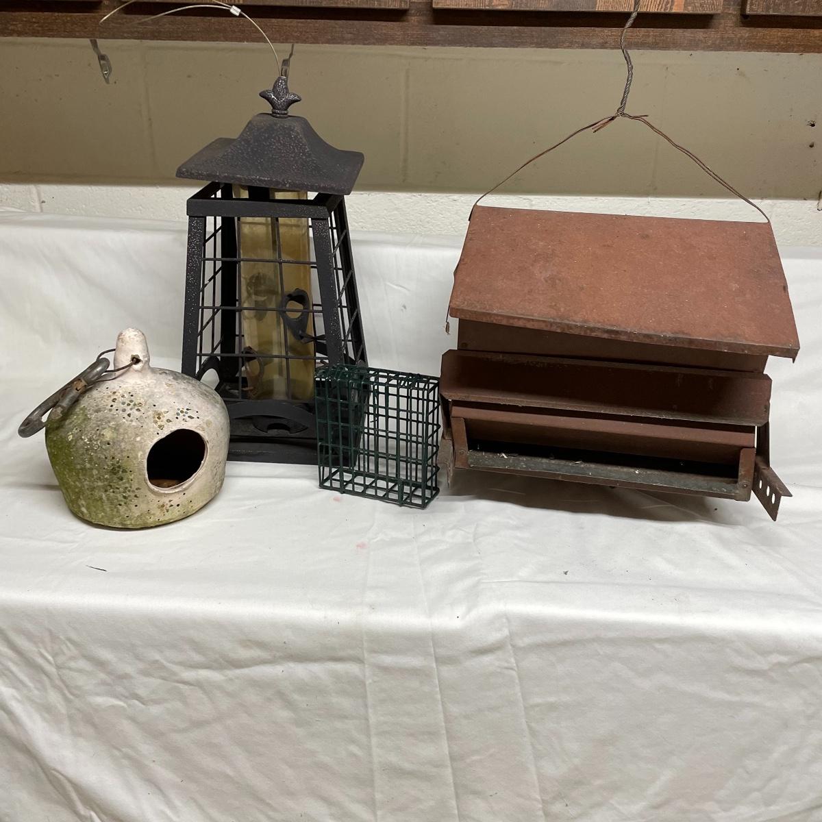 Collection of four feeders for your feathered friends. Lot includes a heavy ceramic feeder with an open metal hook, a suet feeder, a nice fleur de lis style metal and glass feeder and finally an adjustable larger metal feeder measuring approximately 14” x 11.5” x 10”. Items need a bit of cleaning and some food and you’re good to go! See images. Local pick up only.