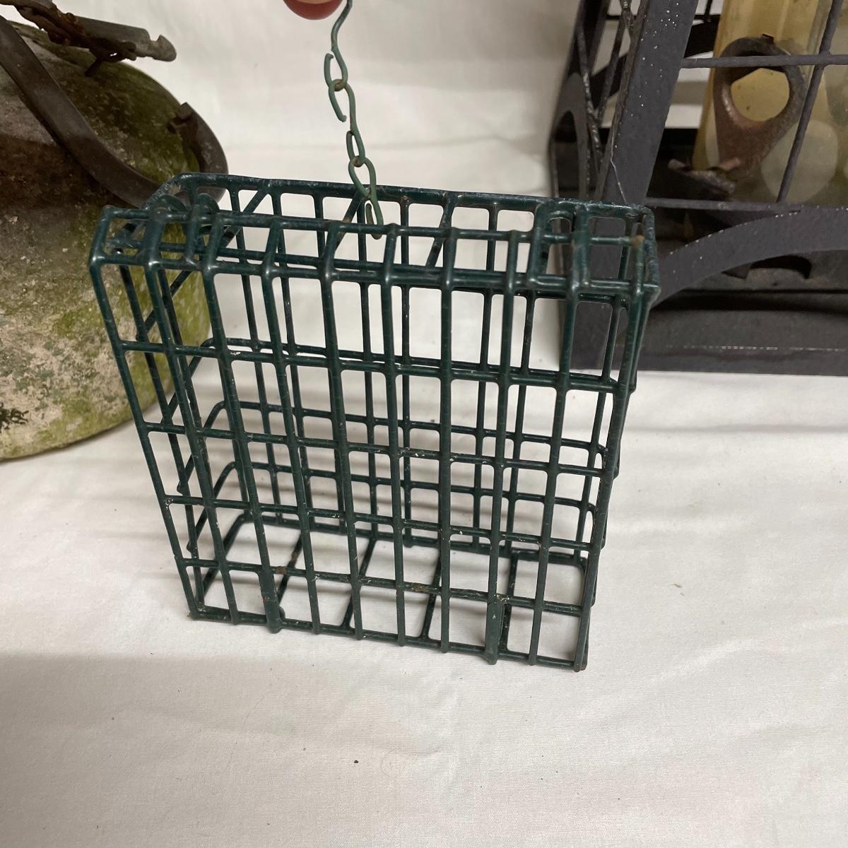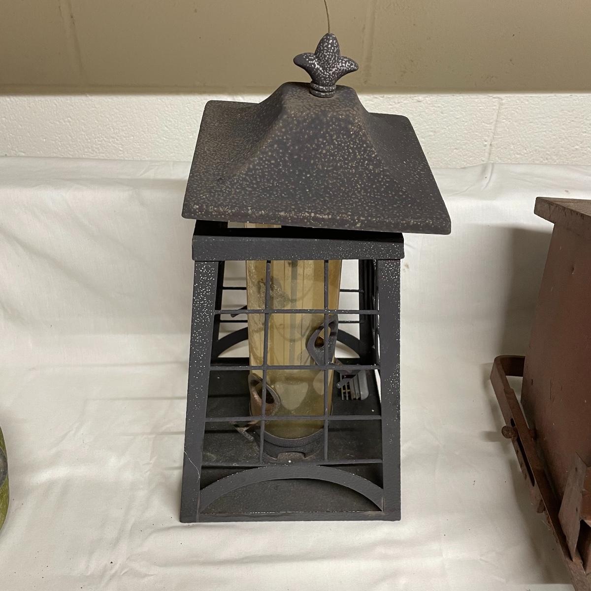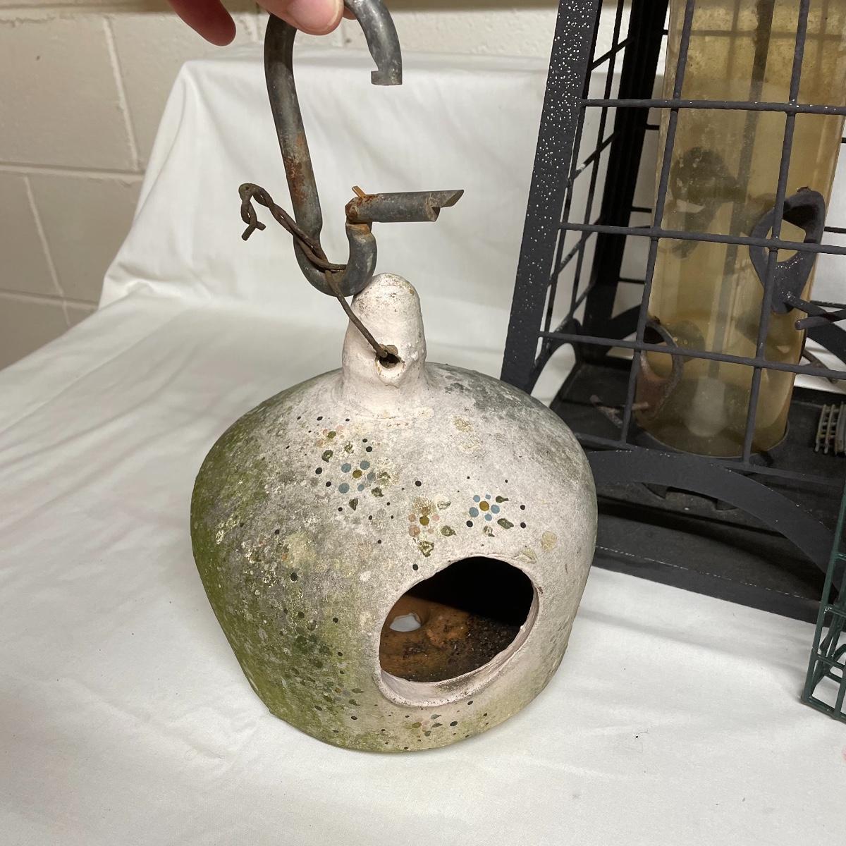 Collection of four feeders for your feathered friends. Lot includes a heavy ceramic feeder with an open metal hook, a suet feeder, a nice fleur de lis style metal and glass feeder and finally an adjustable larger metal feeder measuring approximately 14” x 11.5” x 10”. Items need a bit of cleaning and some food and you’re good to go! See images. Local pick up only.