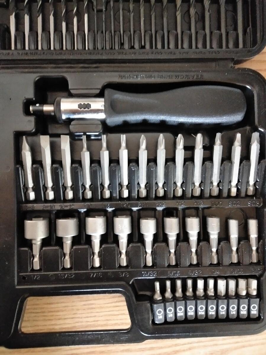 BLACK AND DECKER TOOL KIT WITH CASE, LED HEAD LAMP, AND 3 PIECE UTILITY SCRAPER KIT.