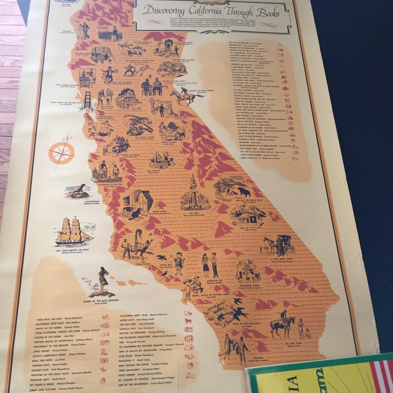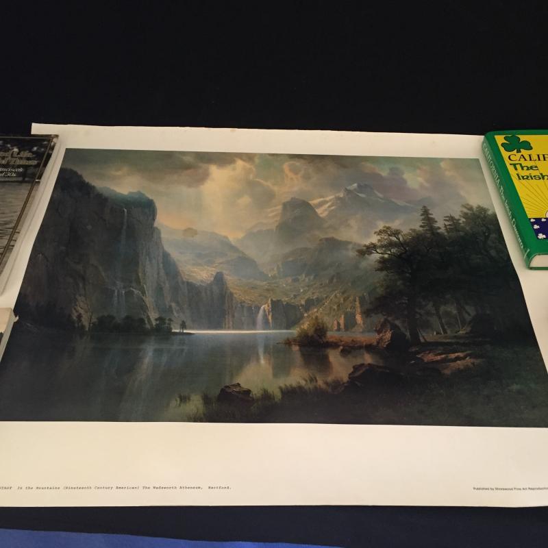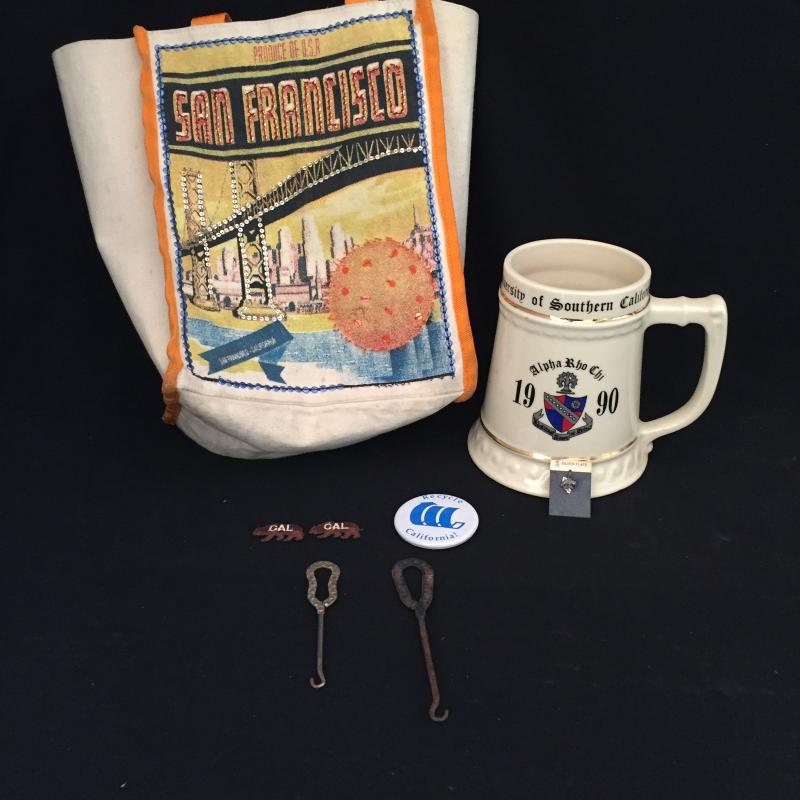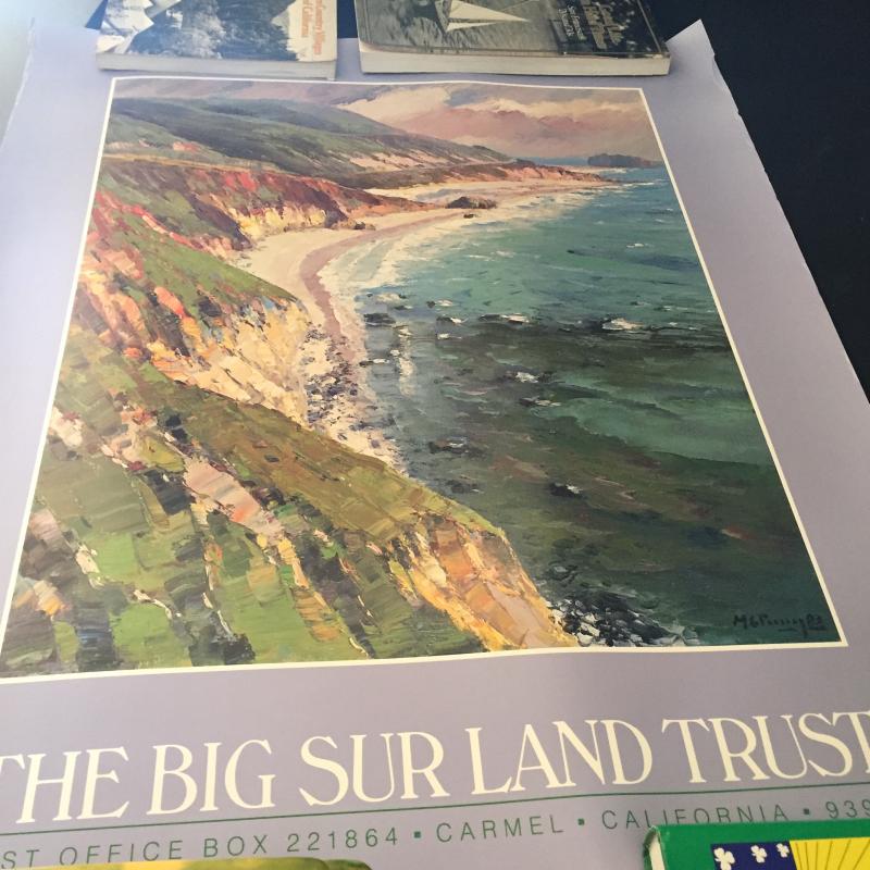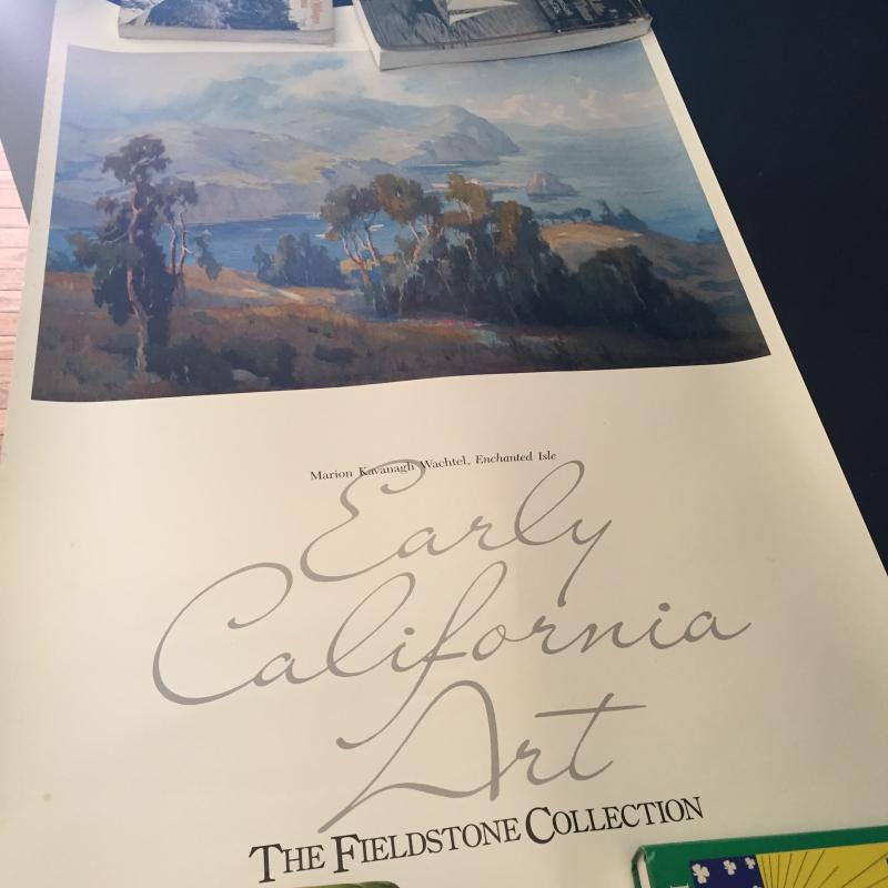 Assortment of California Bric a Brac. Art, Mug, Books, Posters and More. Largest Framed Art Measures 15” x 14.75”.