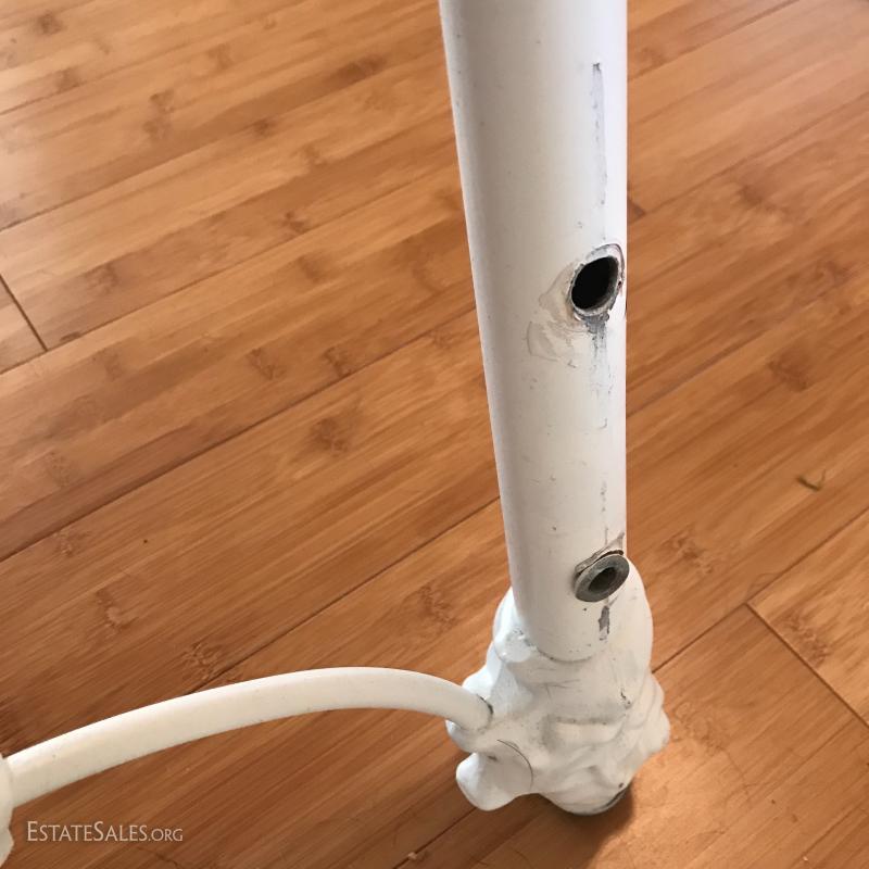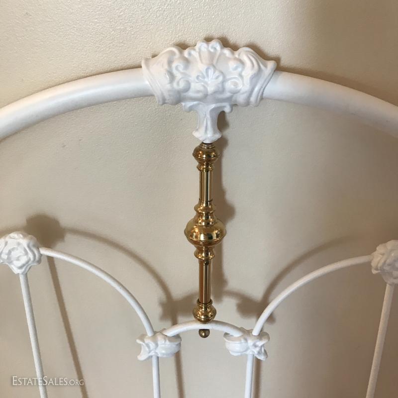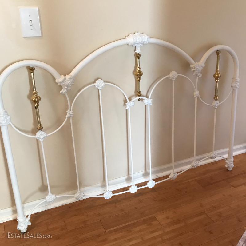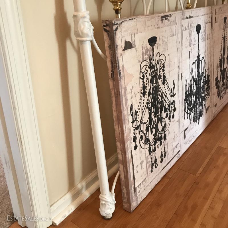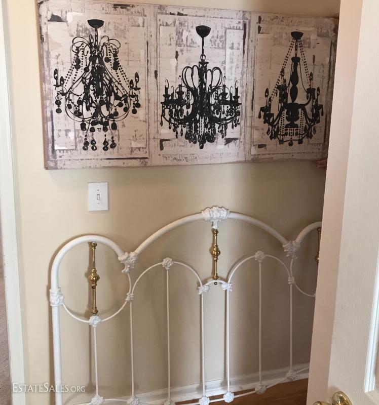 Sleep like a princess with this white and brass metal headboard (61"l x 41.5"tall). Accent the room with a large cream and light pink canvas chandelier print (54"l x 27"w). No shipping. Local pick up in Mills River, NC.