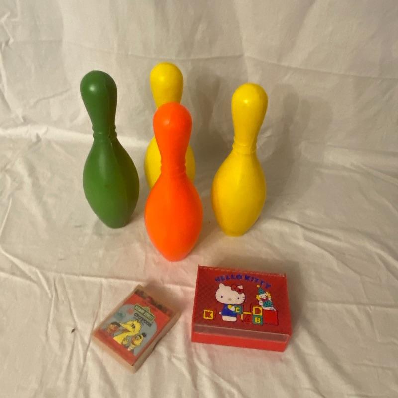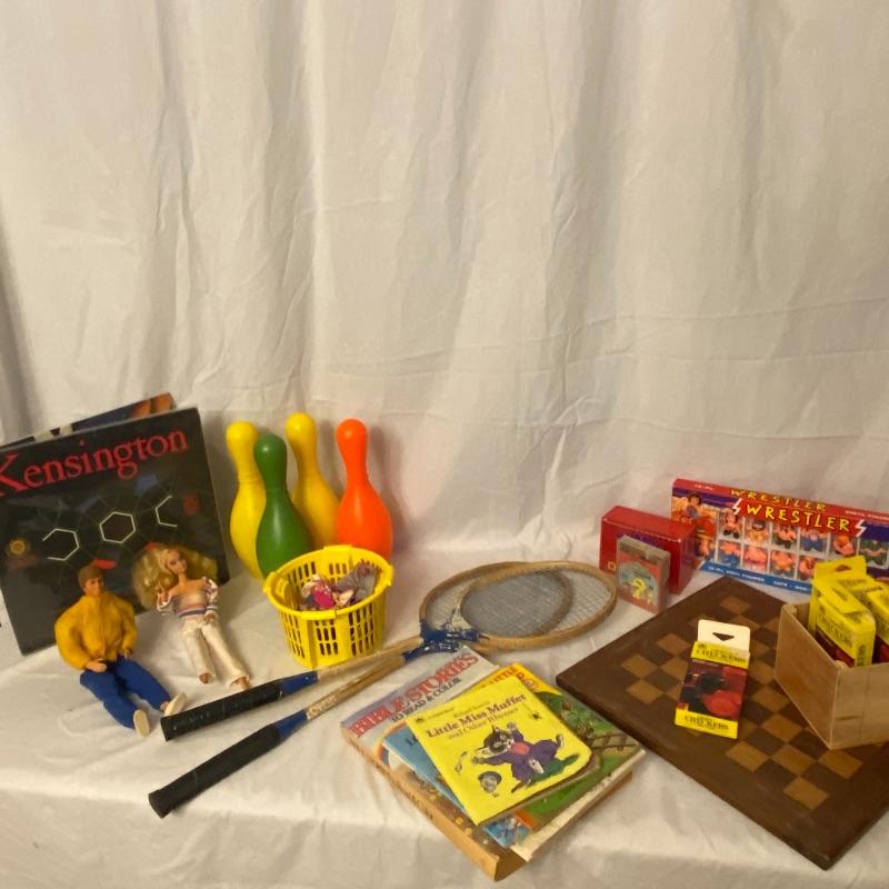 This exciting lot includes all around fun for the kids! Enjoy a pair of badminton racquets, Barbie and Ken dolls with accessories, a packaged Kensington game, and a checkerboard set with crack in board, see photos. Lot also includes Wrestler figurines, four bright plastic bowling pins, and children’s books. Local pickup only