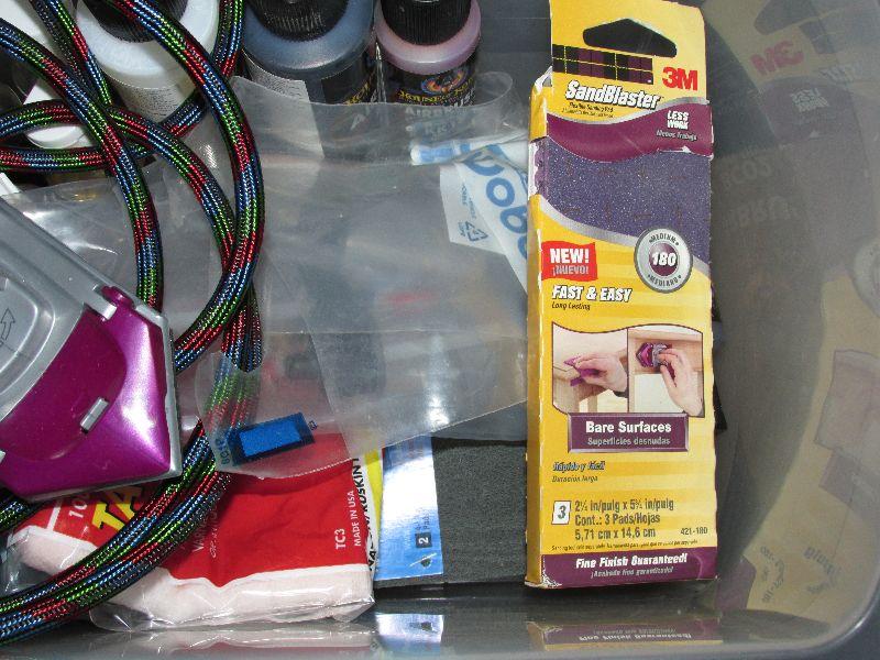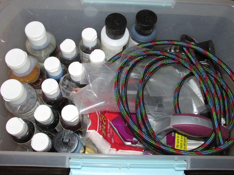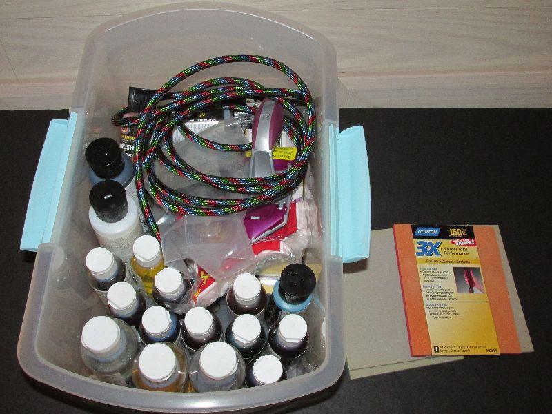 Collection of airbrush paint, connector hose for airbrush, and several other airbrush supplies. Paint is House of Kolor. Plastic carrying case included.