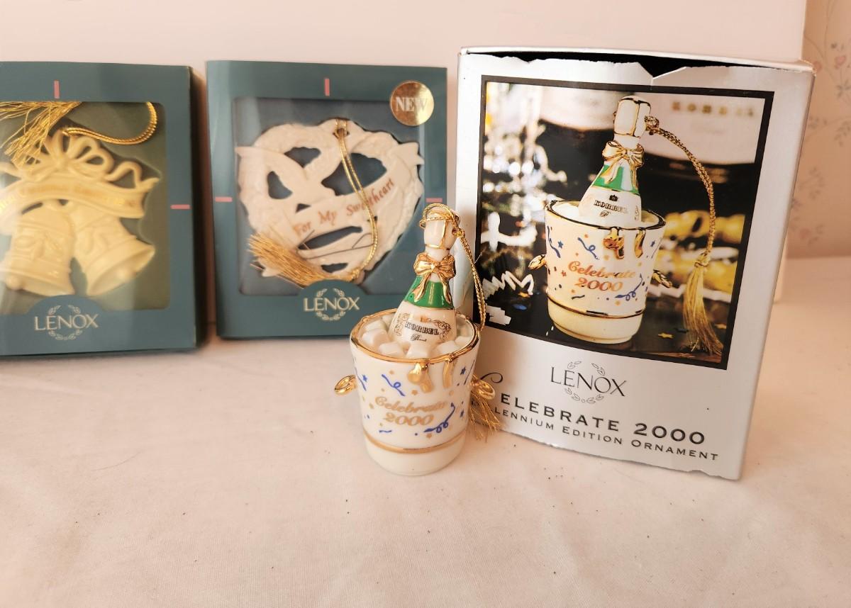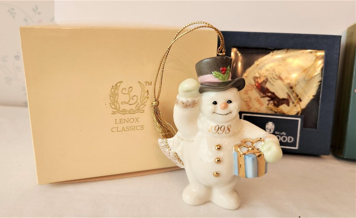 Lot of four LENOX ornaments with boxes - 1st Xmas (1996), Sweetheart, Year 2000 Snowman, Wedgwood 1st Xmas 1996. All in good condition.