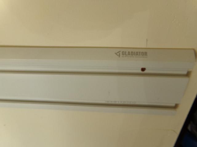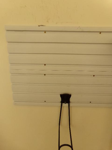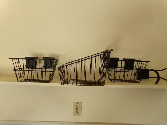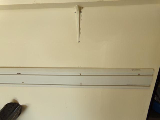 GLADIATOR STORAGE RAIL SYSTEM FOR A GARAGE, THERE IS ABOUT 25' OF THE RAIL SYSTEM WITH NUMEROUS STYLE HOOKS AND BASKETS.
