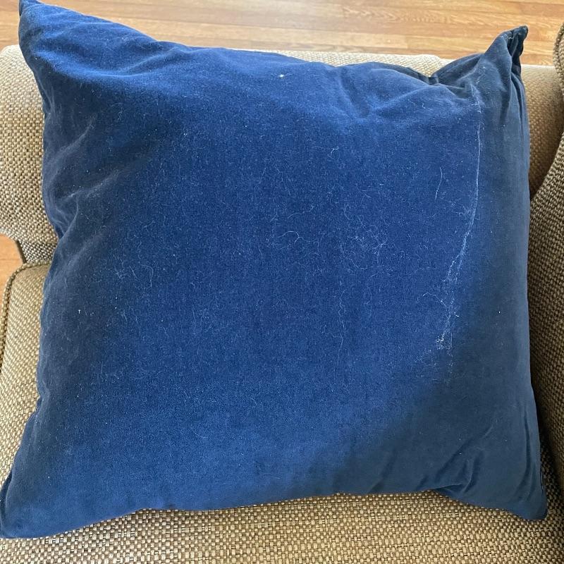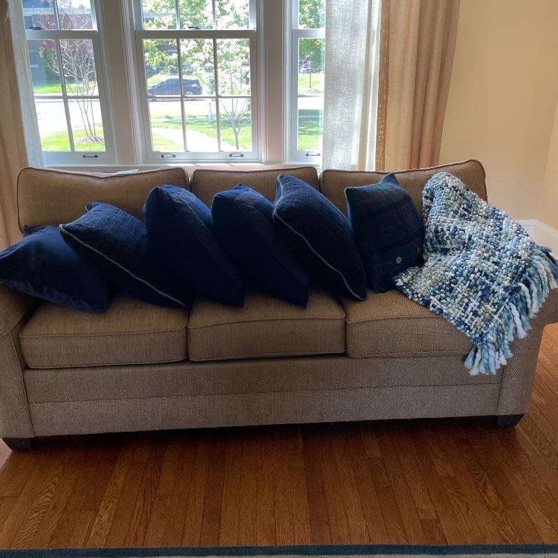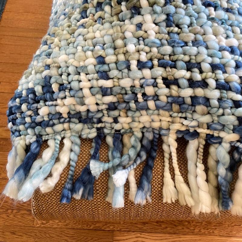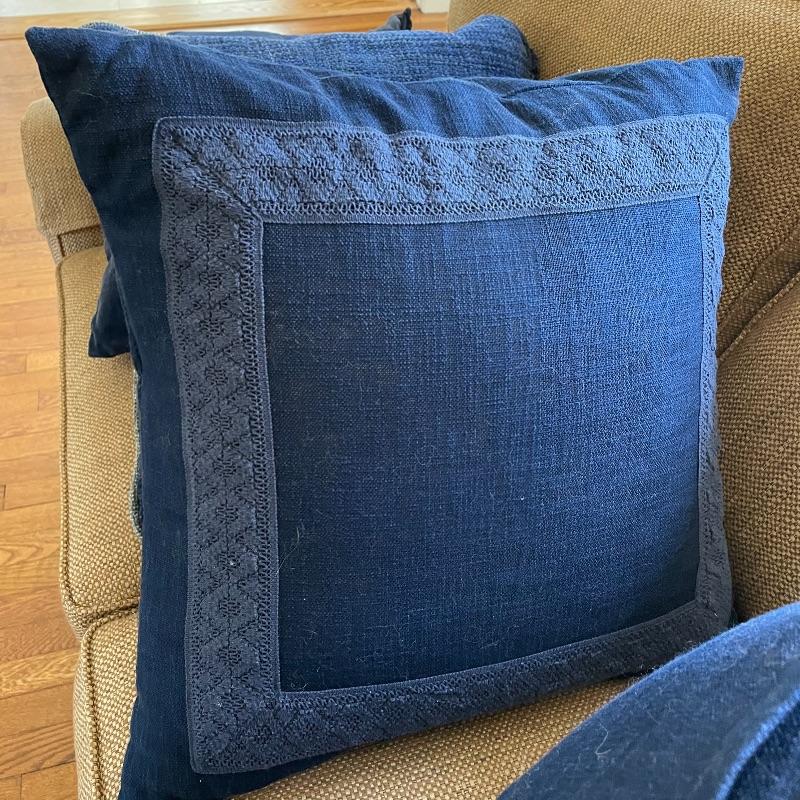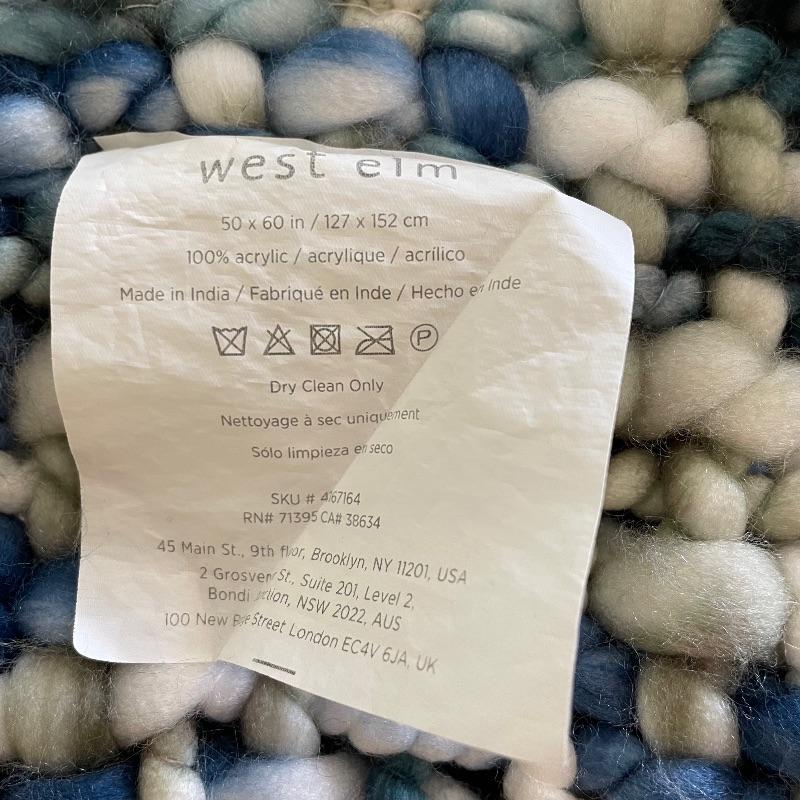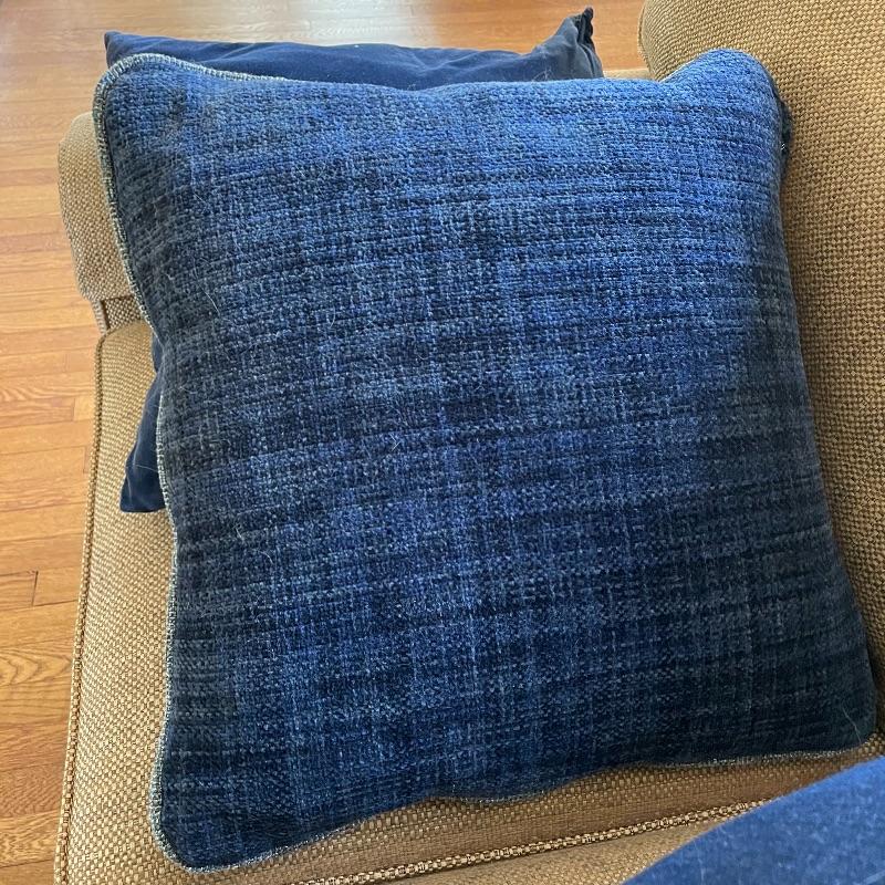 Gorgeous blue mixed with earth tones colored afghan, this West Elm blanket measures 50” x 60” is fairly thick and very soft. We’ve paired it with enough throw pillows to decorate a bed and sofa! Two matching sets and two single pillows for your coordination! This lot shows some cat hair. Local pick up only.