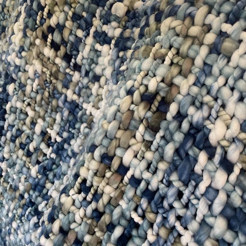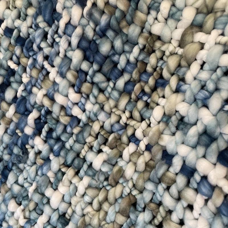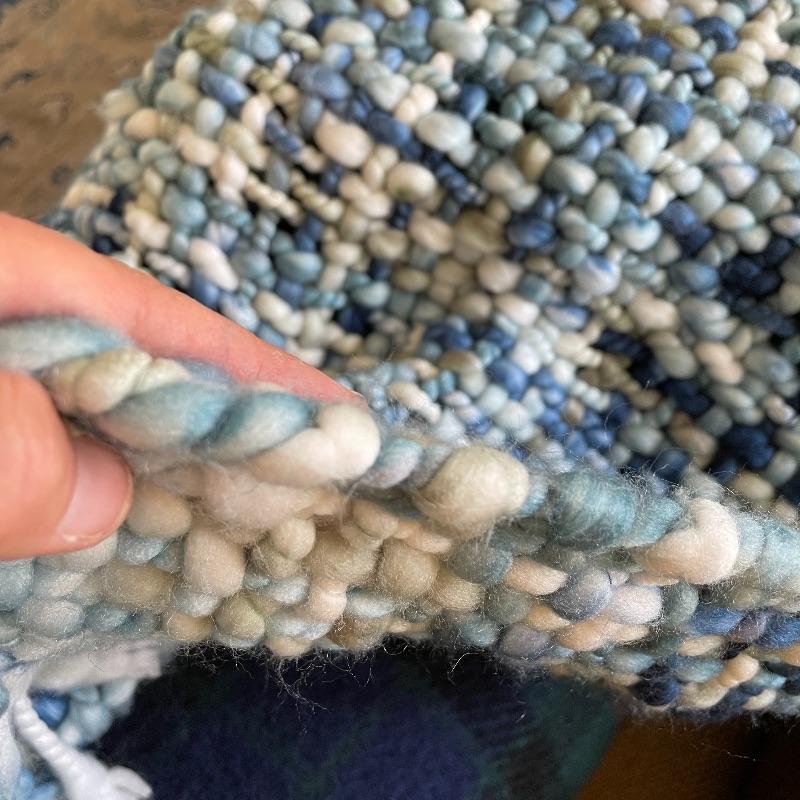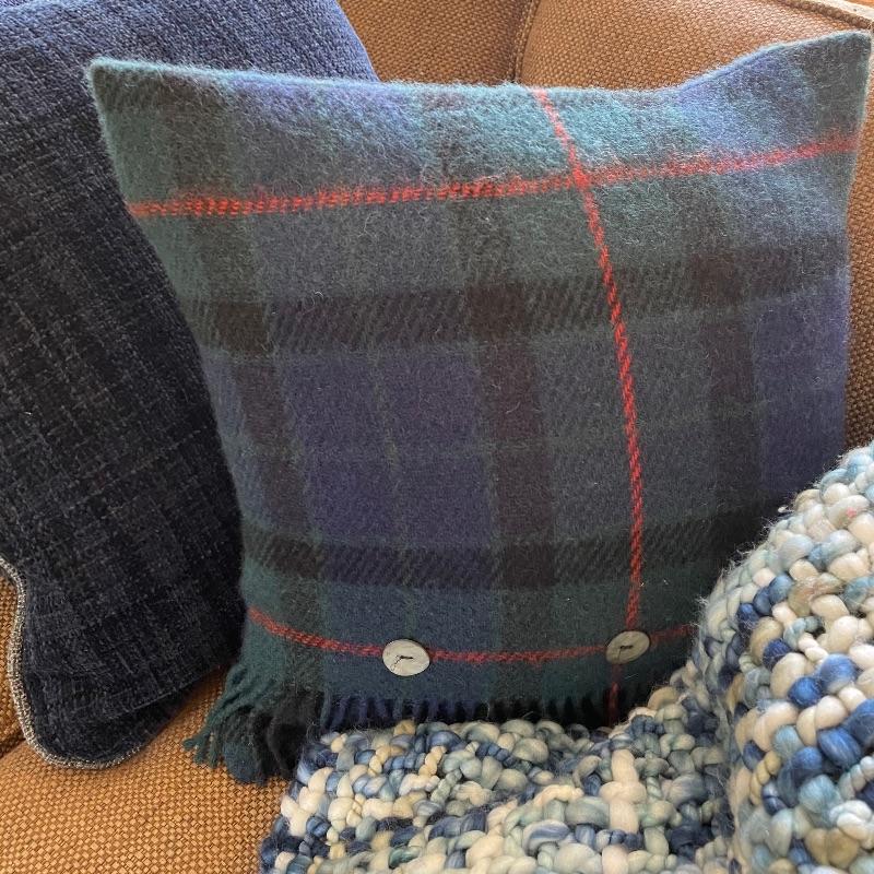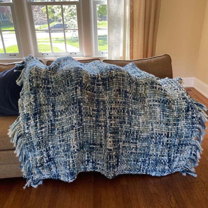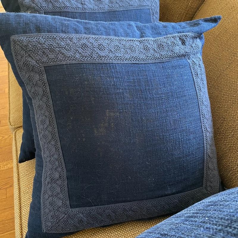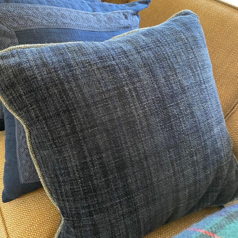 Gorgeous blue mixed with earth tones colored afghan, this West Elm blanket measures 50” x 60” is fairly thick and very soft. We’ve paired it with enough throw pillows to decorate a bed and sofa! Two matching sets and two single pillows for your coordination! This lot shows some cat hair. Local pick up only.