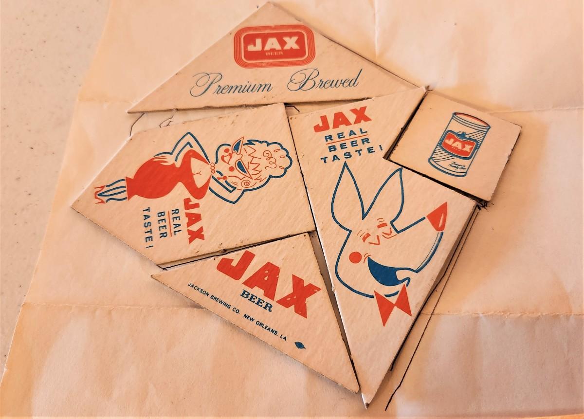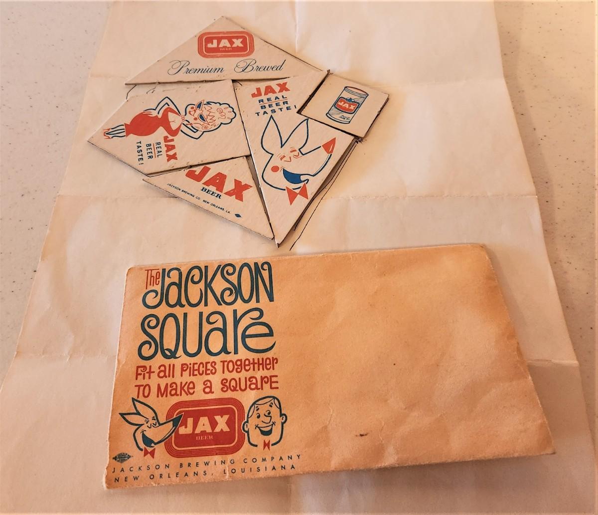 In original envelope - complete. Vintage bar game - put together "Jackson Square - premium given by JAX to bars to keep their customers amused. Comes with template. 4" x 4" - sturdy cardboard - 2-sided - good condition. Very hard to find!