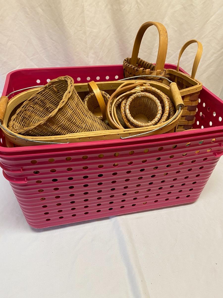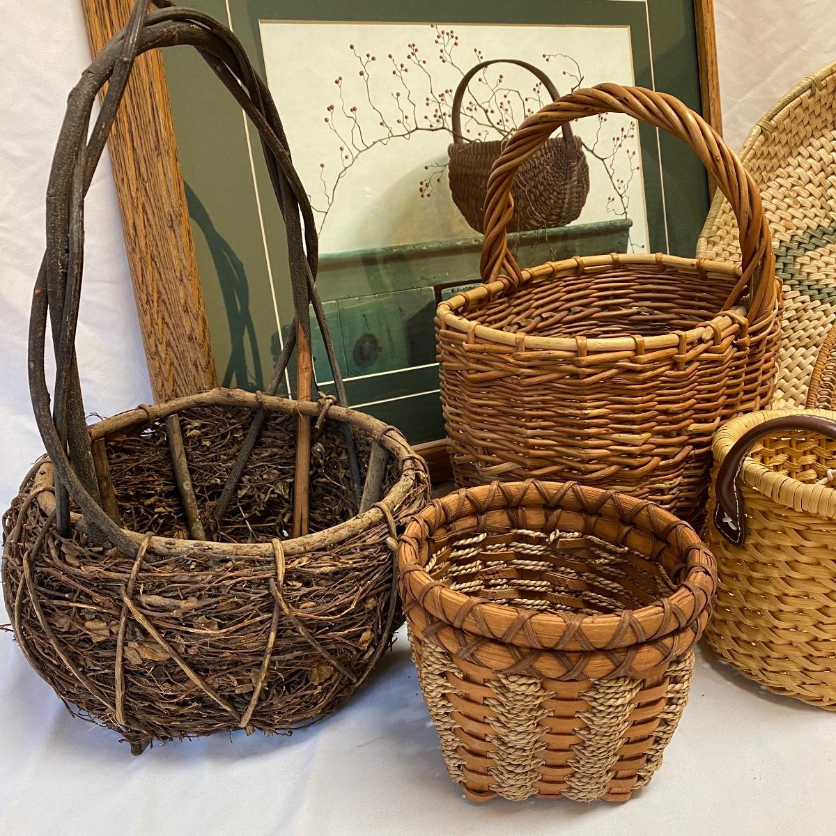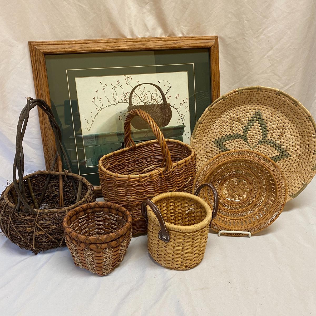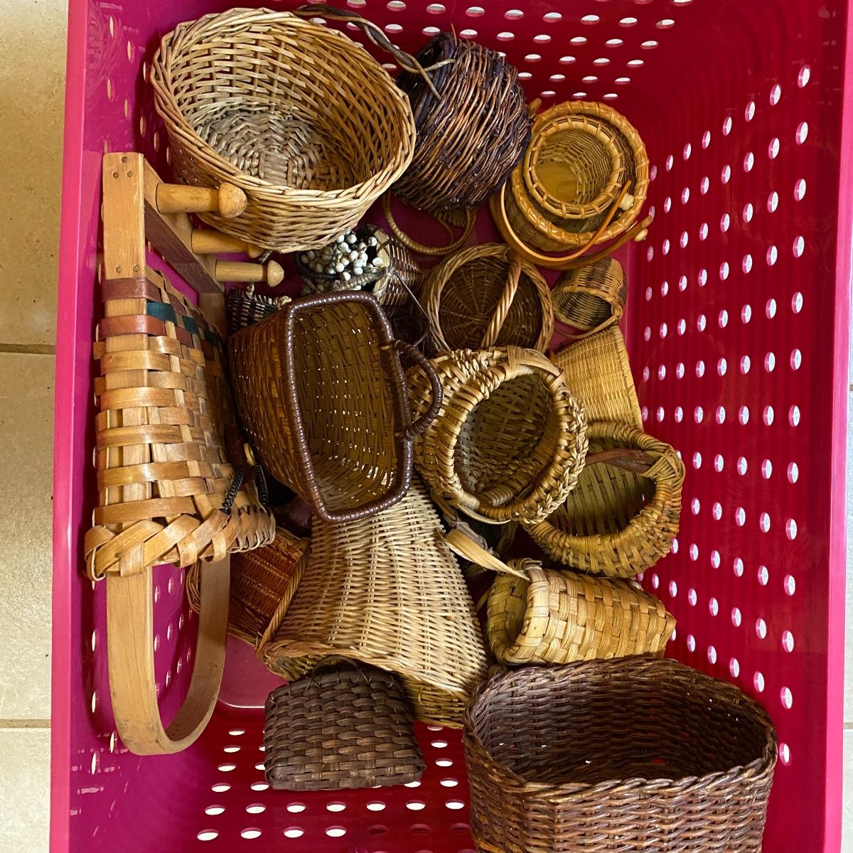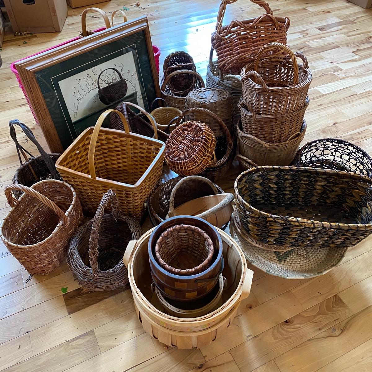 Lots of excellent baskets in the lot. Some have handles. Some have metal. There are a ton of tiny miniatures. There is a nice variety here. There are even two platter sized ones that can be hung on the wall to stay with the trends. Largest platter is. 14.5” diameter. Lot also includes an unsigned piece of framed art with a basket as the centerpiece. It measures 23” x 19”. There is a variety of shapes and sizes here so come take a look at all the baskets included in this lot during preview. Local pick up only. The pink bin full of small baskets is included to help with transport. Local pick-up only.