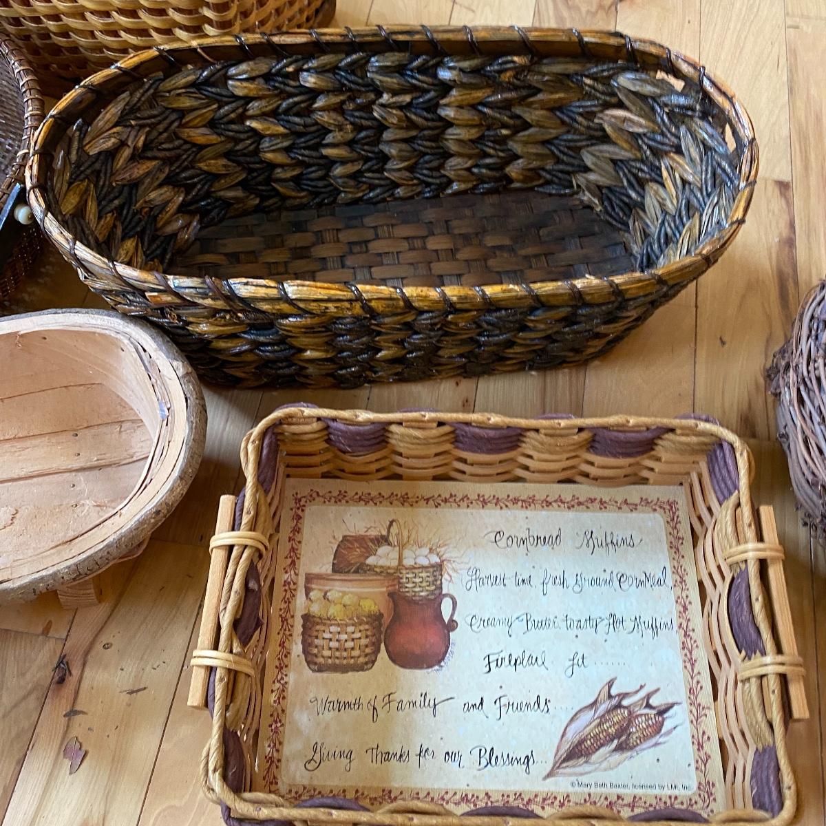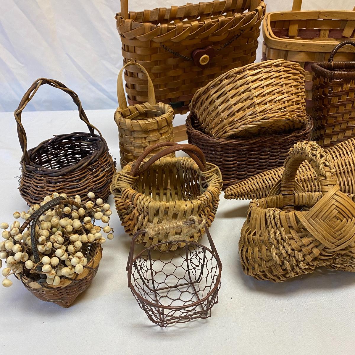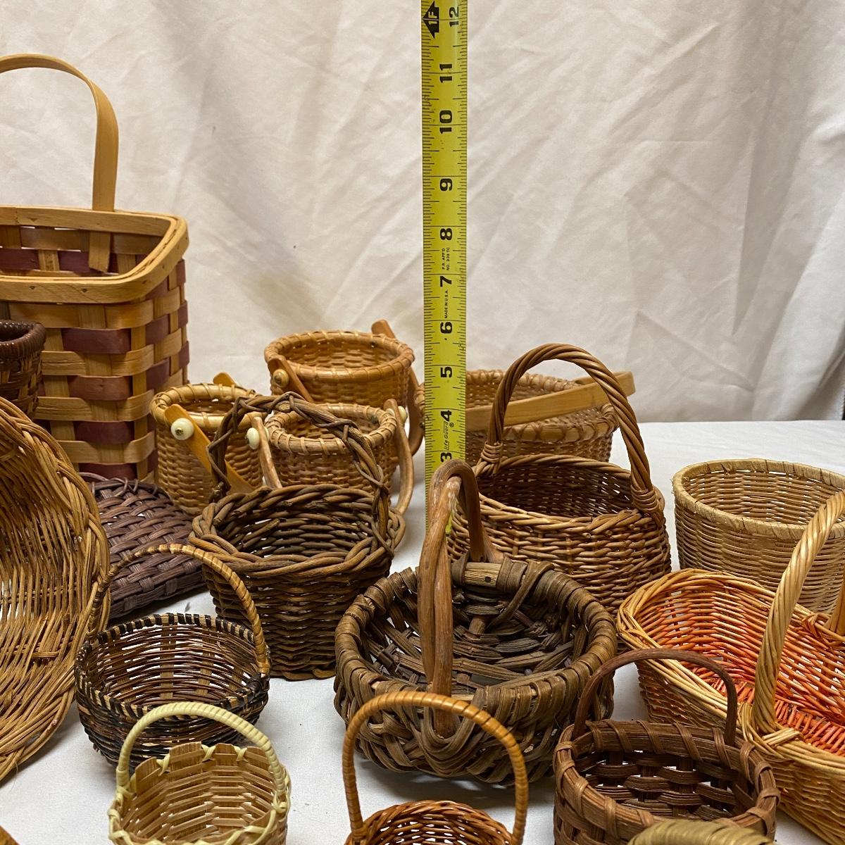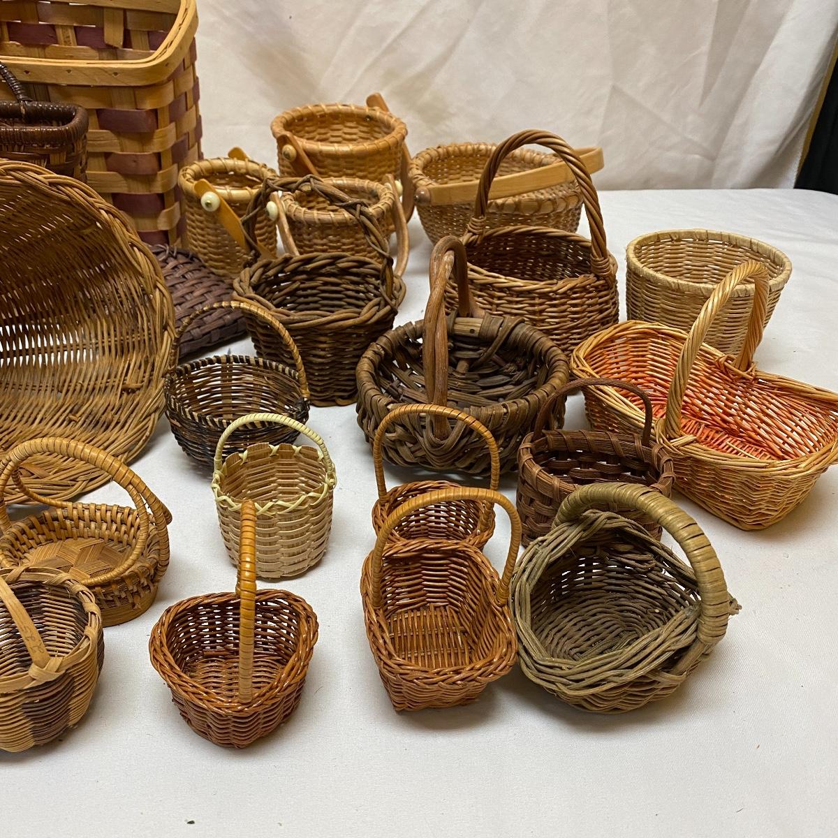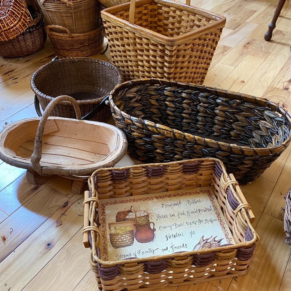 Lots of excellent baskets in the lot. Some have handles. Some have metal. There are a ton of tiny miniatures. There is a nice variety here. There are even two platter sized ones that can be hung on the wall to stay with the trends. Largest platter is. 14.5” diameter. Lot also includes an unsigned piece of framed art with a basket as the centerpiece. It measures 23” x 19”. There is a variety of shapes and sizes here so come take a look at all the baskets included in this lot during preview. Local pick up only. The pink bin full of small baskets is included to help with transport. Local pick-up only.