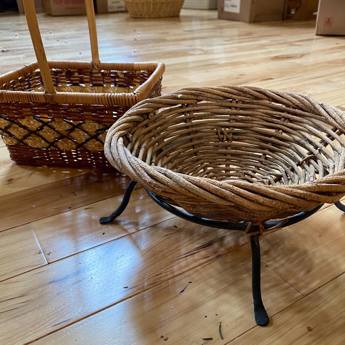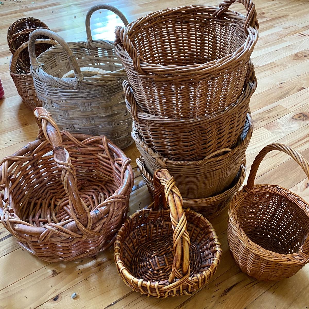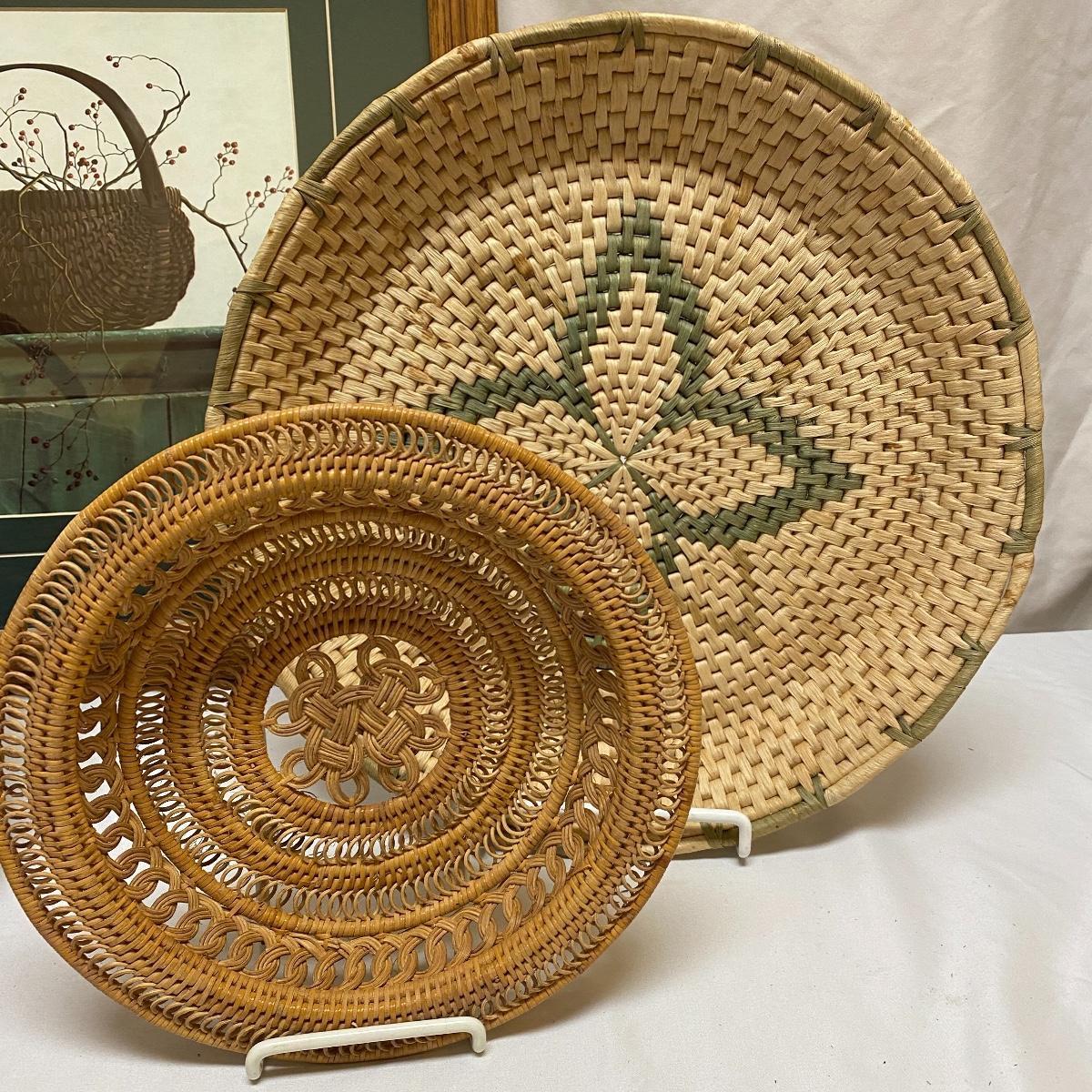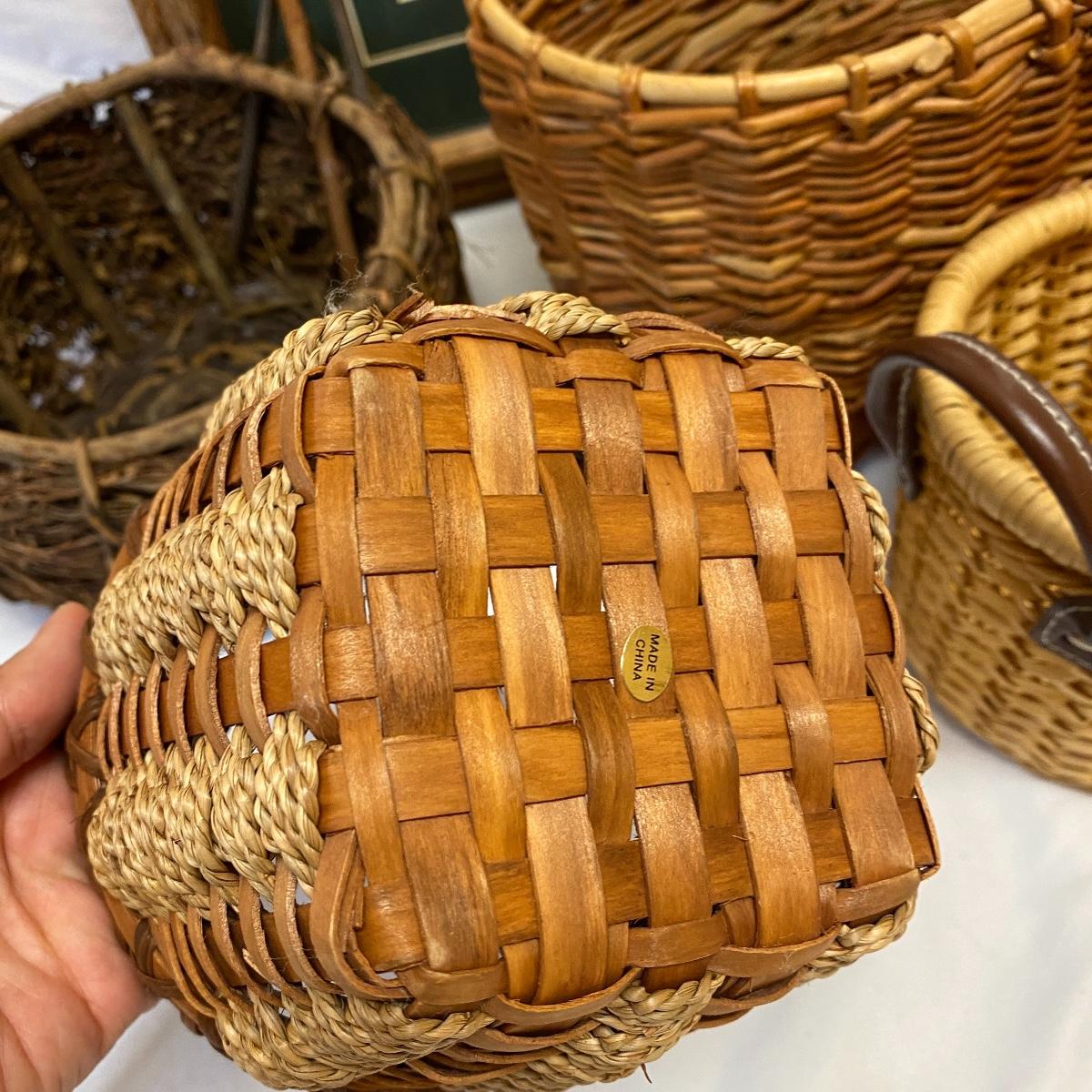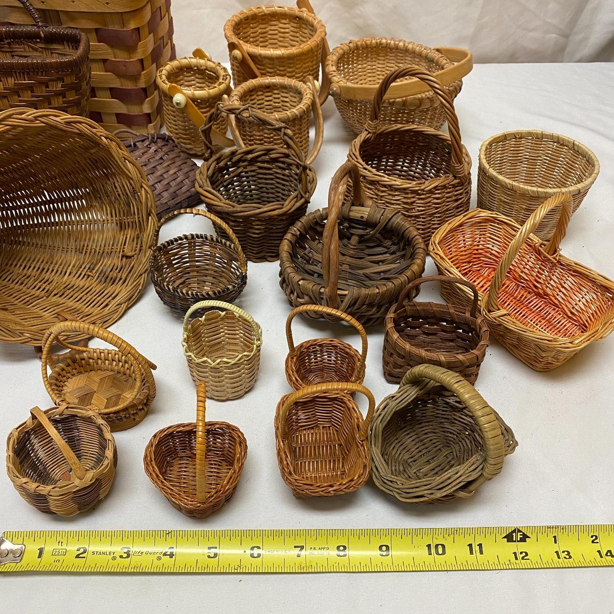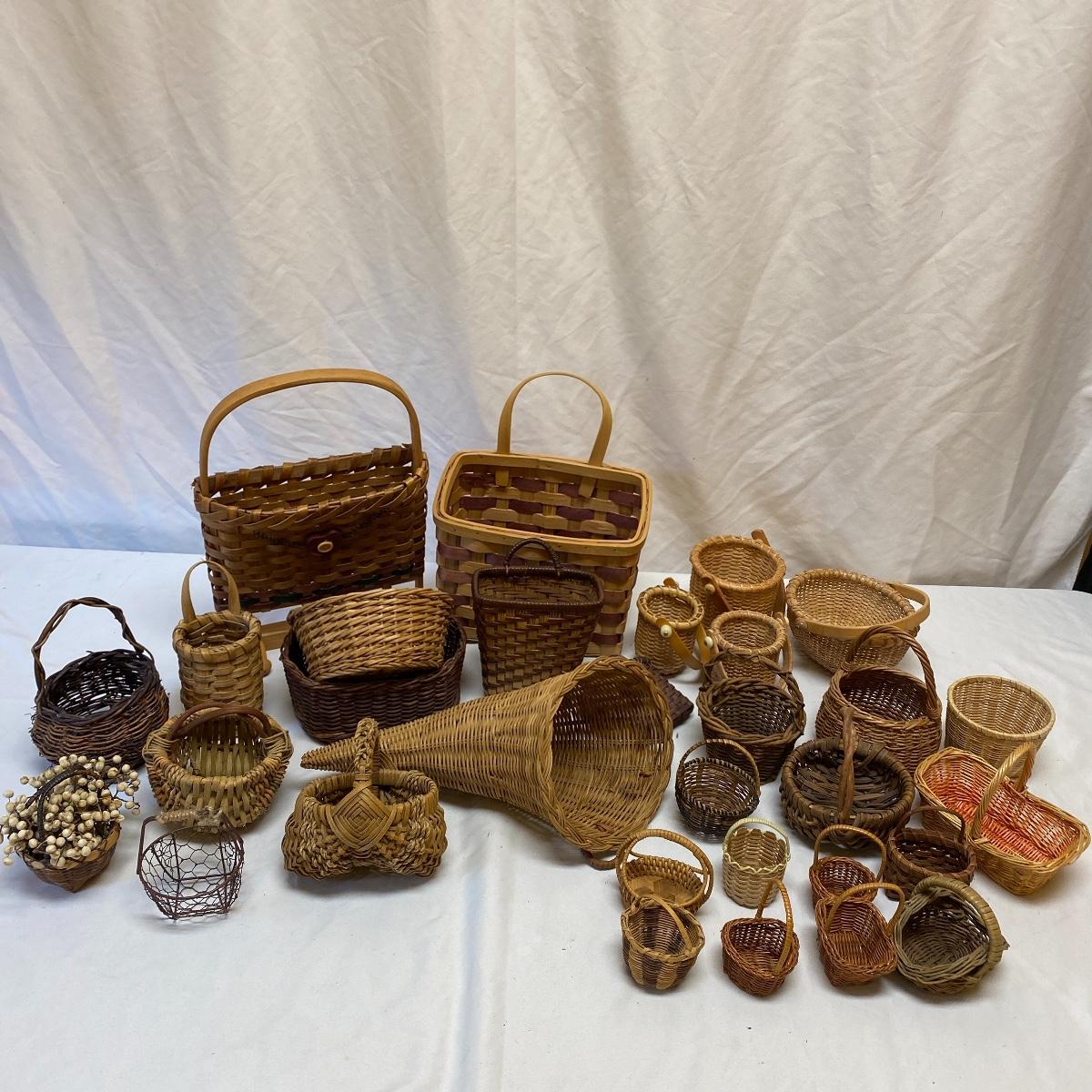 Lots of excellent baskets in the lot. Some have handles. Some have metal. There are a ton of tiny miniatures. There is a nice variety here. There are even two platter sized ones that can be hung on the wall to stay with the trends. Largest platter is. 14.5” diameter. Lot also includes an unsigned piece of framed art with a basket as the centerpiece. It measures 23” x 19”. There is a variety of shapes and sizes here so come take a look at all the baskets included in this lot during preview. Local pick up only. The pink bin full of small baskets is included to help with transport. Local pick-up only.