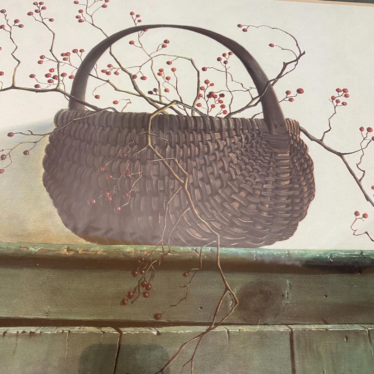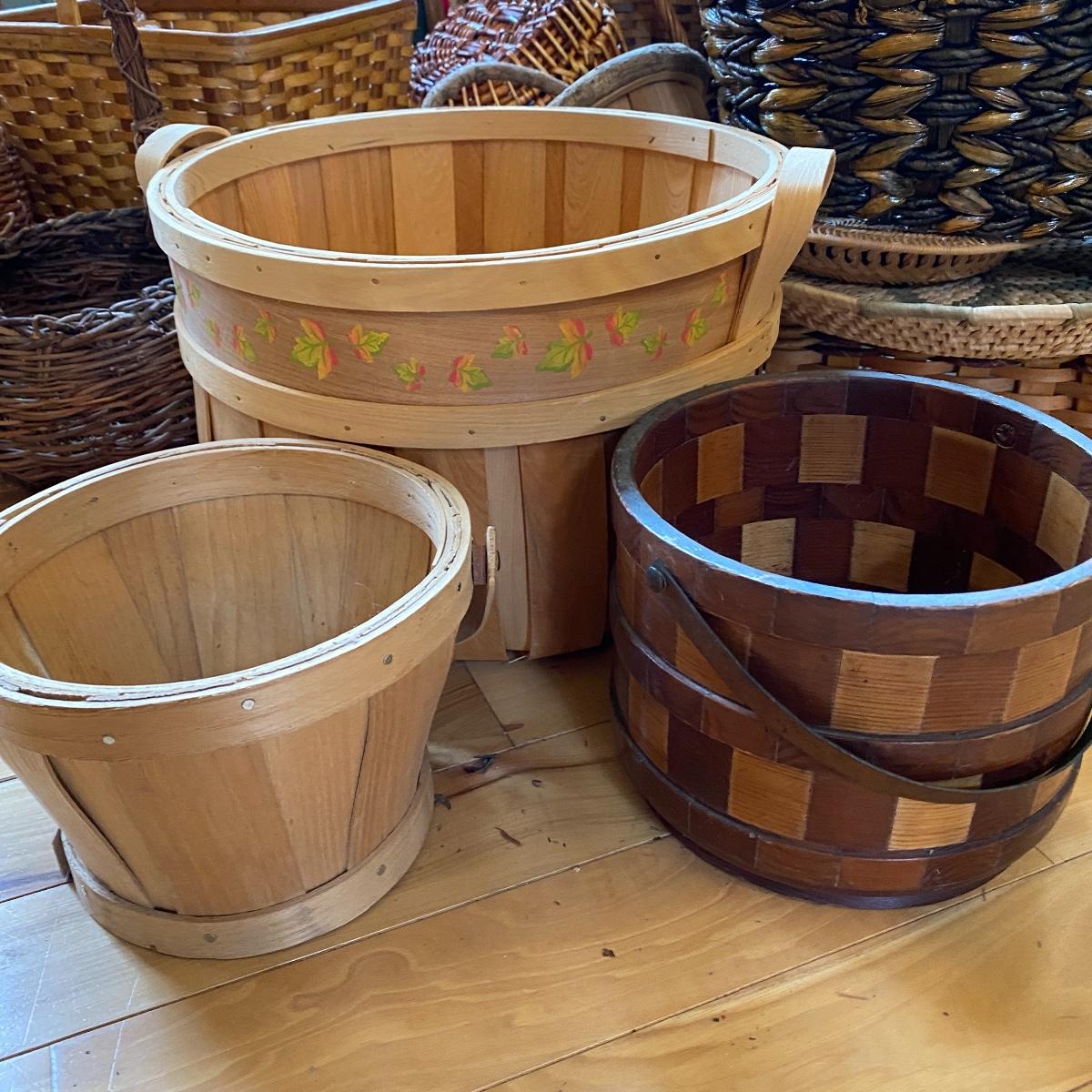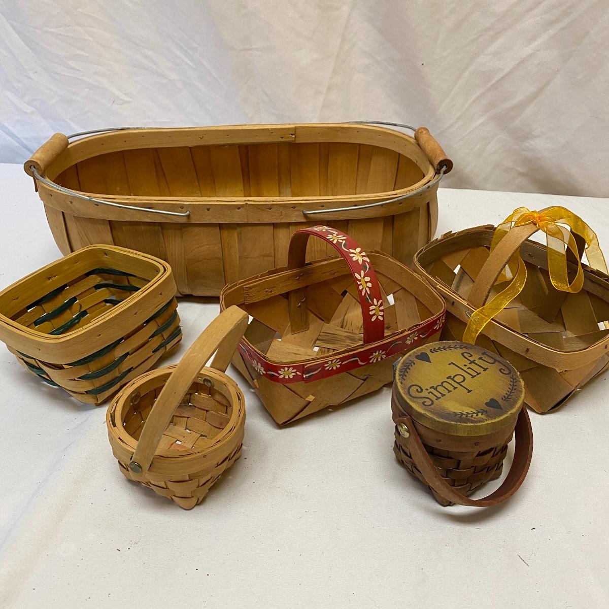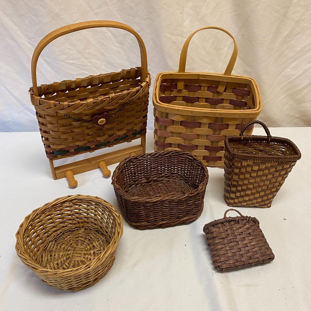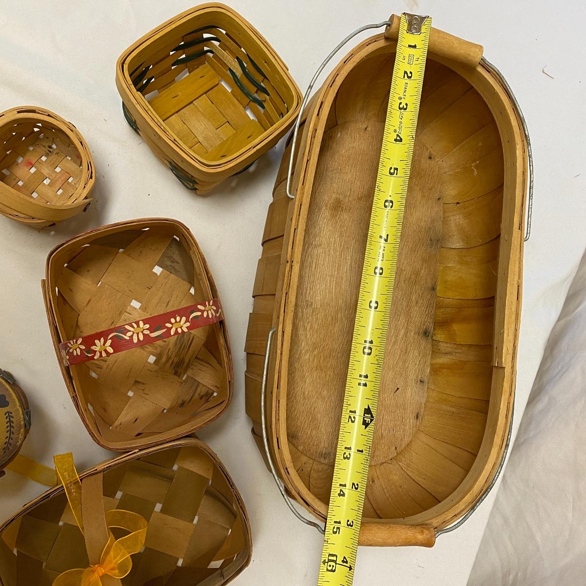 Lots of excellent baskets in the lot. Some have handles. Some have metal. There are a ton of tiny miniatures. There is a nice variety here. There are even two platter sized ones that can be hung on the wall to stay with the trends. Largest platter is. 14.5” diameter. Lot also includes an unsigned piece of framed art with a basket as the centerpiece. It measures 23” x 19”. There is a variety of shapes and sizes here so come take a look at all the baskets included in this lot during preview. Local pick up only. The pink bin full of small baskets is included to help with transport. Local pick-up only.