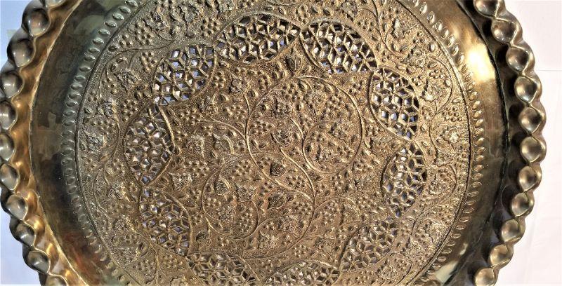 Large brass pierced design tray or wall hanging. 30" across. Good condition.