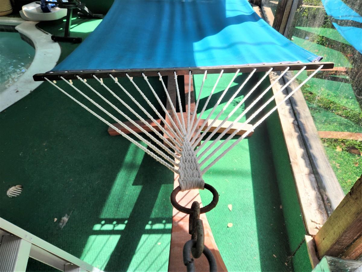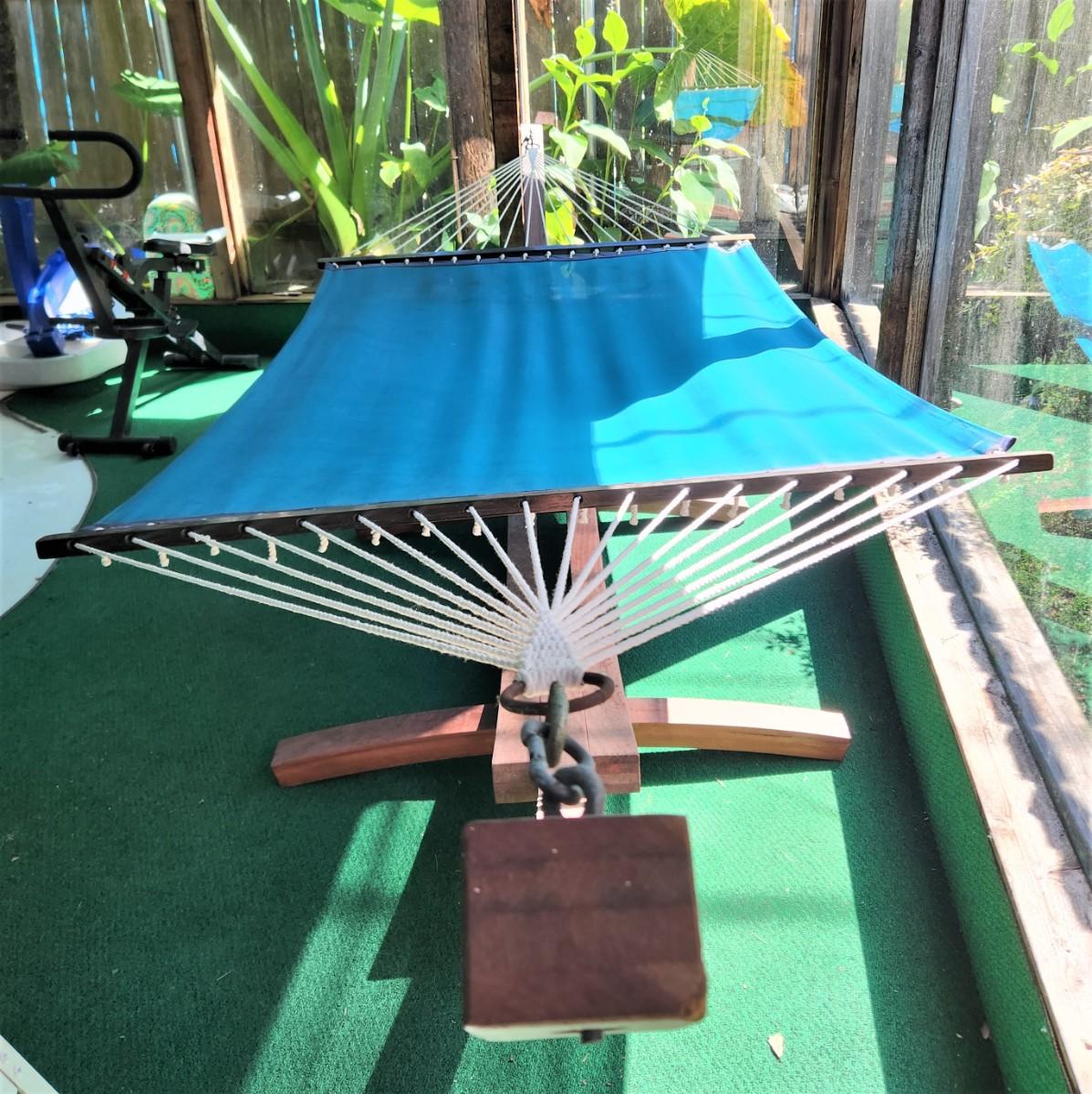 Frame is probably redwood, perhaps teak - large suspension hammock - 52" across, 80" long, Frame is 39" tall, 14 feet, 3 inches long. Frame held together with two bolts. Will likely need to be taken apart to remove from Florida room. Good condition.