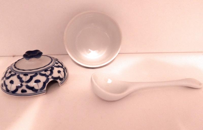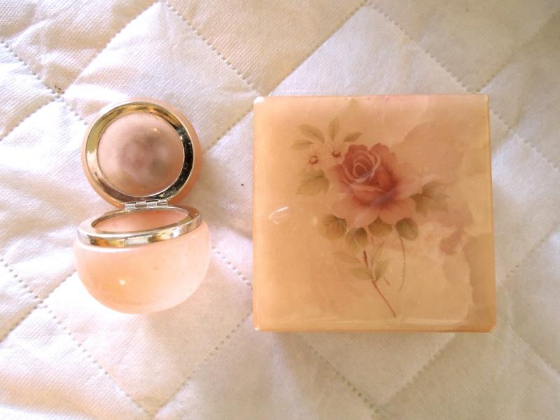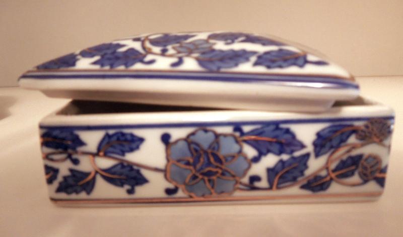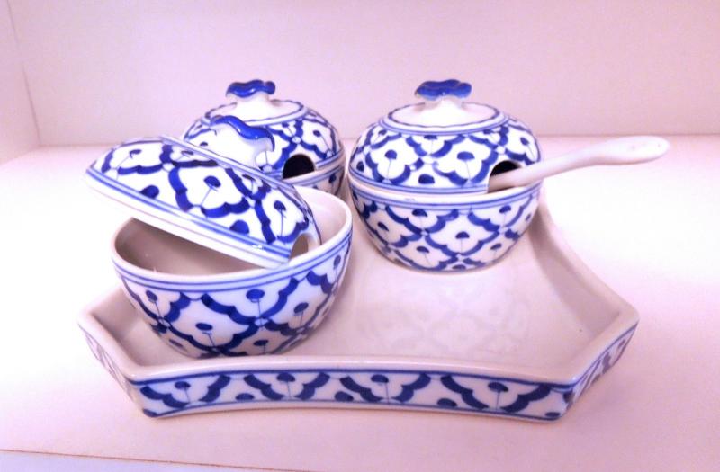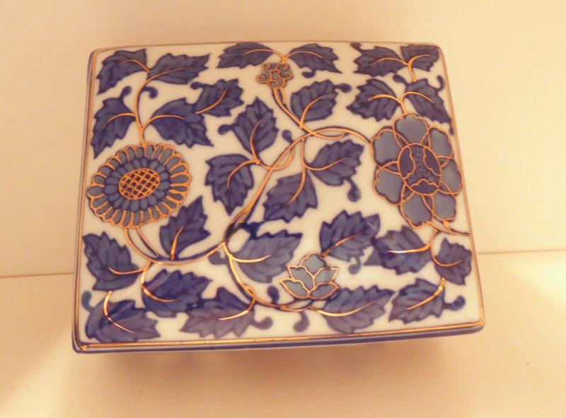 Pink square box with rose decal measures 3.5" x 3.5" for scale. Porcelain square box has gilded gold highlighting. Condiment tray with covered pots. One spoon. No chips or cracks. Like new.