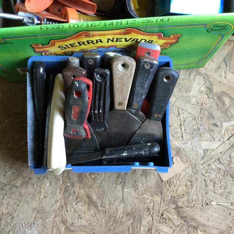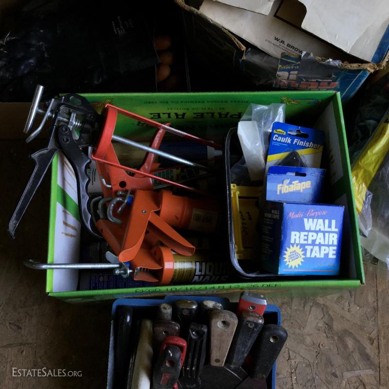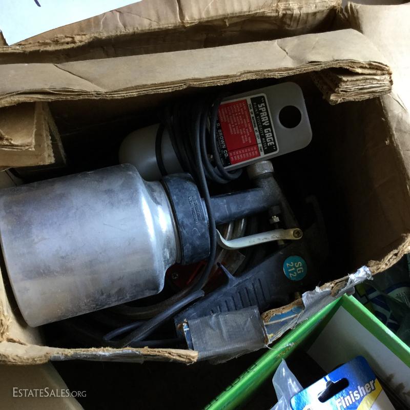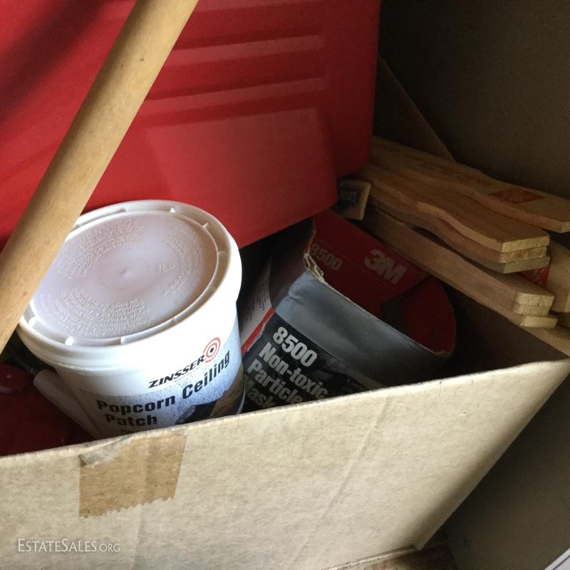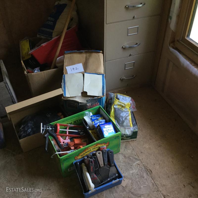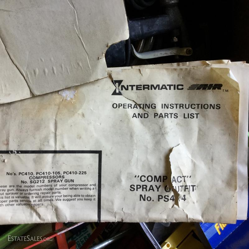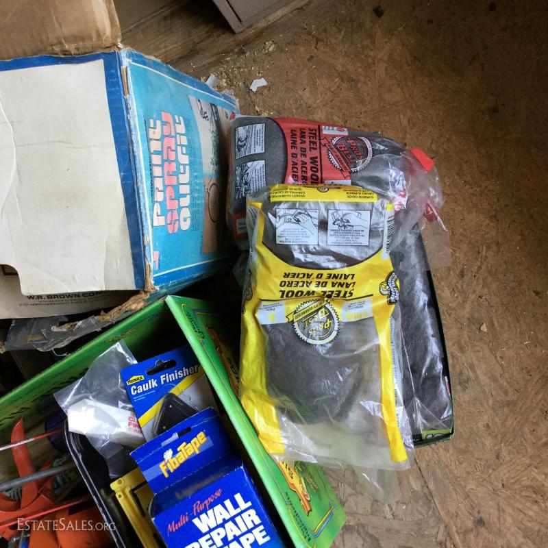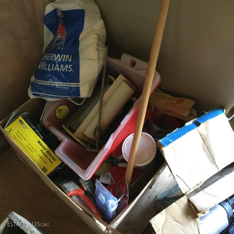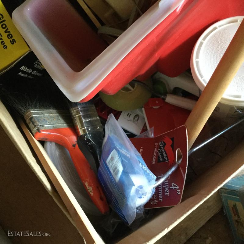 Large lot of painting supplies including Intermatic Compact Spray Outfit No. PS414, caulk guns, scrapers, brushes, rollers, rubber gloves, steel wool and many more accessories. This lot is available for local pick up in Hendersonville, NC only.
