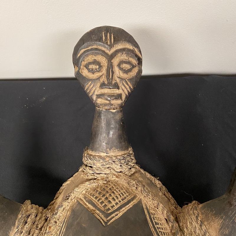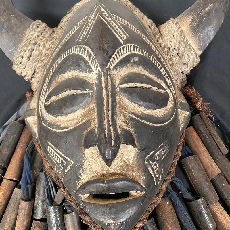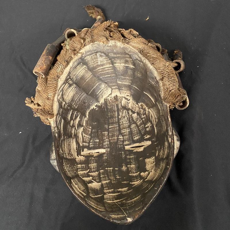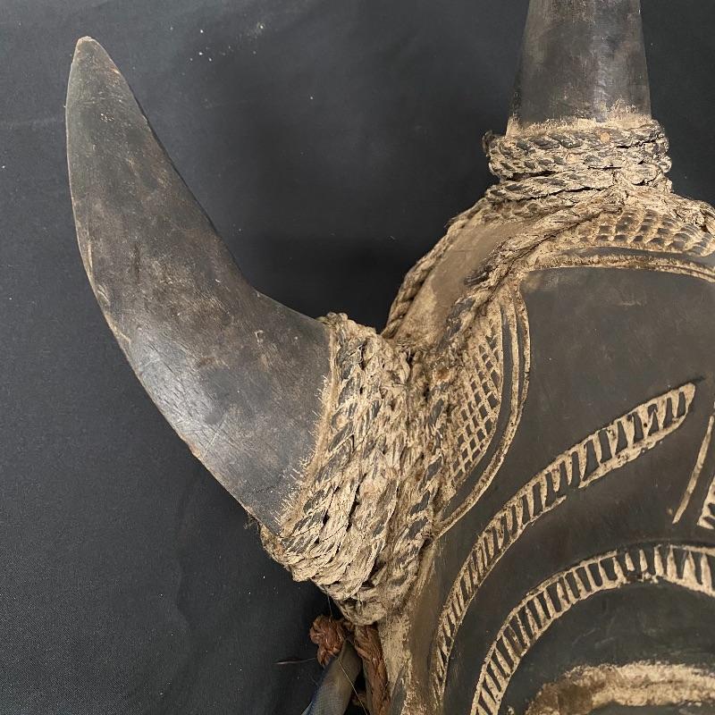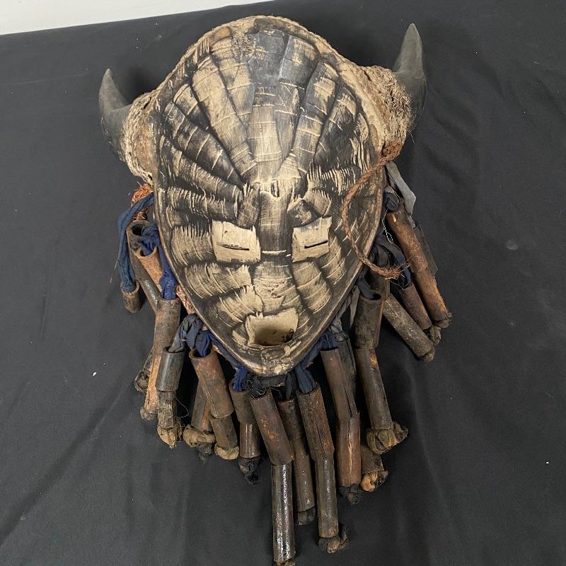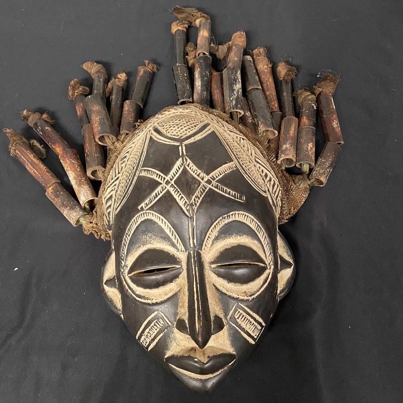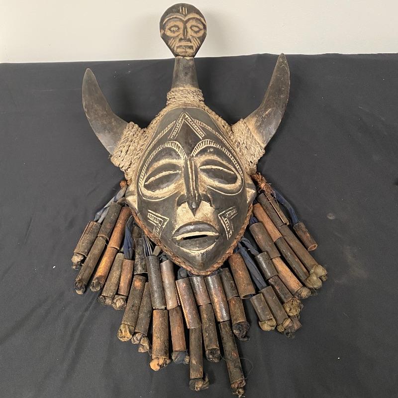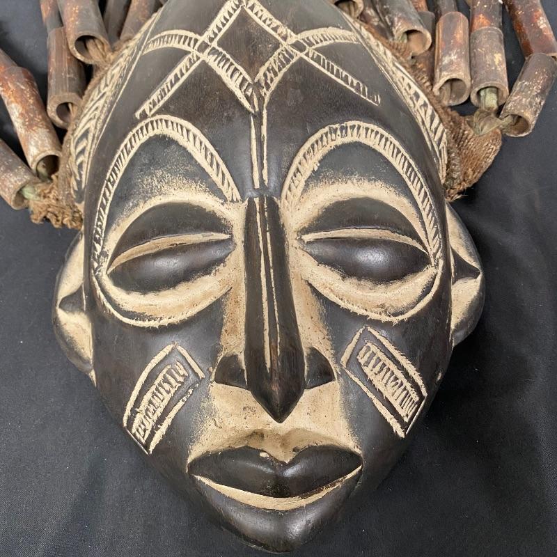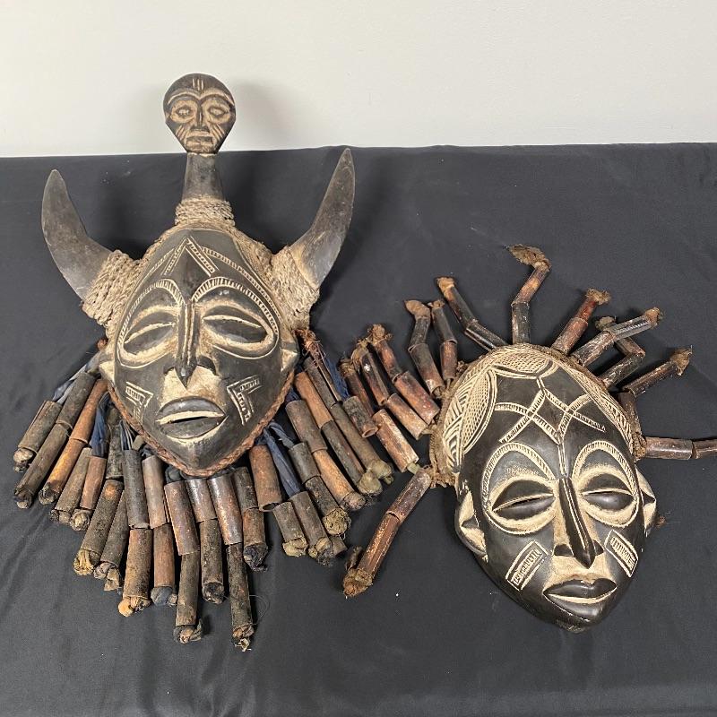 This lot includes two wooden masks with “hair” made out of bamboo. One has the “hair” at the top of the face and one has them under the chin. The male mask measures about 20in x 15in and the female mask measures about 13in x 9in.