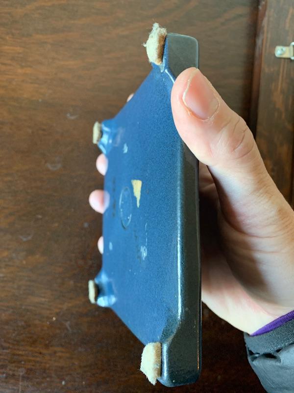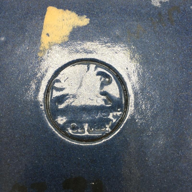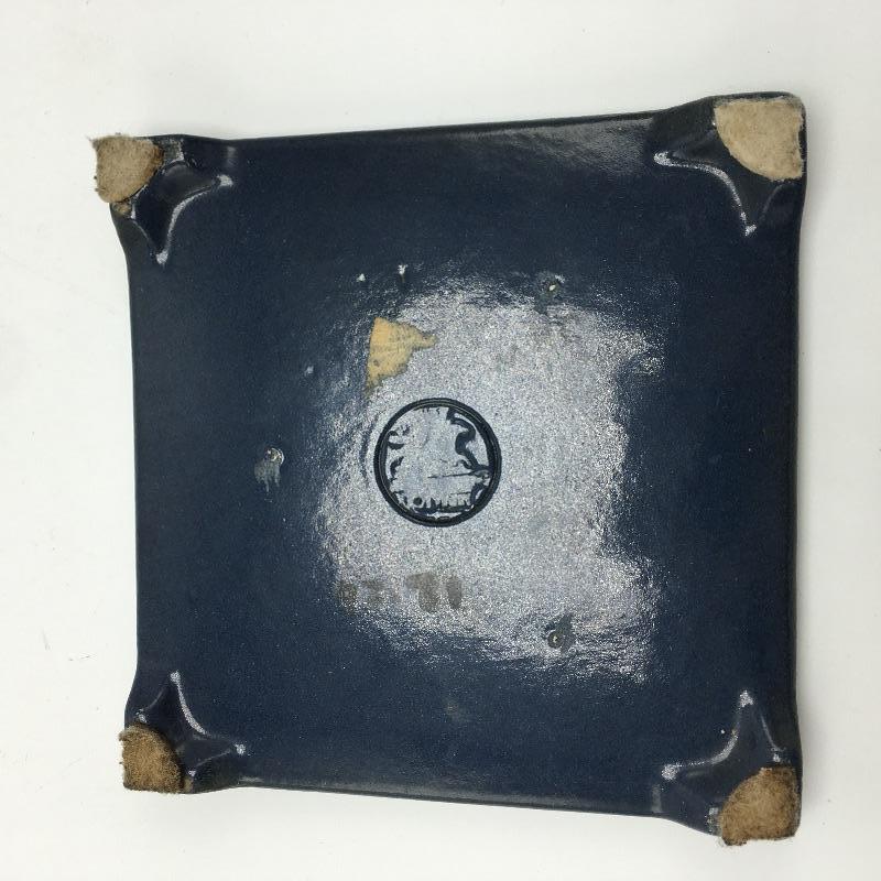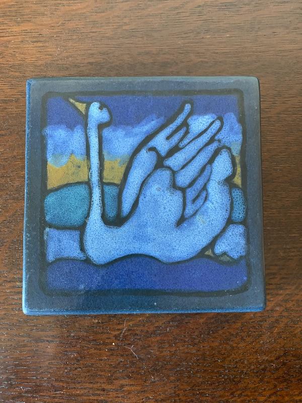 This Saturday Evening Girls, Revere trivet is a square tile with blues and greens decorated with image of a swan in a landscape, stamped mark Paul Revere Pottery. Felt pads on feet. No chips or stains noted .Tile measures 5.5” x 5.5”.