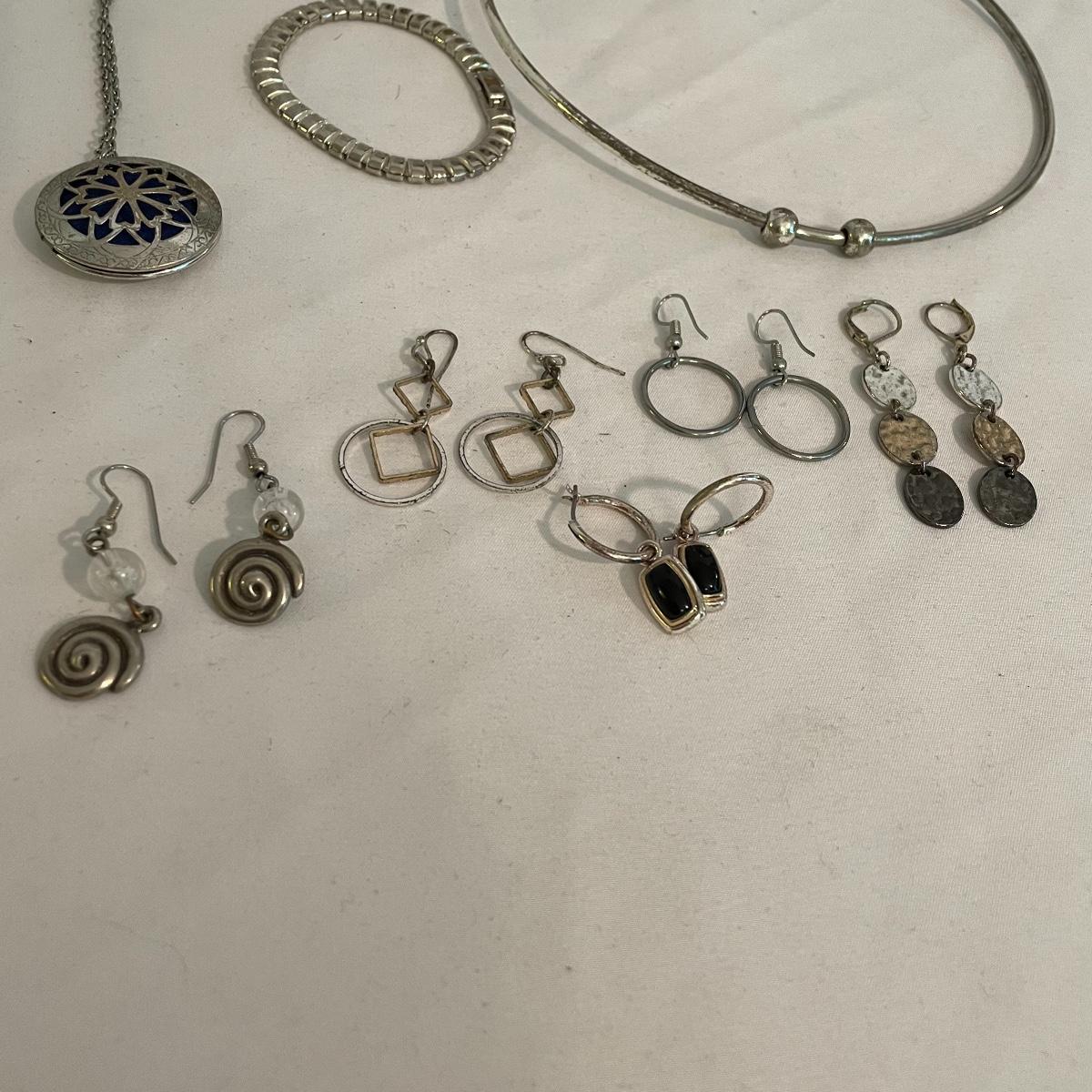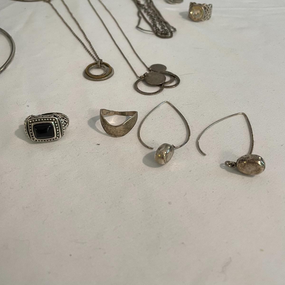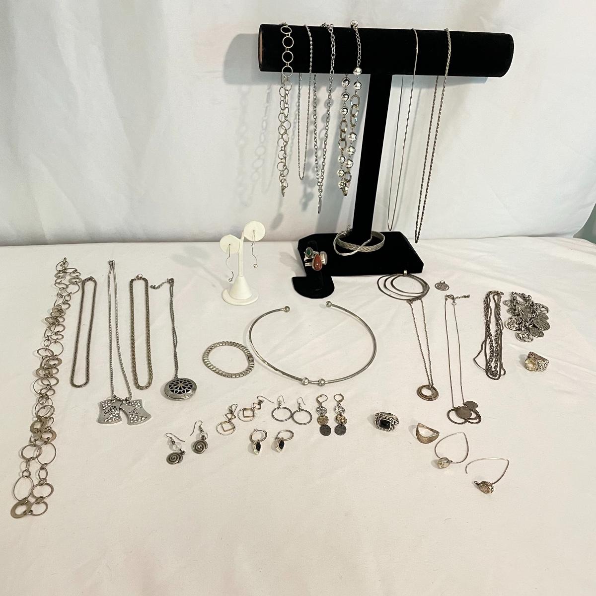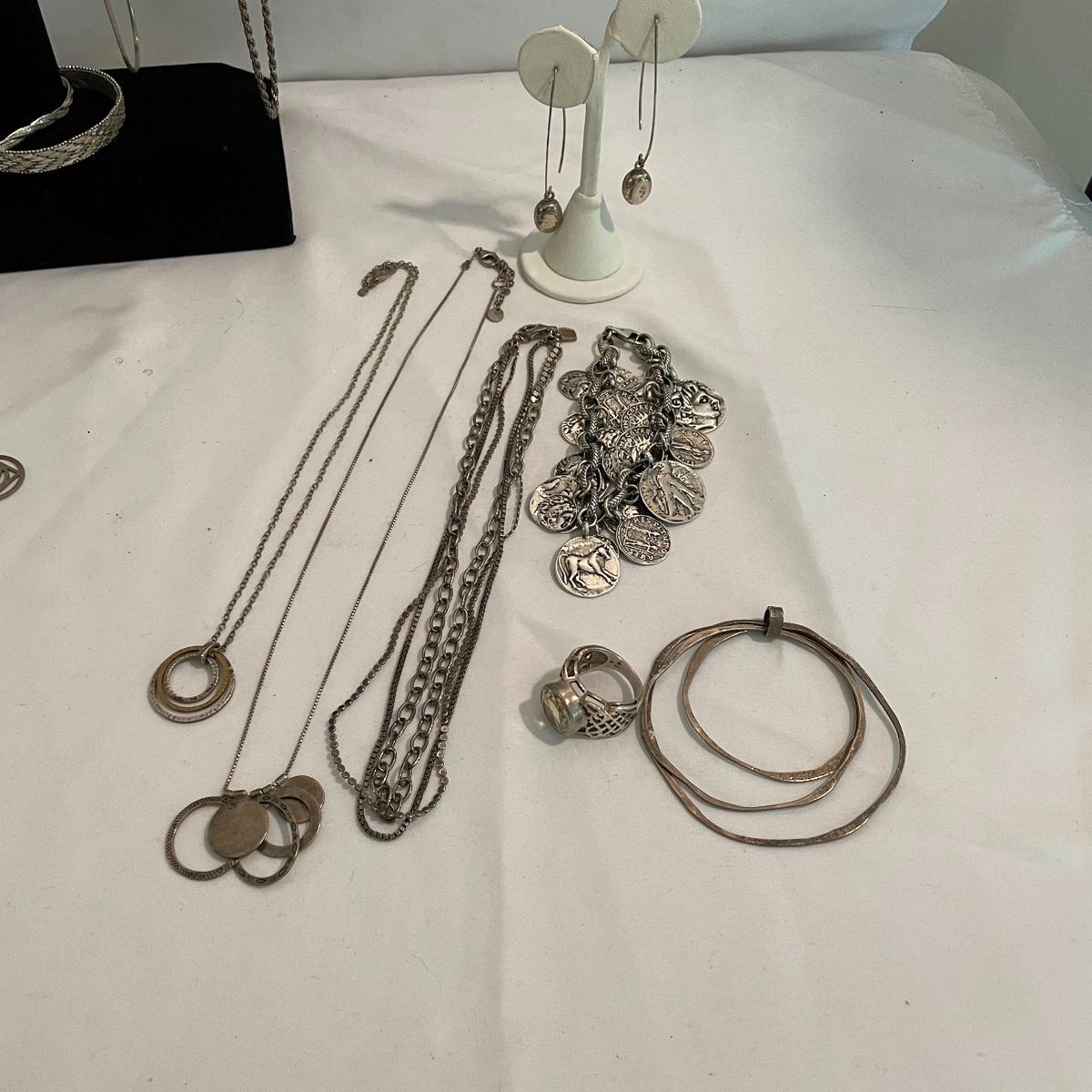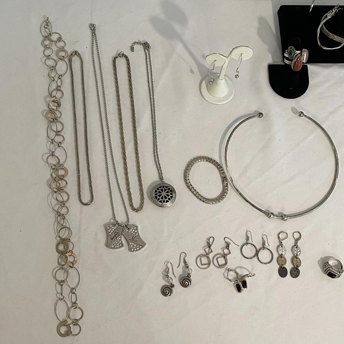 Here’s a fashionable selection of silver and silver colored jewelry to get get your looks anywhere from subtle to statement. A small selection of Silpada marked jewelry includes earrings, bracelet, three necklaces, one pendant and a ring. Other pieces marked 925 are shown in photos. A bold selection of rings with sparkles to amethyst and onyx style stones. Ring sizes shown in images. Shipping available.