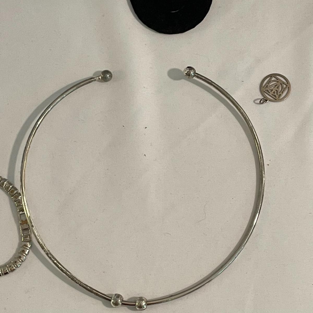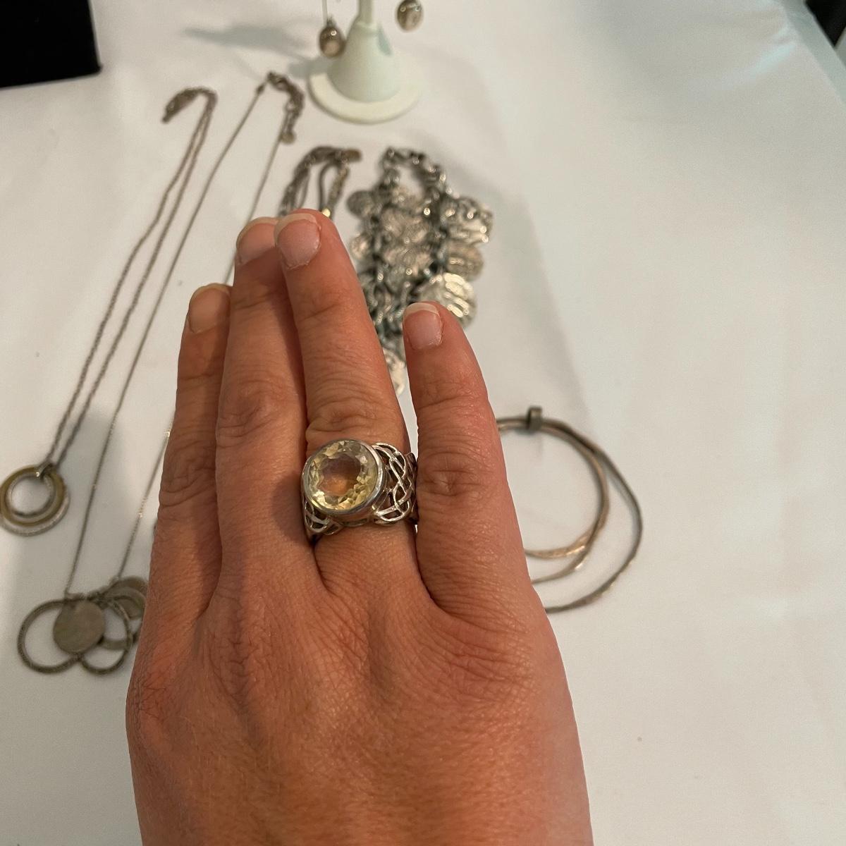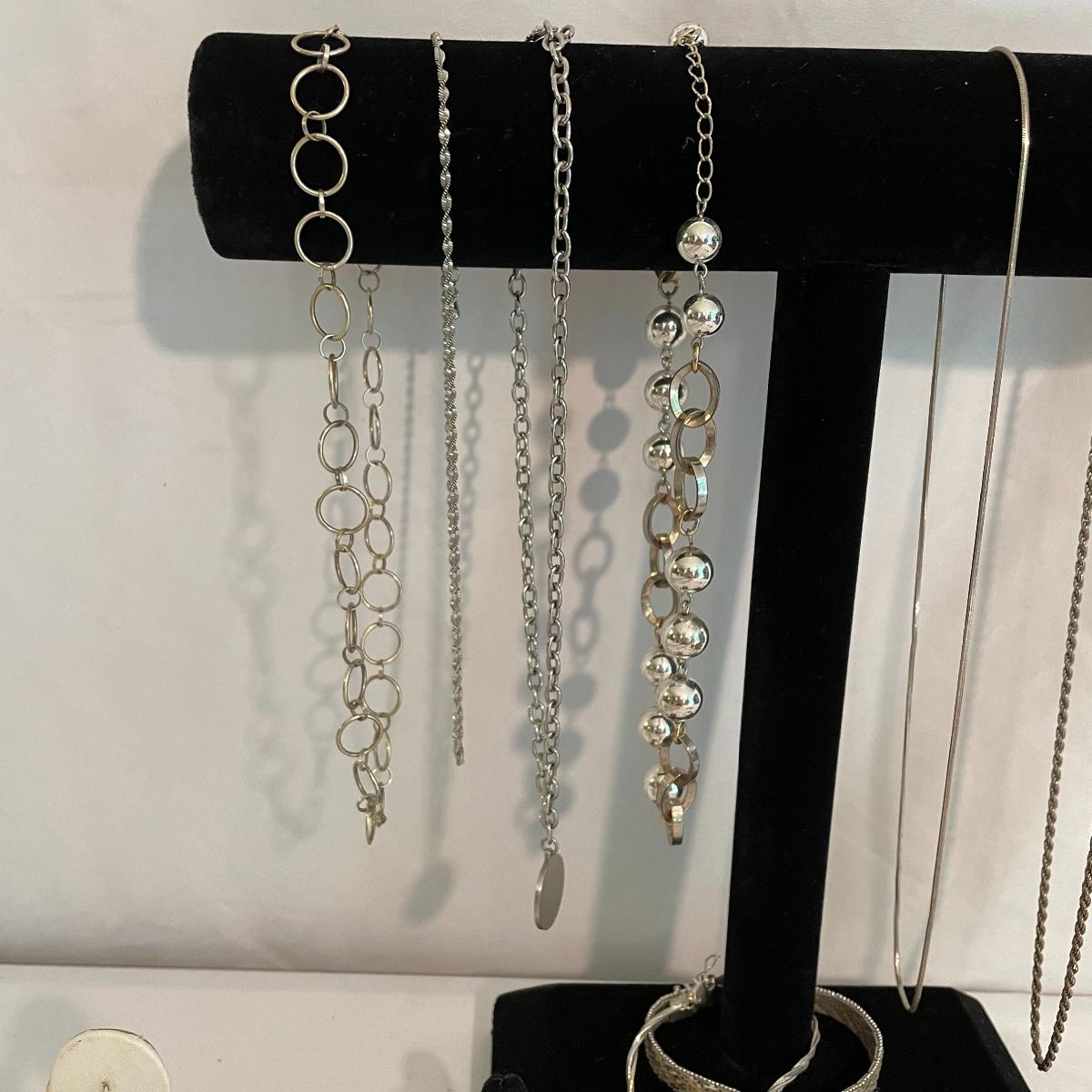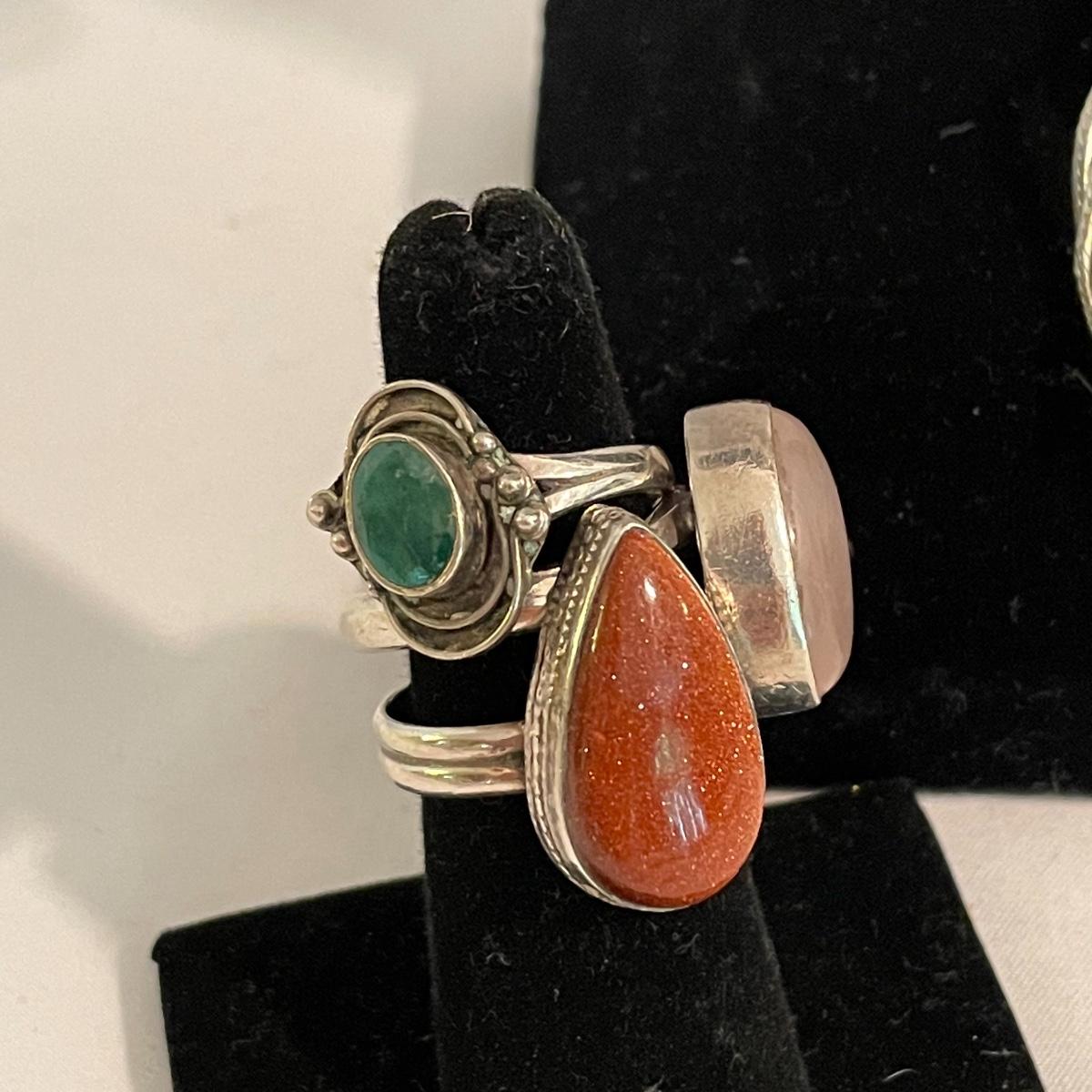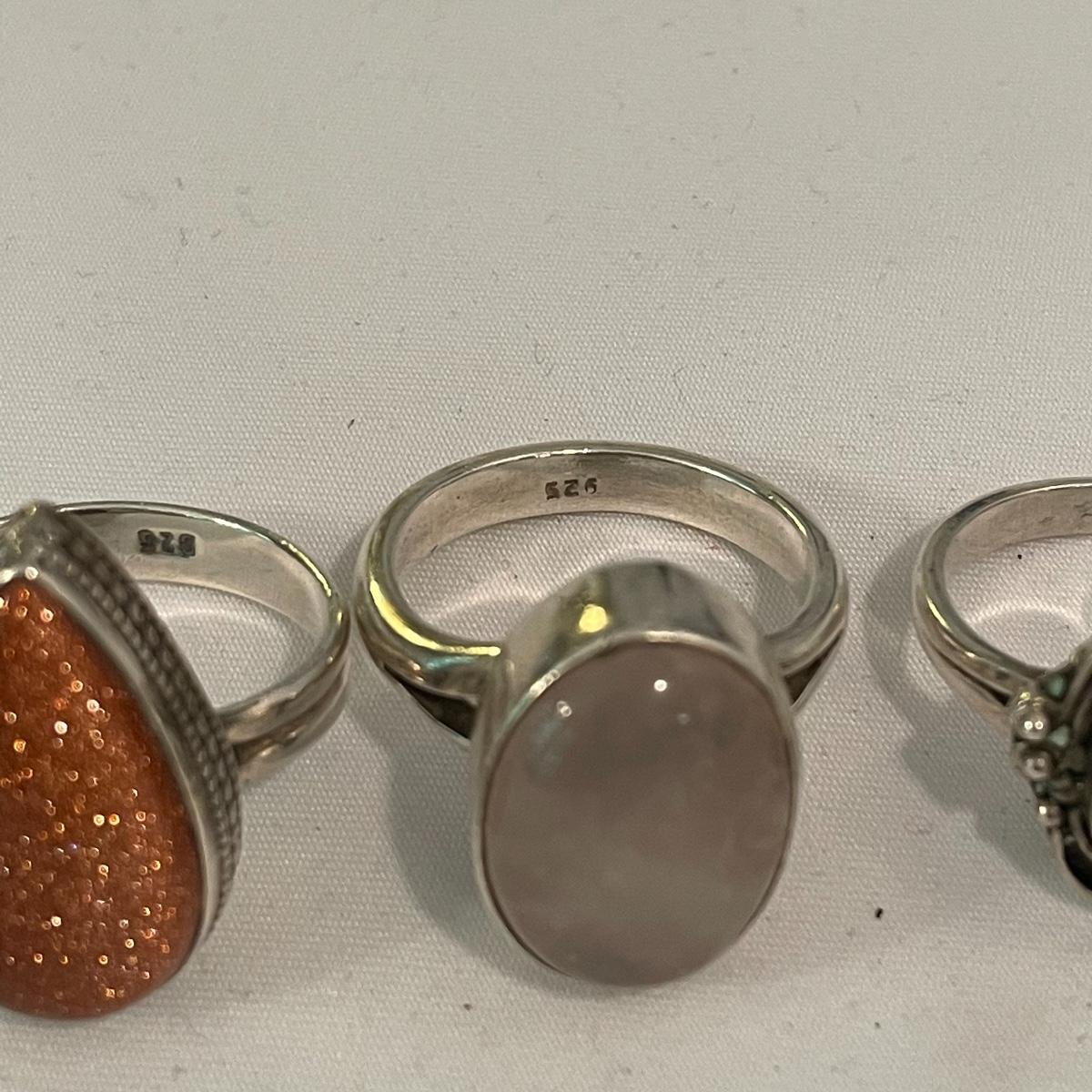 Here’s a fashionable selection of silver and silver colored jewelry to get get your looks anywhere from subtle to statement. A small selection of Silpada marked jewelry includes earrings, bracelet, three necklaces, one pendant and a ring. Other pieces marked 925 are shown in photos. A bold selection of rings with sparkles to amethyst and onyx style stones. Ring sizes shown in images. Shipping available.