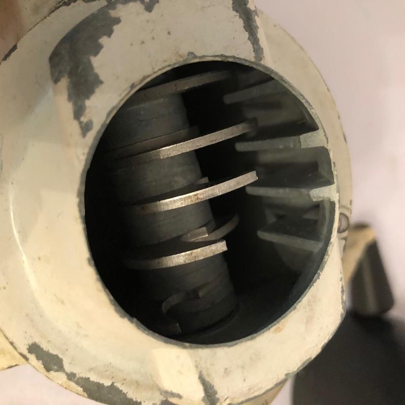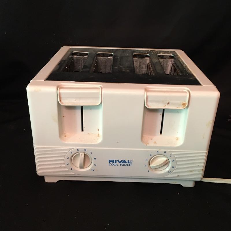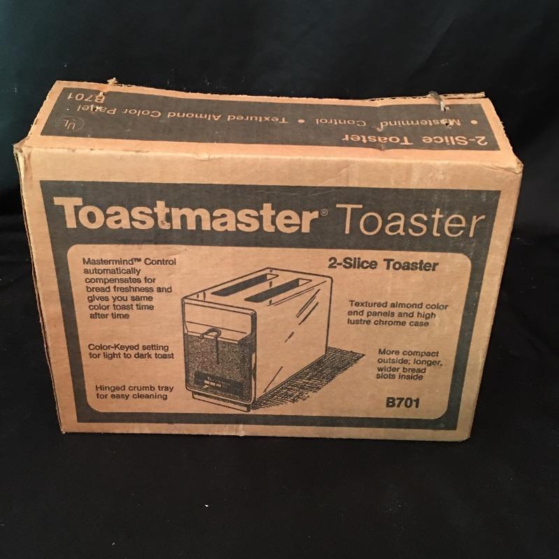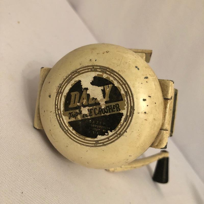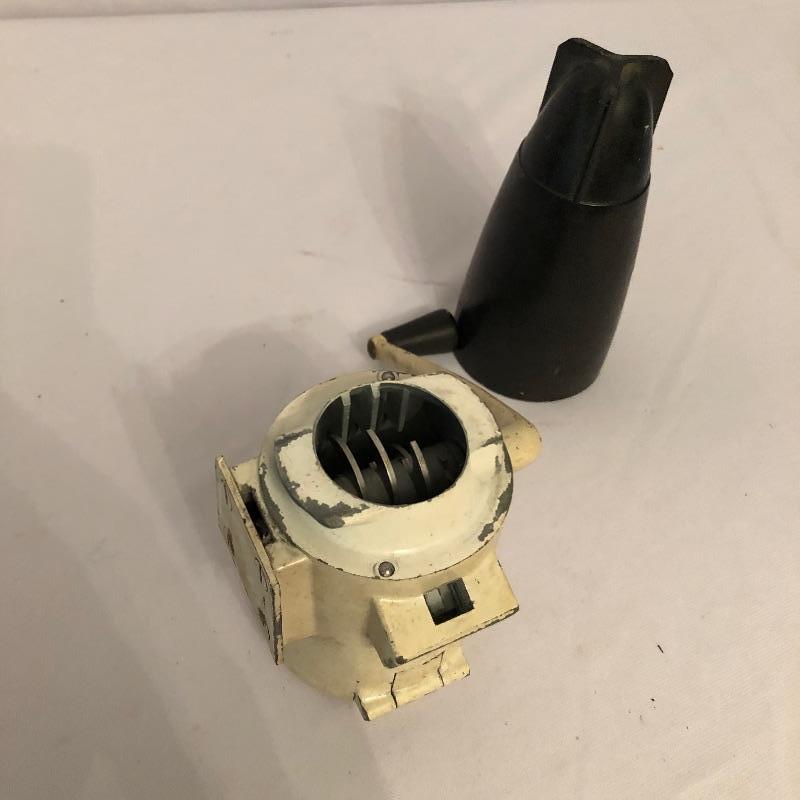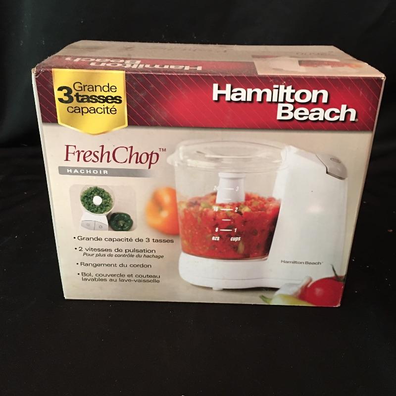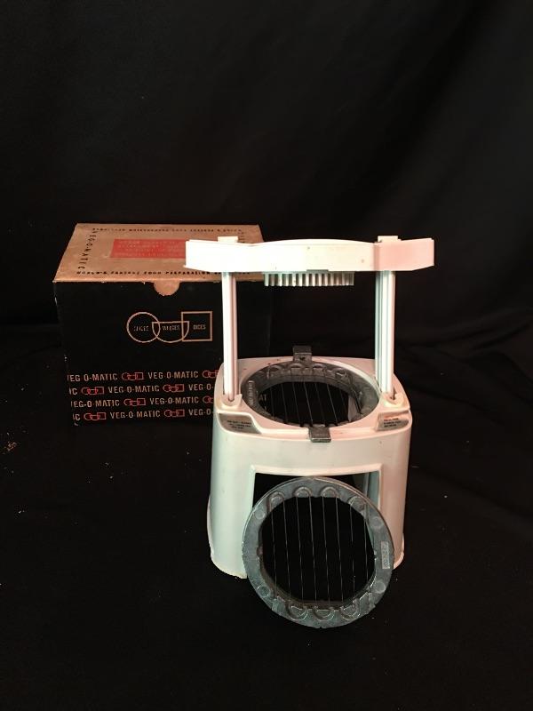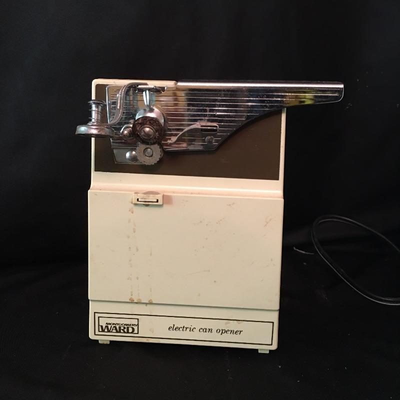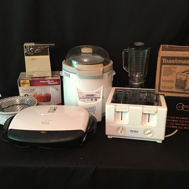 A great piece of nostalgia with this vintage ice crusher that accompanies a super assortment of small appliances that includes electric can opener, NIB Toastmaster, Hamilton Beach Fresh Chop, Veg-O-Matic, George Foreman Grilling Machine, Osterizer blender, Turbo Baker and more. A great way to get the small appliances you need in one fell swoop. The Hamilton Beach Fresh Chop is new and in a sealed box, all other appliances powered on when tested. The ice crusher was intended to be mounted but would need a bracket to do so.
