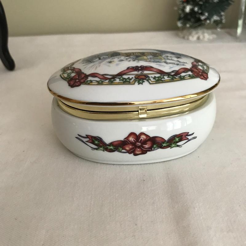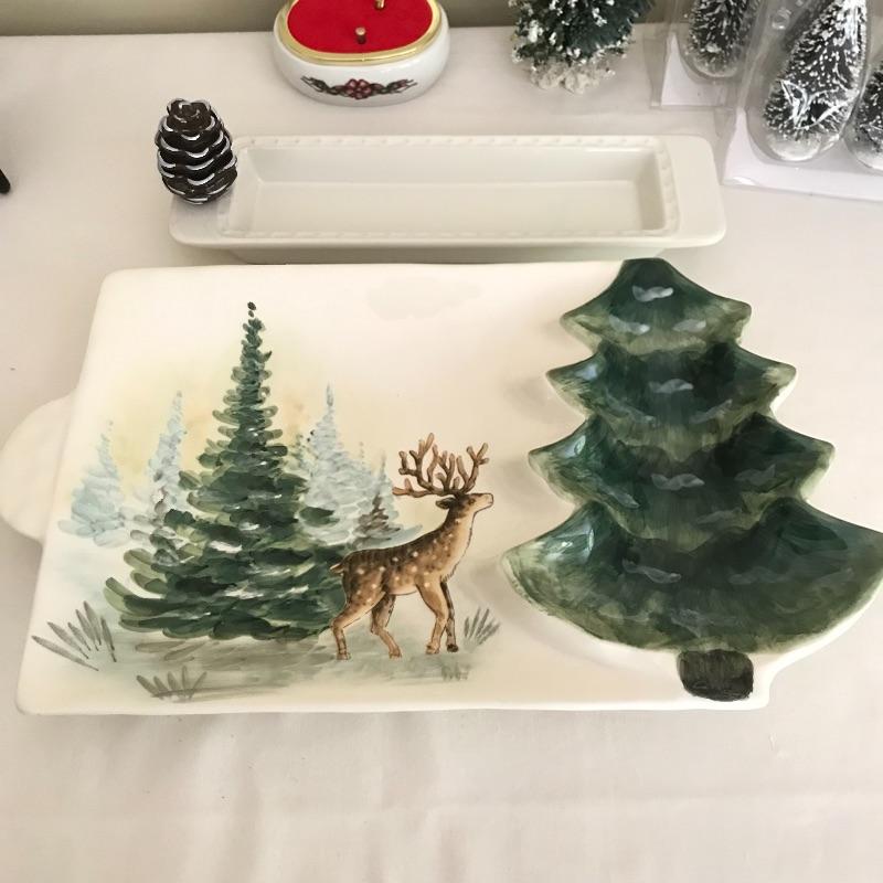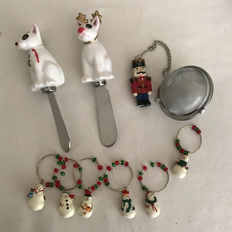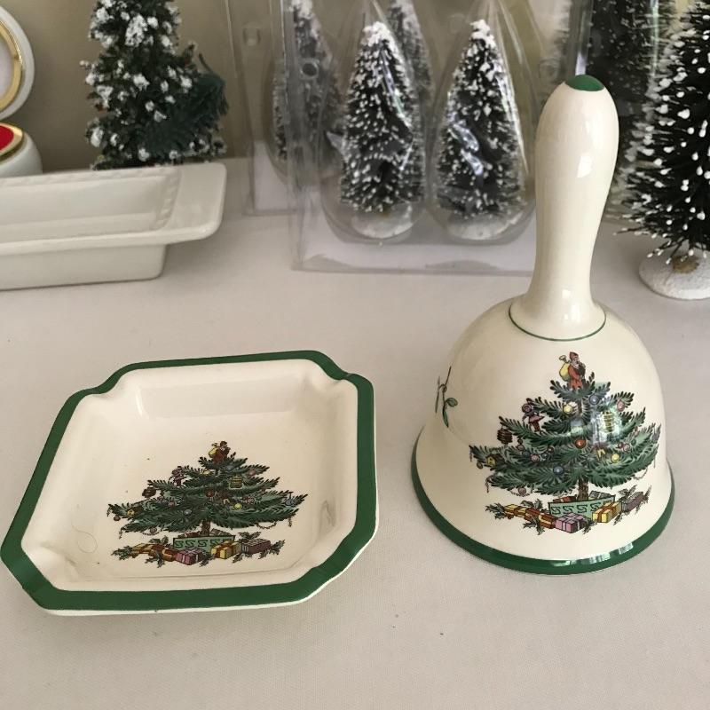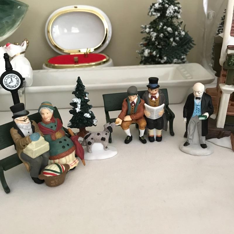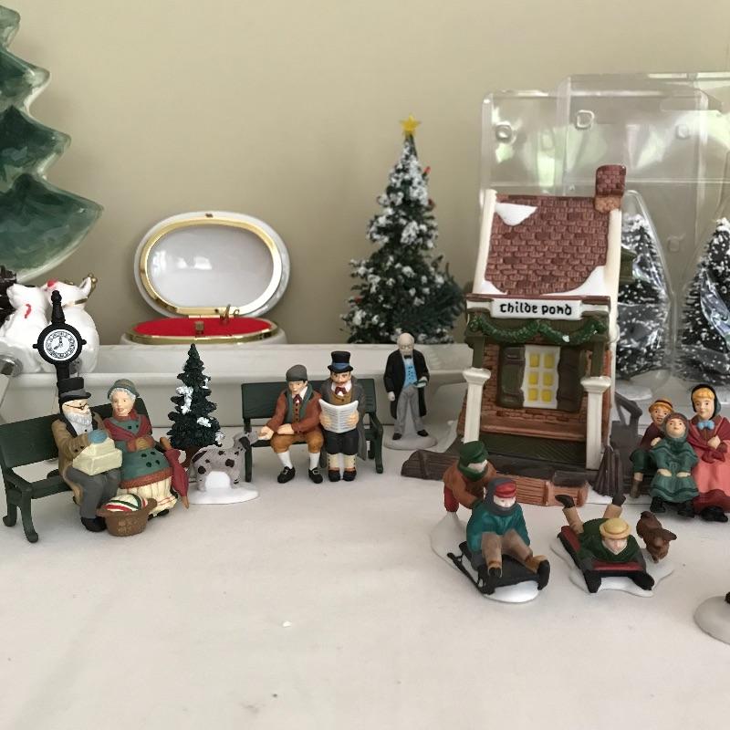 Decor and serving Christmas items to brighten up your next holiday season! Spode bell and ashtray set. Five Heritage Village collections, some figures not included, see photos. Extra mini trees, benches and clocks. Three serving platters, wine glass markers, and more! The David Russell fine porcelain music box plays beautifully. Shipping available.