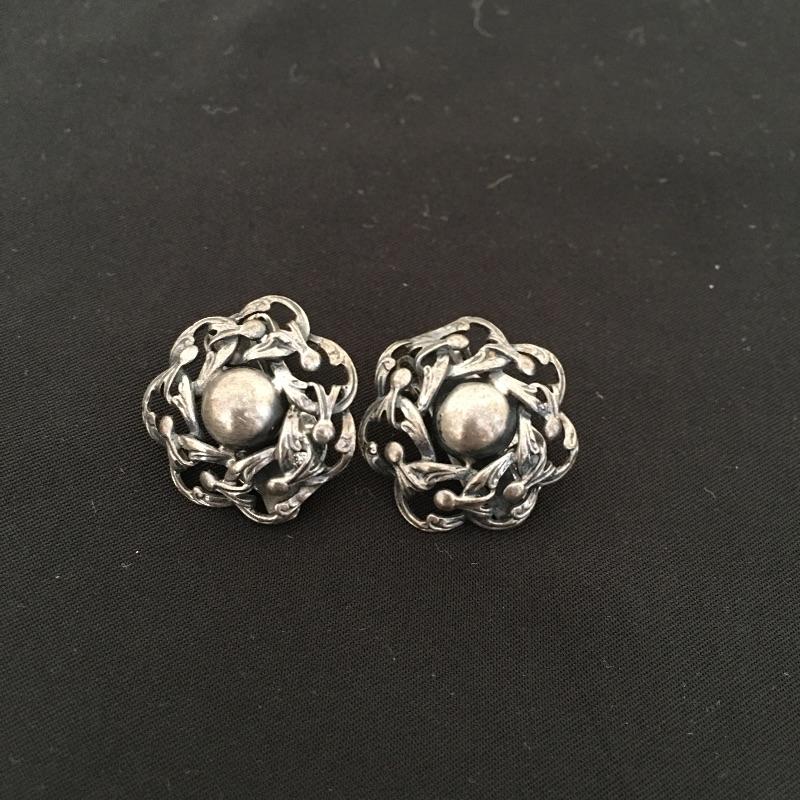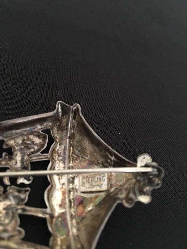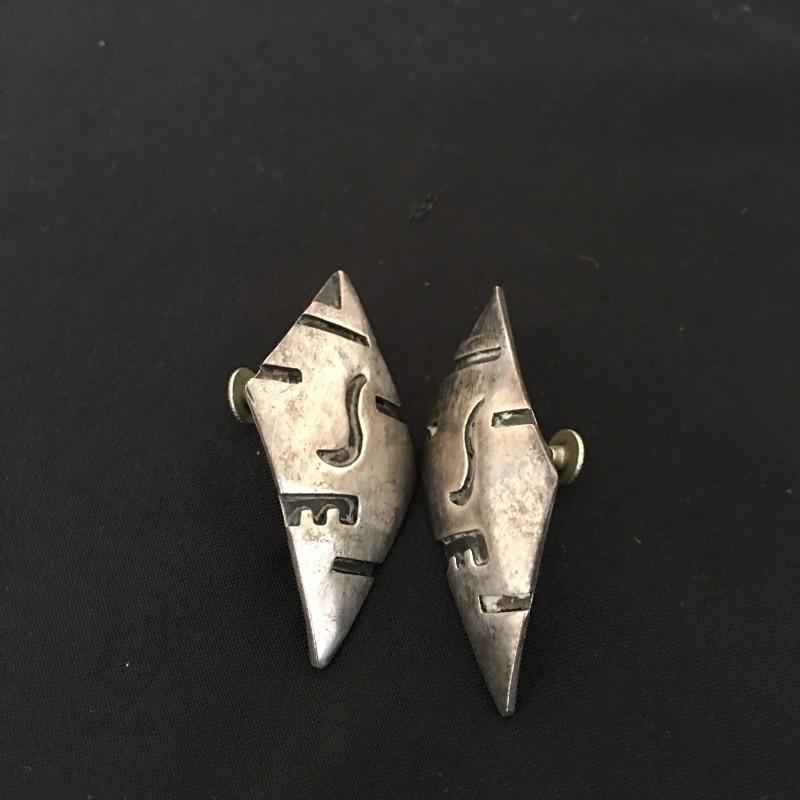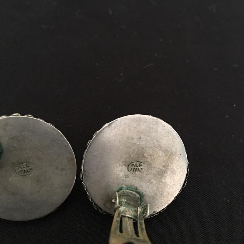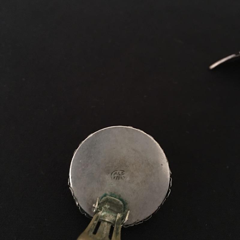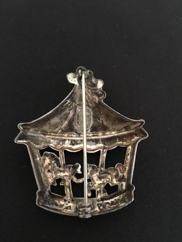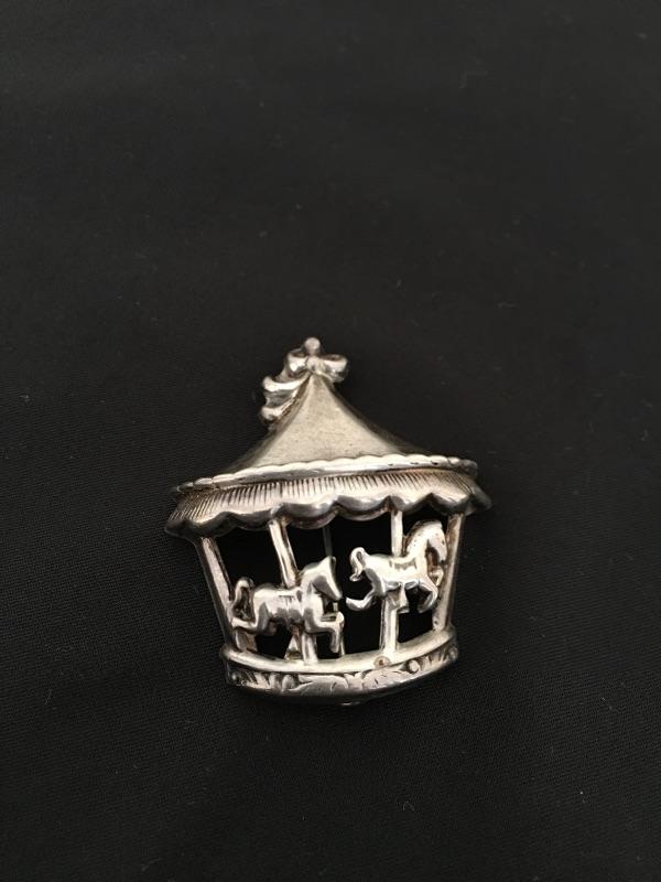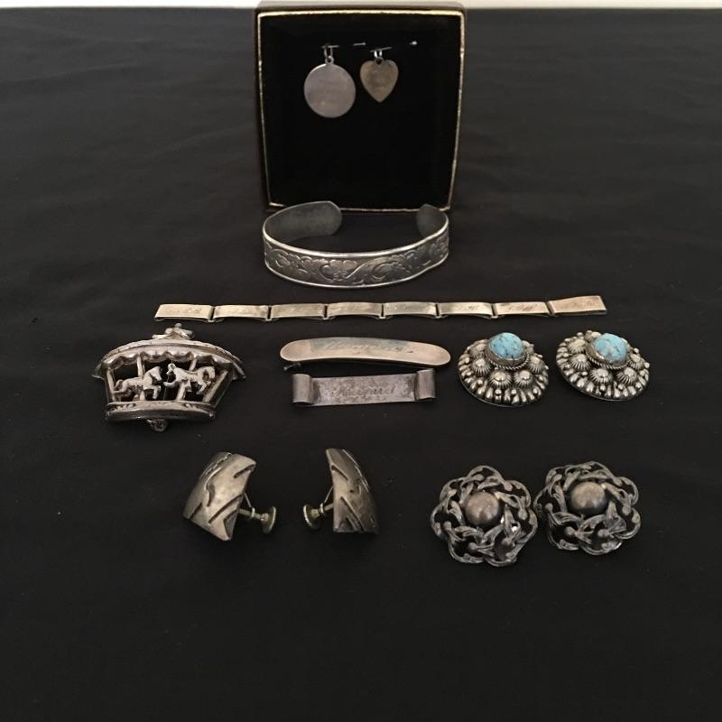 A classic collection of sterling jewelry that includes a charm, pair of clip on earrings, two bracelets, carousel pin and two name tag pins, that are all marked sterling and one pair of clip on earrings marked 925 HechoinMexico. Also includes charm and clip on earrings marked ALP Italy. Solid bracelet has crack, see pictures.