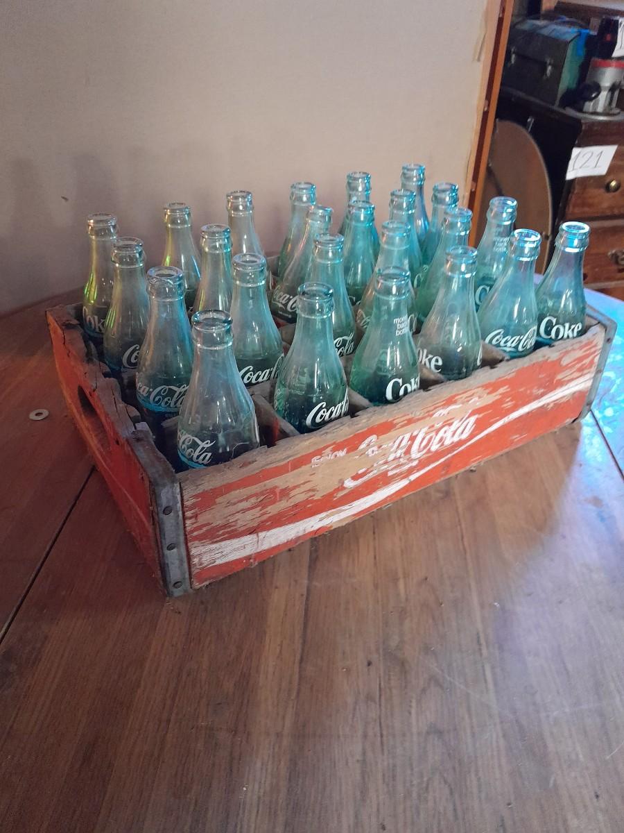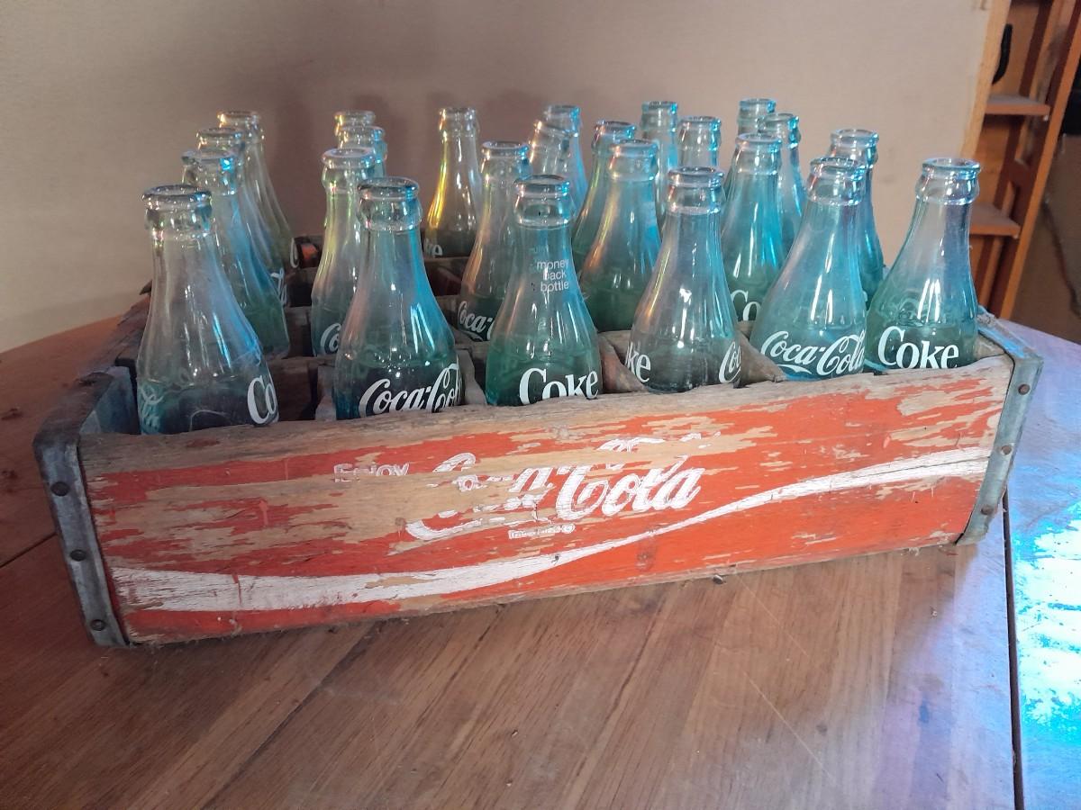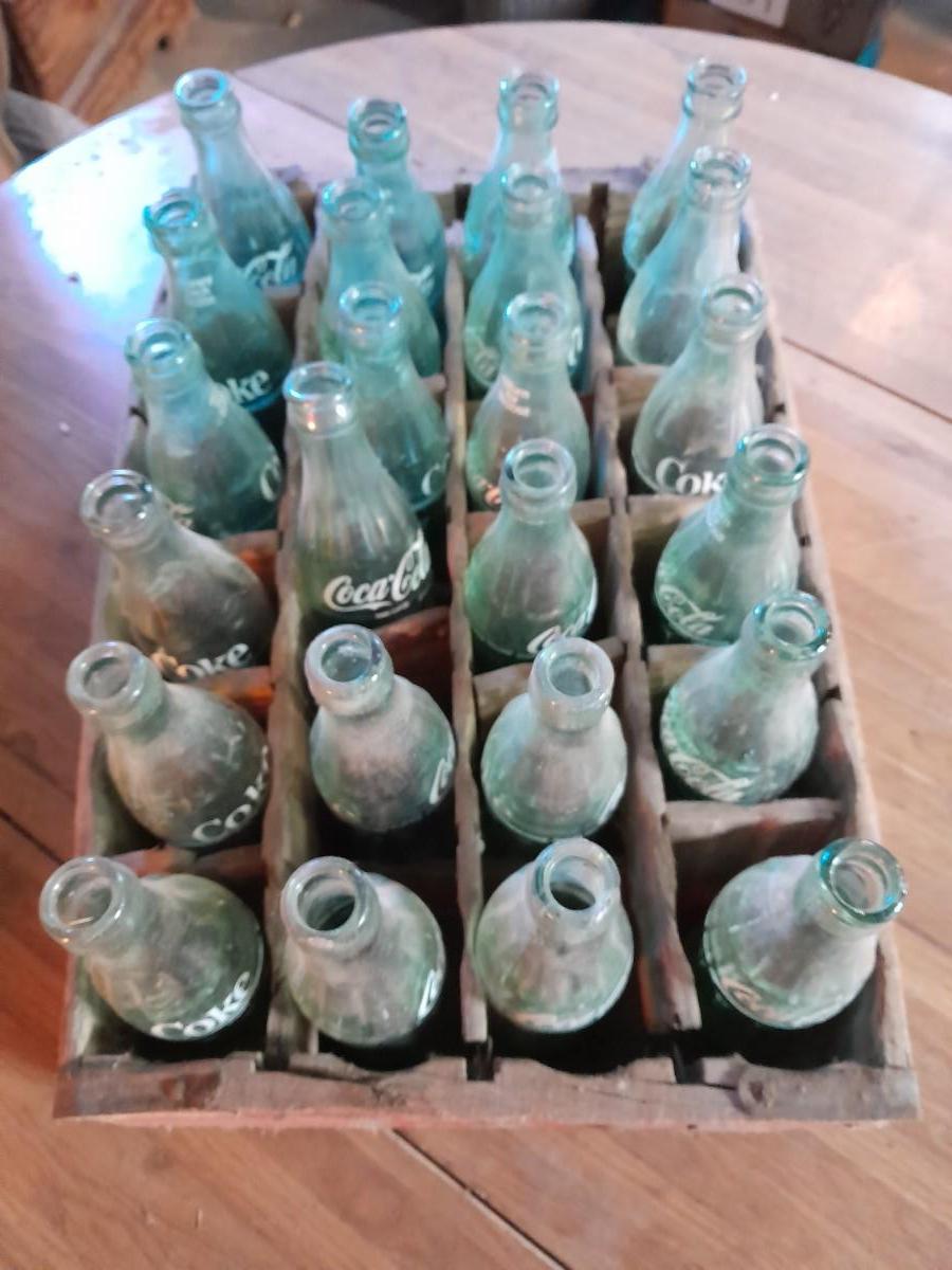 VINTAGE GLASS COKE BOTTLES IN WOODEN COCA-COLA CRATE, THE COKE BOTTLES ARE FROM DIFFERENT FACTORIES AROUND THE STATES