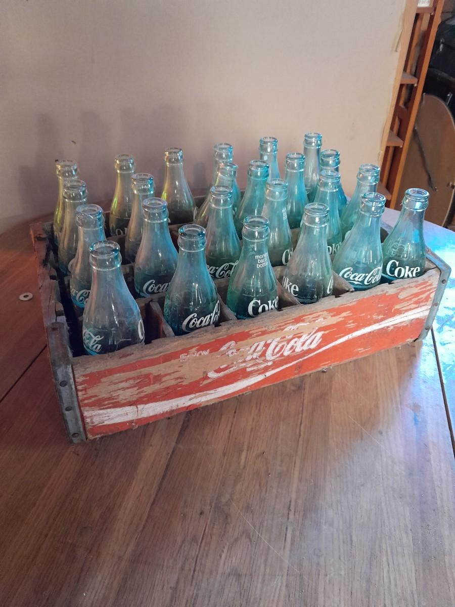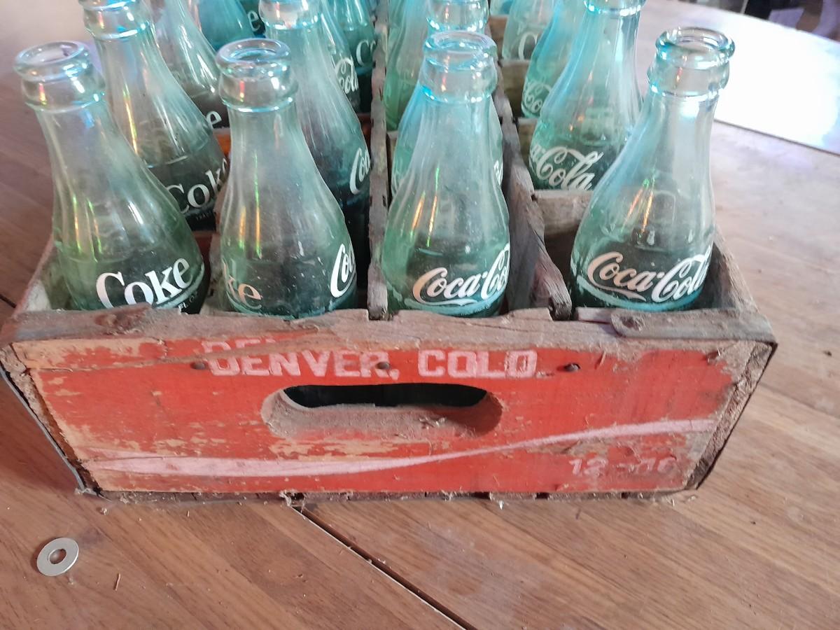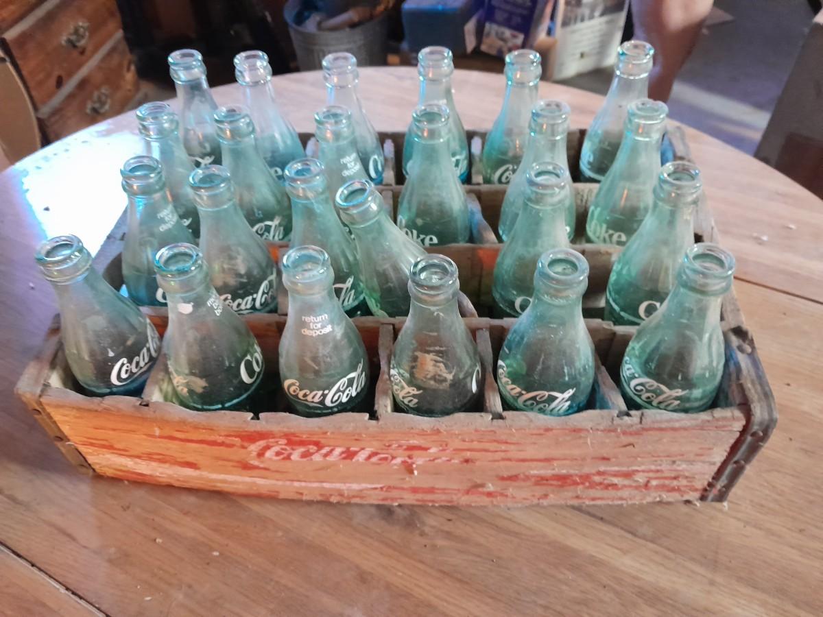 VINTAGE GLASS COKE BOTTLES IN WOODEN COCA-COLA CRATE, THE COKE BOTTLES ARE FROM DIFFERENT FACTORIES AROUND THE STATES
